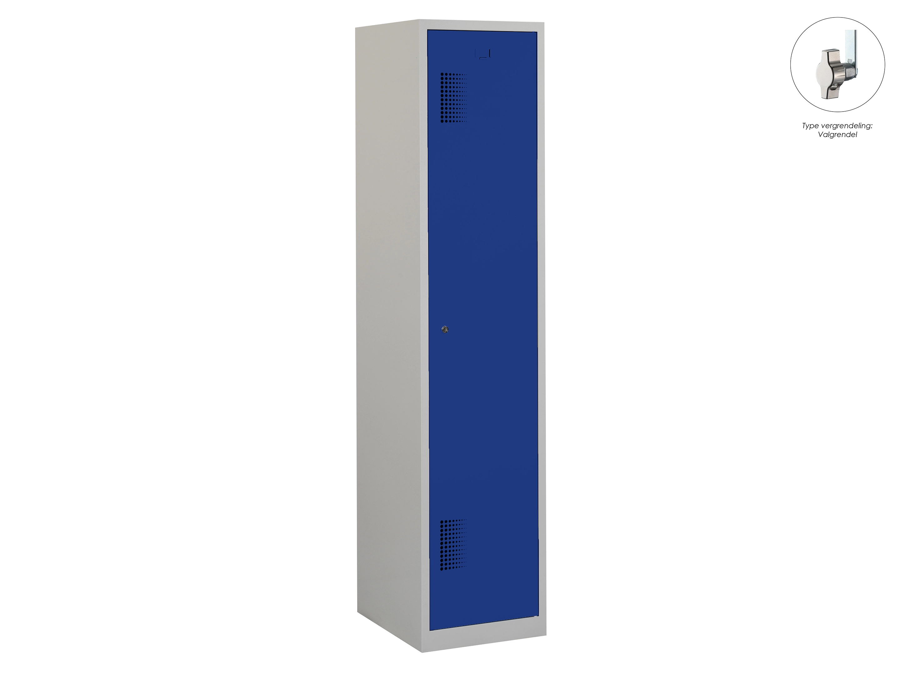 Type deuren: draaideur (geperforeerd), type slot: valgrendelslot. Kleur romp: grijs (RAL7035), kleur deuren: blauw (RAL5010). Afmeting: 180x80x50 cm (HxBxD). Indeling: Legbord & kledingroede Aantal deuren: 2, aantal sleutels: geen.