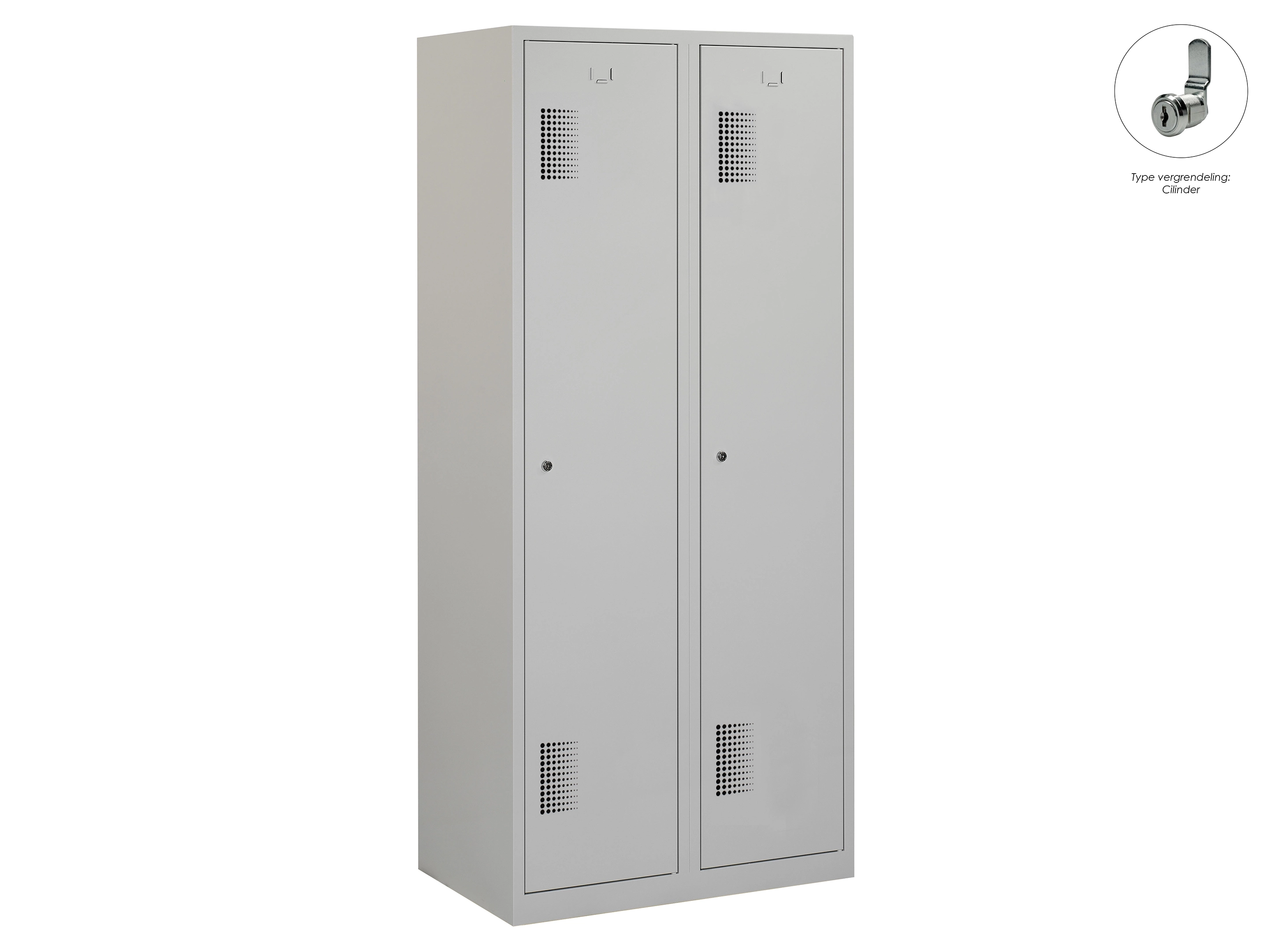 Type deuren: draaideur (geperforeerd), type slot: cilinderslot. Kleur romp: grijs (RAL7035), kleur deuren: grijs (RAL7035). Afmeting: 180x80x50 cm (HxBxD). Indeling: Legbord & kledingroede Aantal deuren: 2, aantal sleutels: 2.