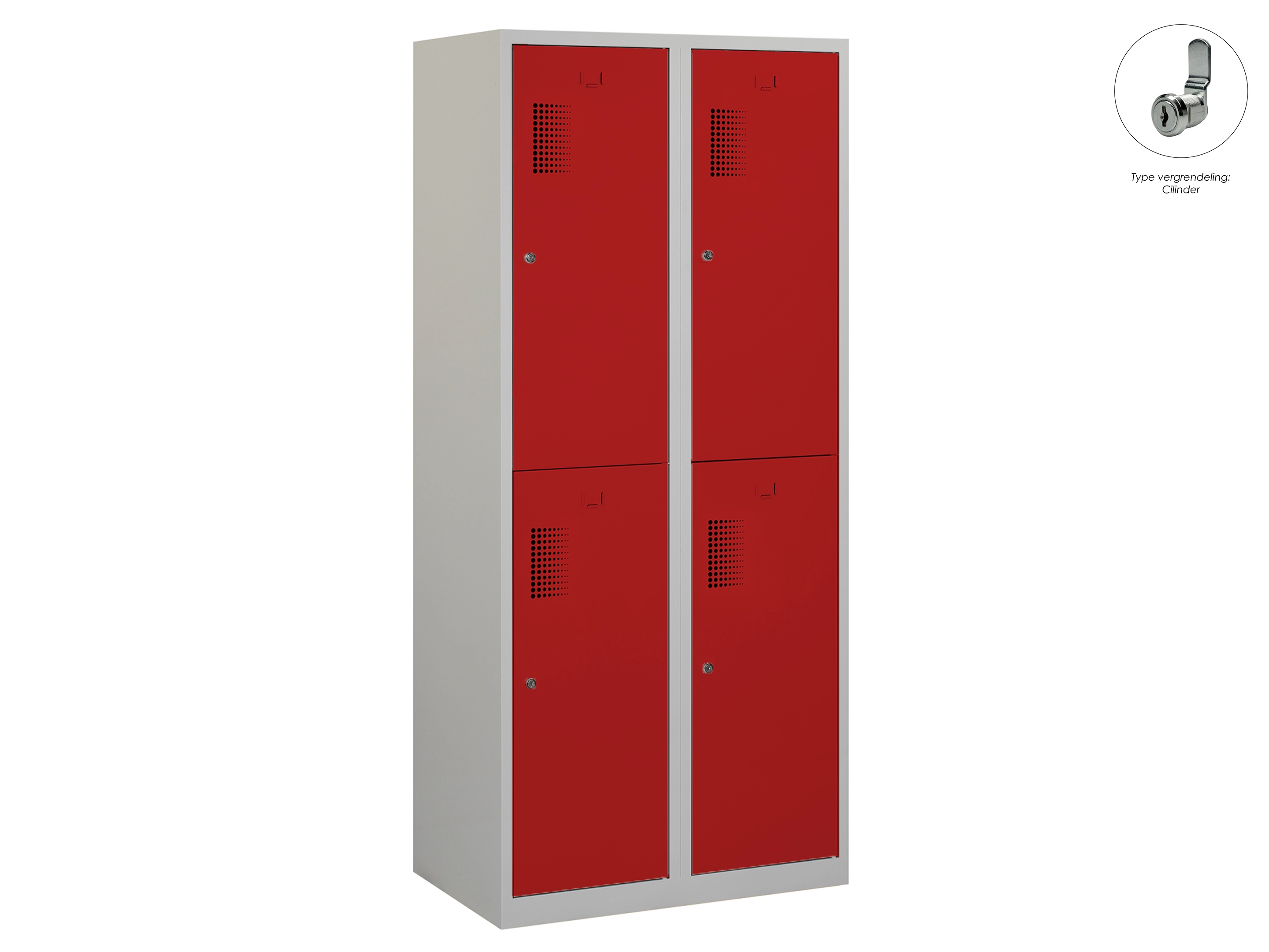 Type deuren: draaideur (geperforeerd), type slot: valgrendelslot. Kleur romp: grijs (RAL7035), kleur deuren: rood (RAL3000). Afmeting: 180x80x50 cm (HxBxD). Indeling: Kledingroede Aantal deuren: 4, aantal sleutels: geen.