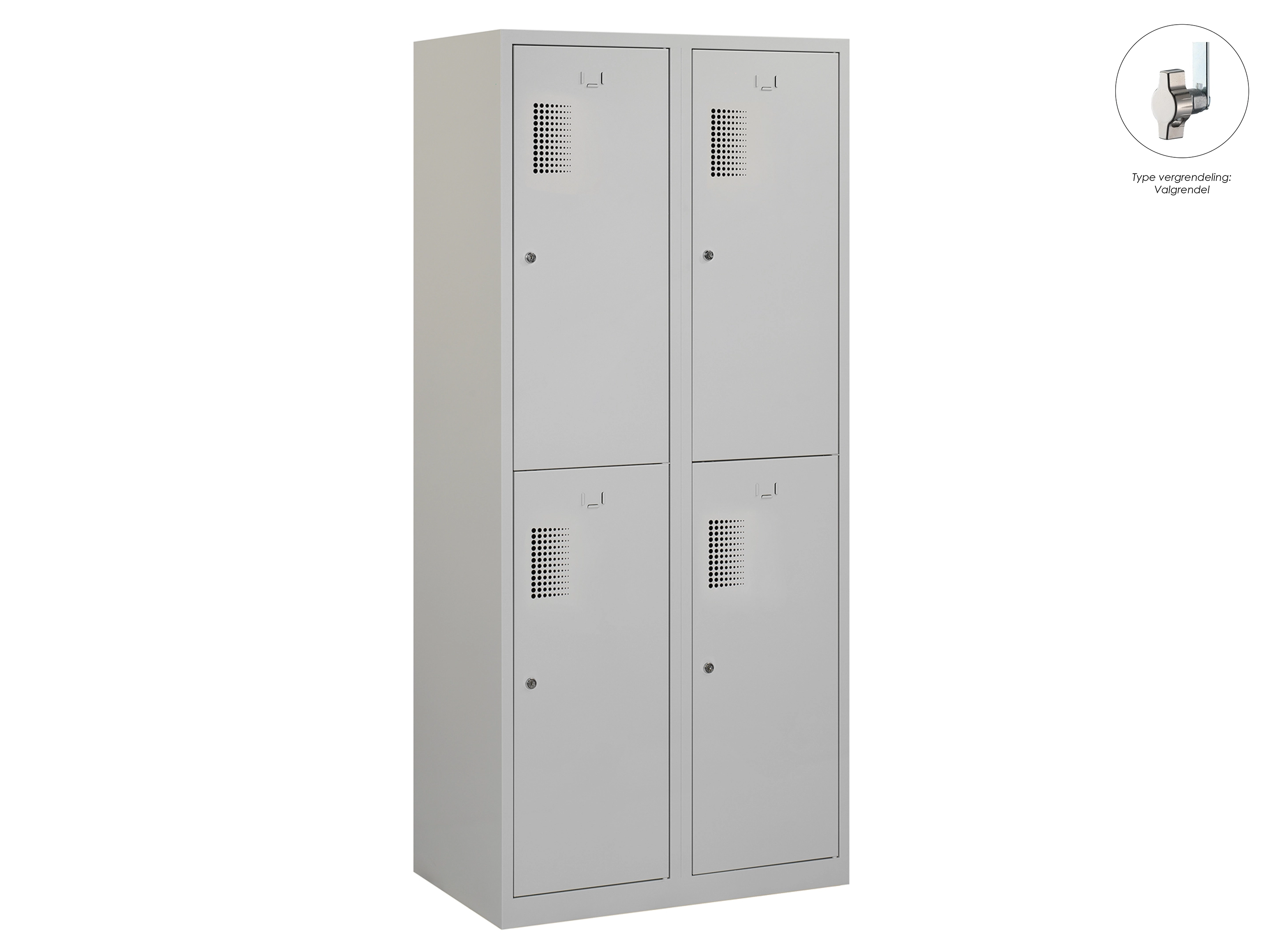 Type deuren: draaideur (geperforeerd), type slot: valgrendelslot. Kleur romp: grijs (RAL7035), kleur deuren: grijs (RAL7035). Afmeting: 180x80x50 cm (HxBxD). Indeling: Kledingroede Aantal deuren: 4, aantal sleutels: geen.
