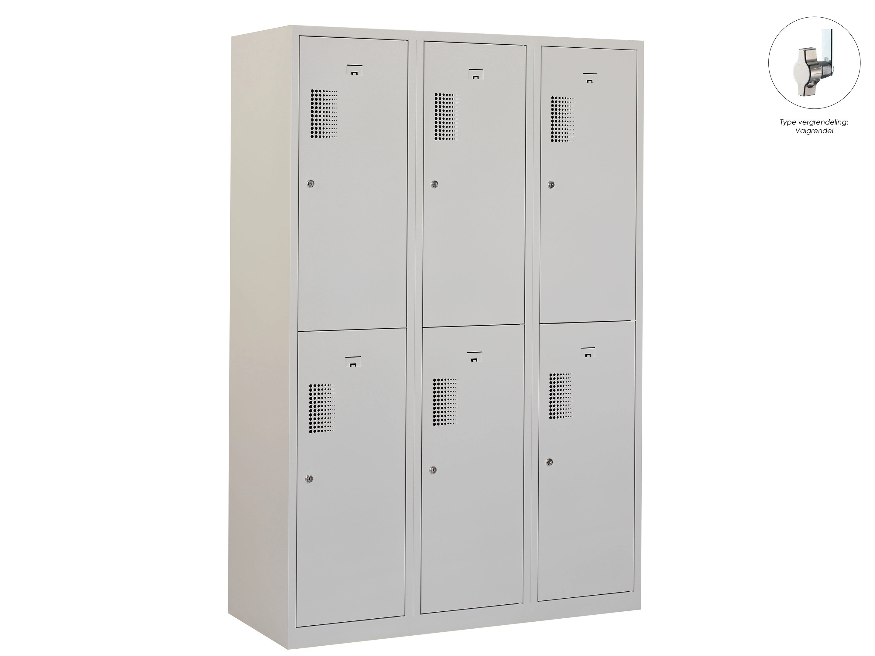Type deuren: draaideur (geperforeerd), type slot: valgrendelslot. Kleur romp: grijs (RAL7035), kleur deuren: grijs (RAL7035). Afmeting: 180x120x50 cm (HxBxD). Indeling: Kledingroede Aantal deuren: 6, aantal sleutels: geen.