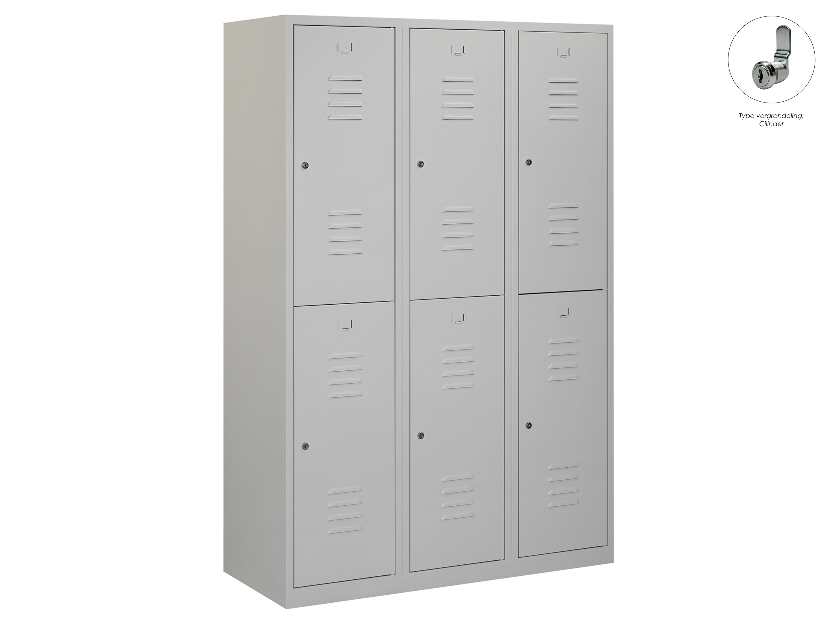 Type deuren: draaideur (ventilatiesleuven), type slot: cilinderslot. Kleur romp: grijs (RAL7035), kleur deuren: grijs (RAL7035). Afmeting: 180x90x50 cm (HxBxD). Indeling: Kledingroede Aantal deuren: 6, aantal sleutels: 2.