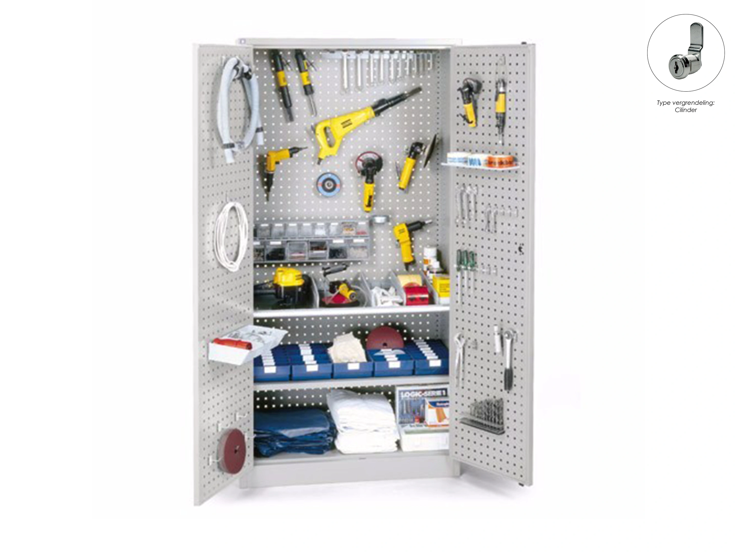 Gereedschap panelenkast met gelaste stalen constructie kleur romp: Grijs (RAL7035), kleur deuren: Grijs (RAL7035) voorzien van cilinderslot met verzonken handgreep Belasting per legbord: Max. 100 kg