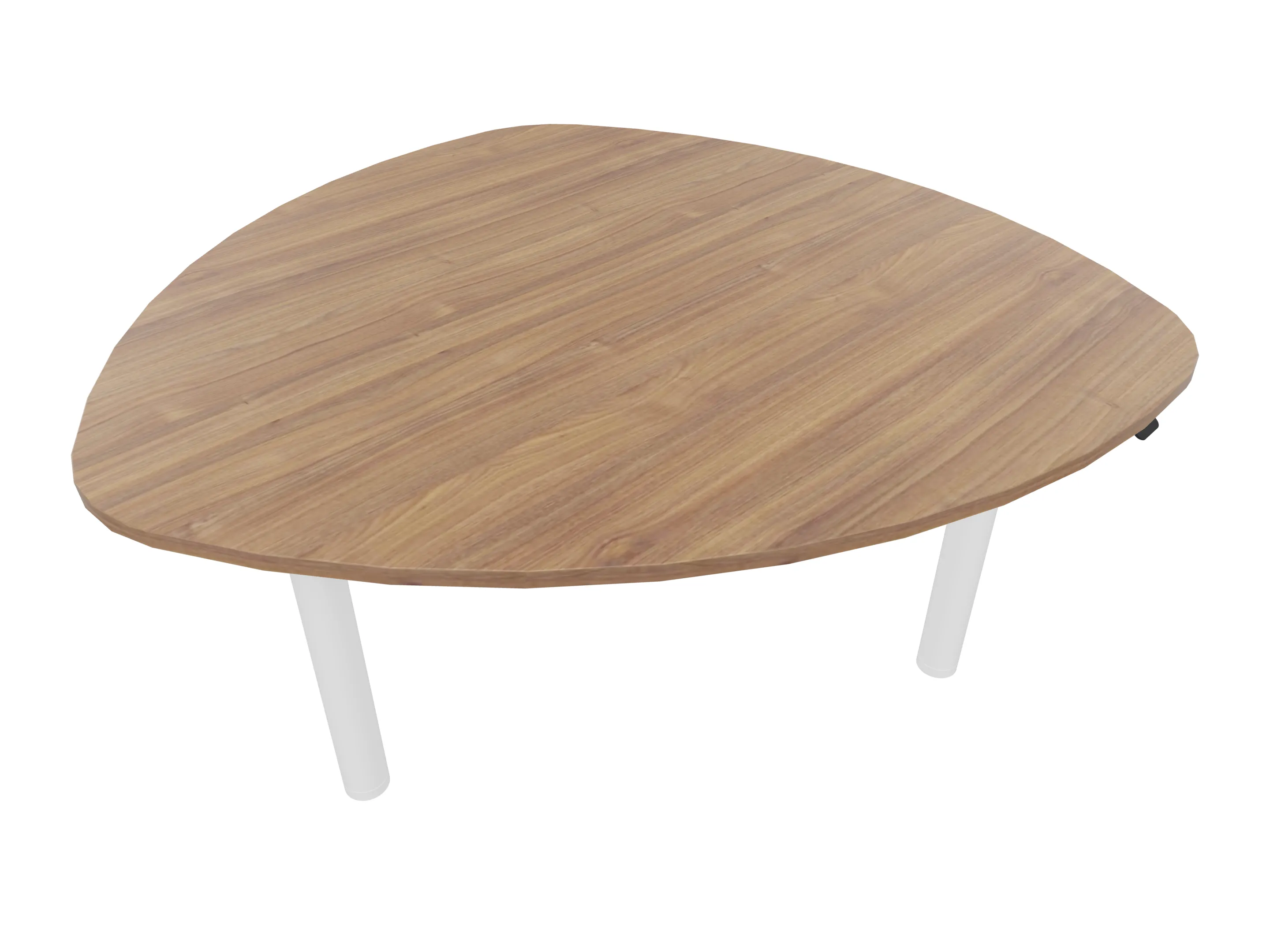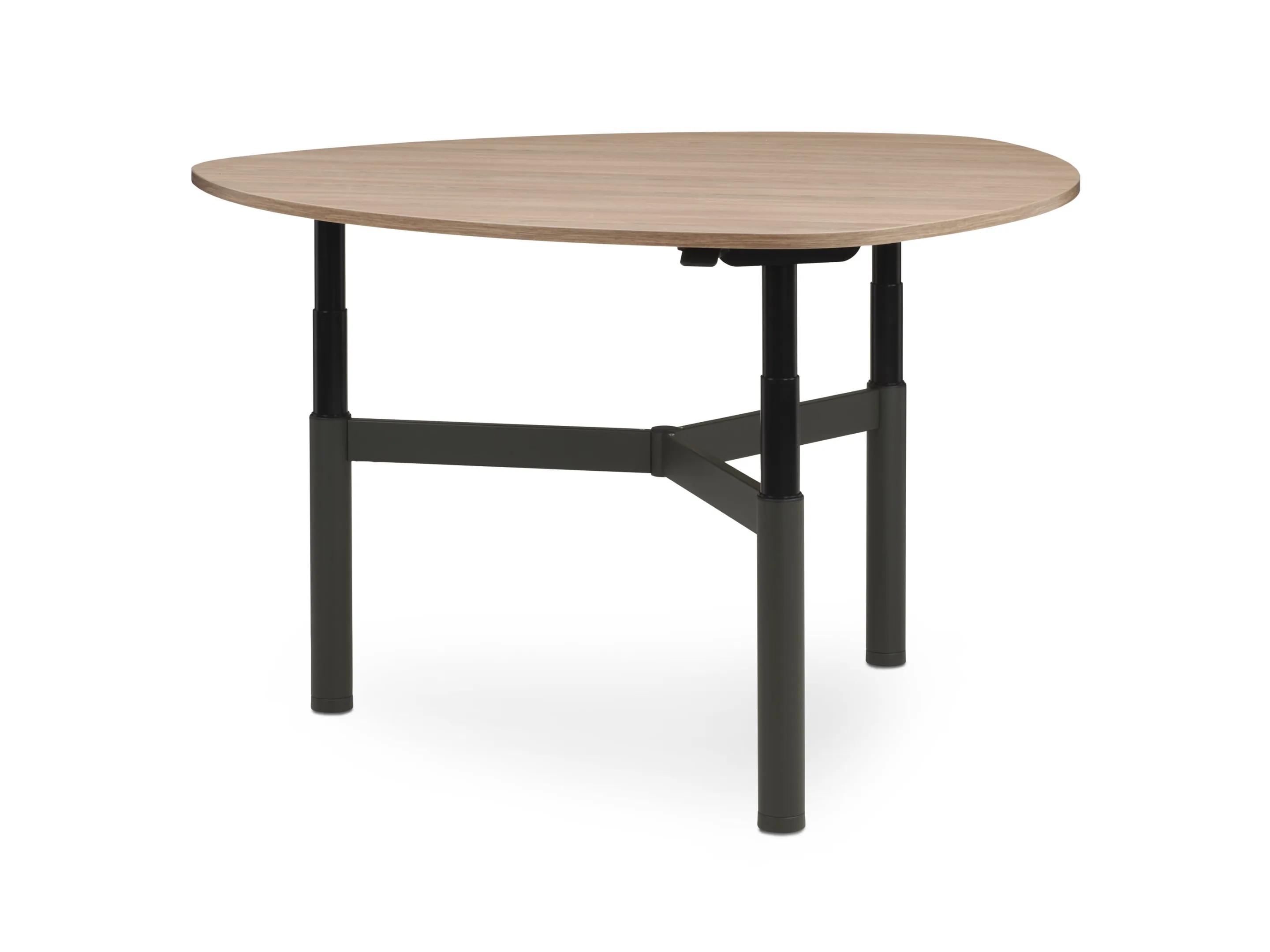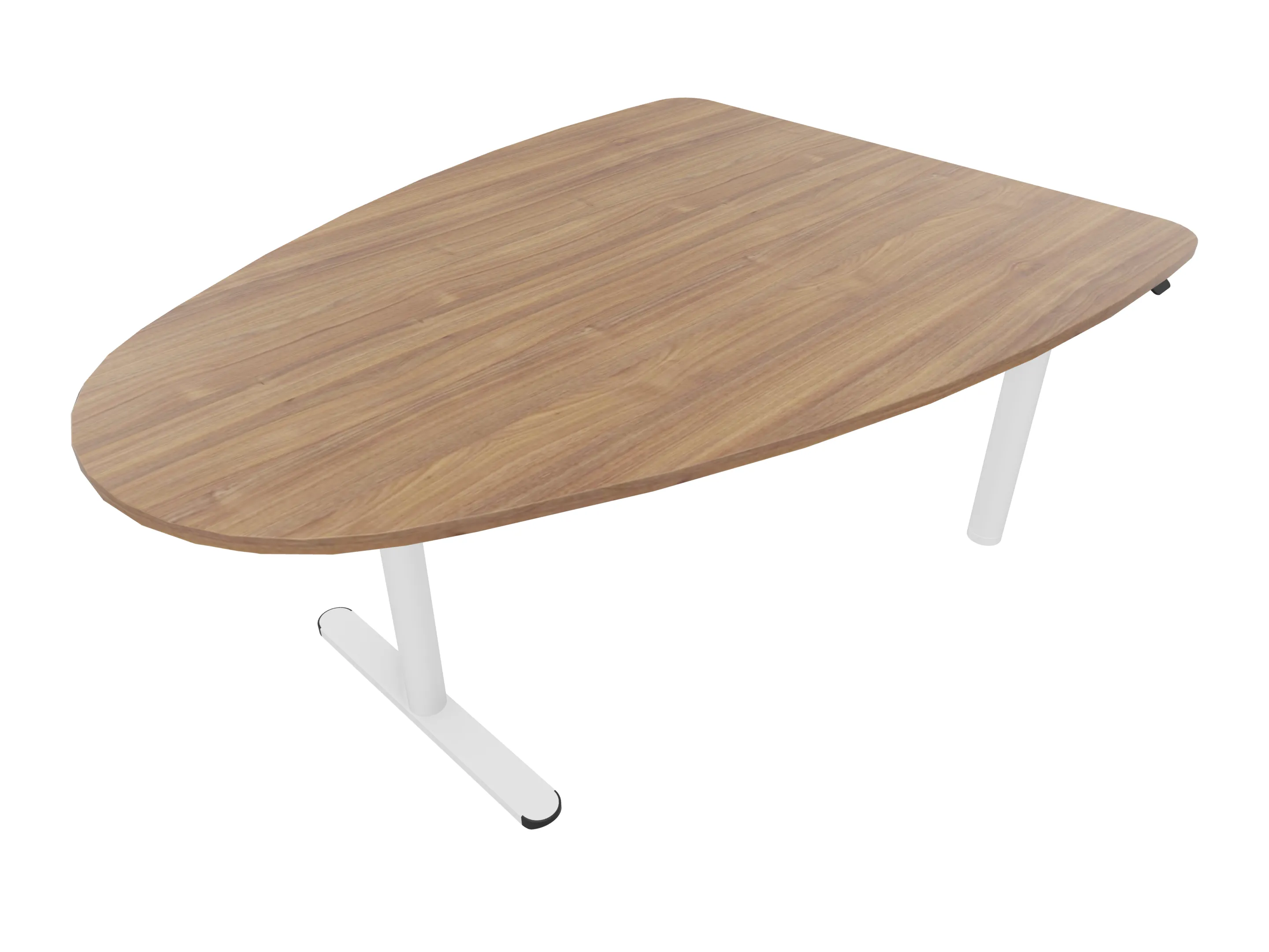 Vergadertafel, elektrisch verstelbaar tussen 650-1300mm. Compleet met trigoonvormig blad van 1600 x 1580mm met 3x 200mm teruggeplaatste poten met gekruiste steunbalken.