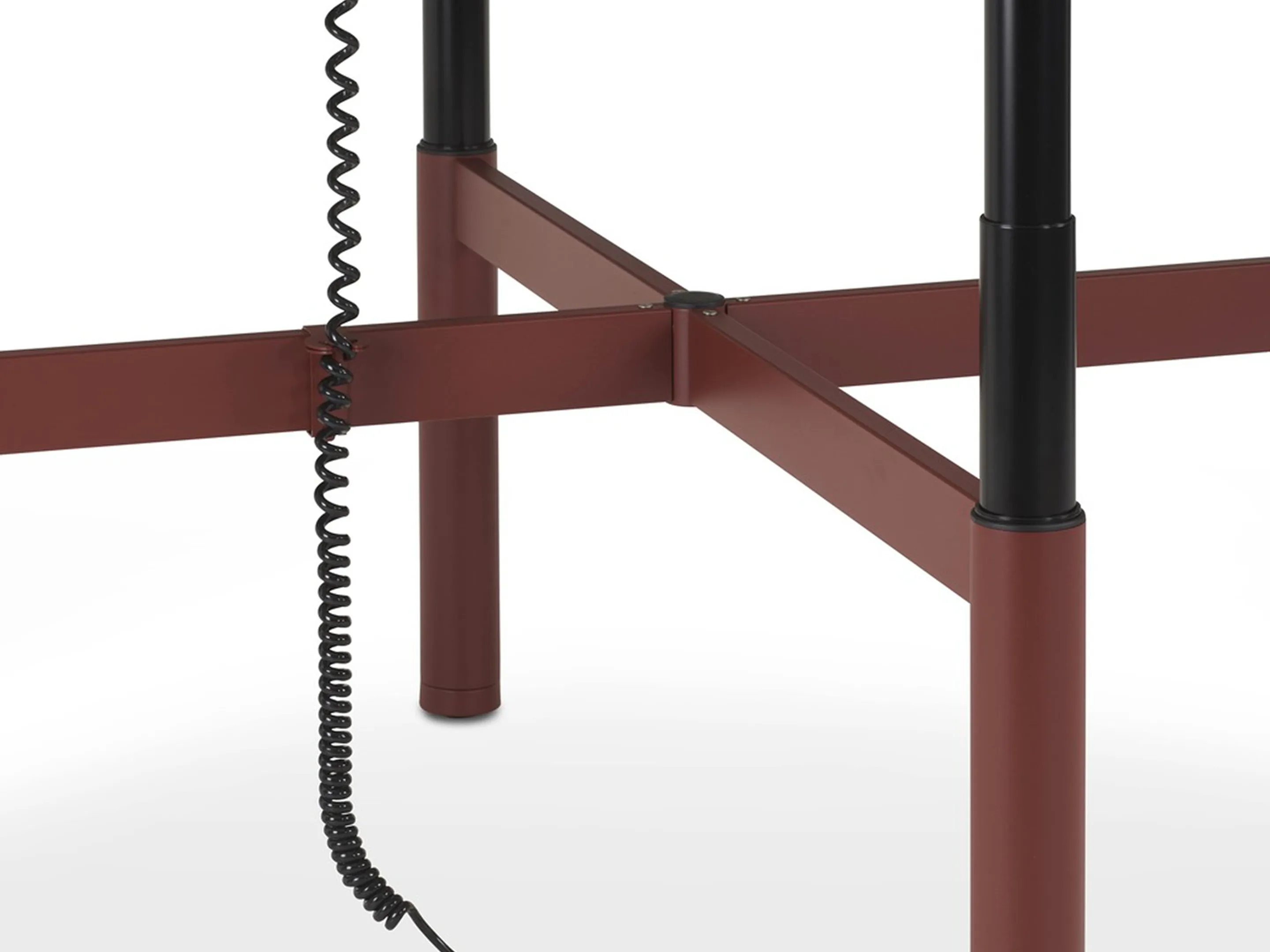 Vergadertafel, elektrisch verstelbaar tussen 650-1300mm. Compleet met vierkant blad van 1600 x 1600mm (B x D) met 4x 250mm teruggeplaatste poten met gekruiste steunbalken.