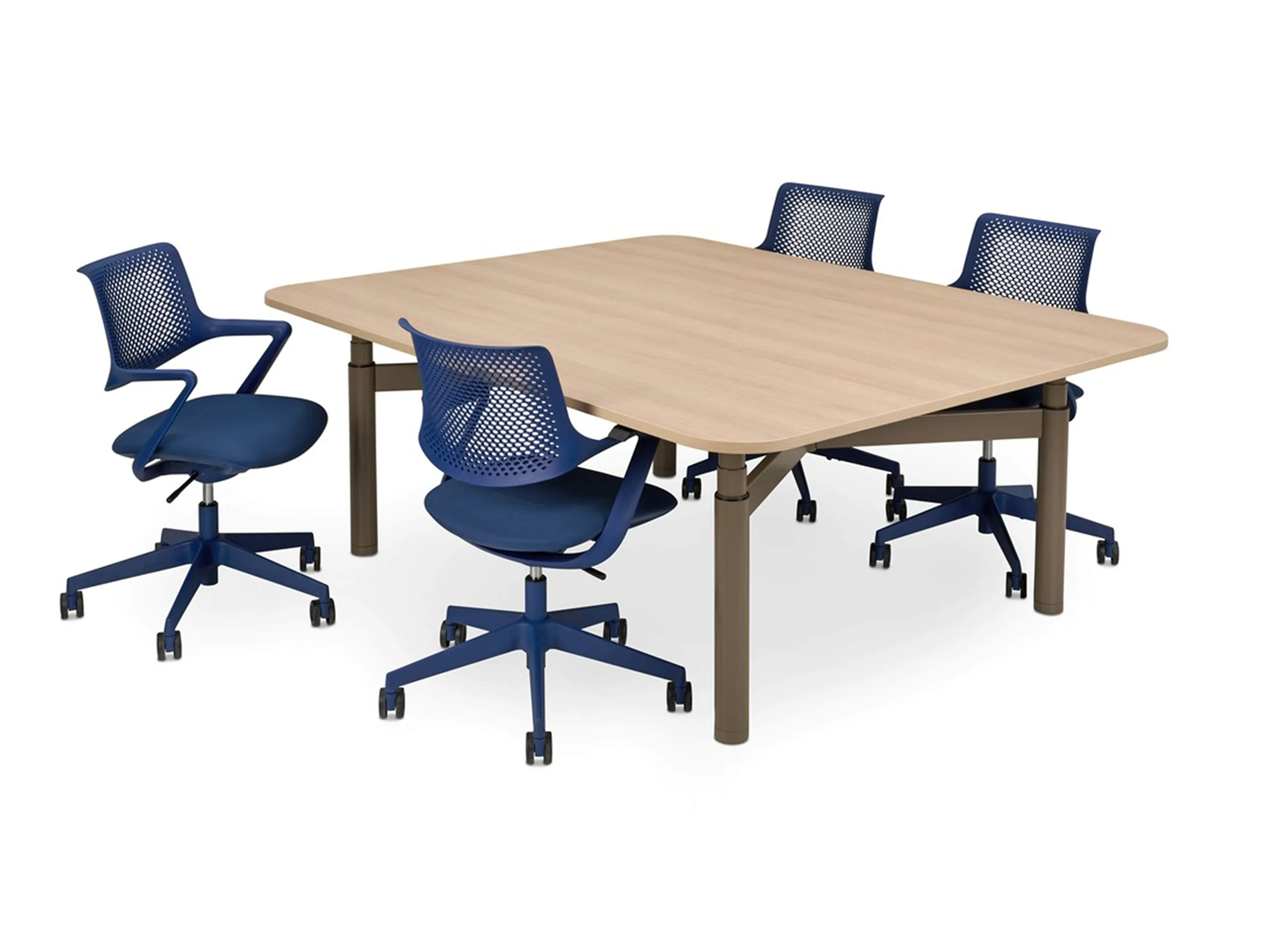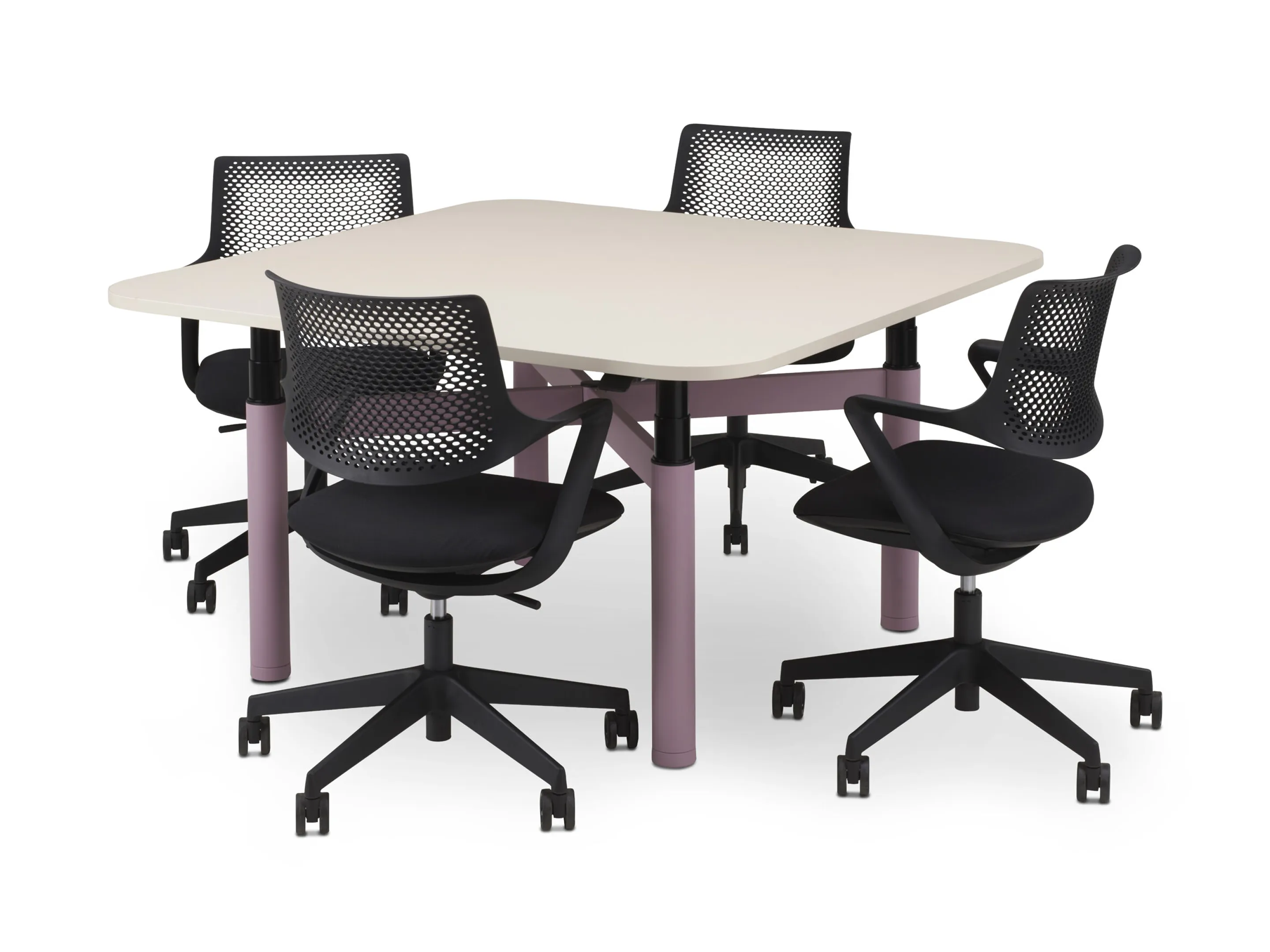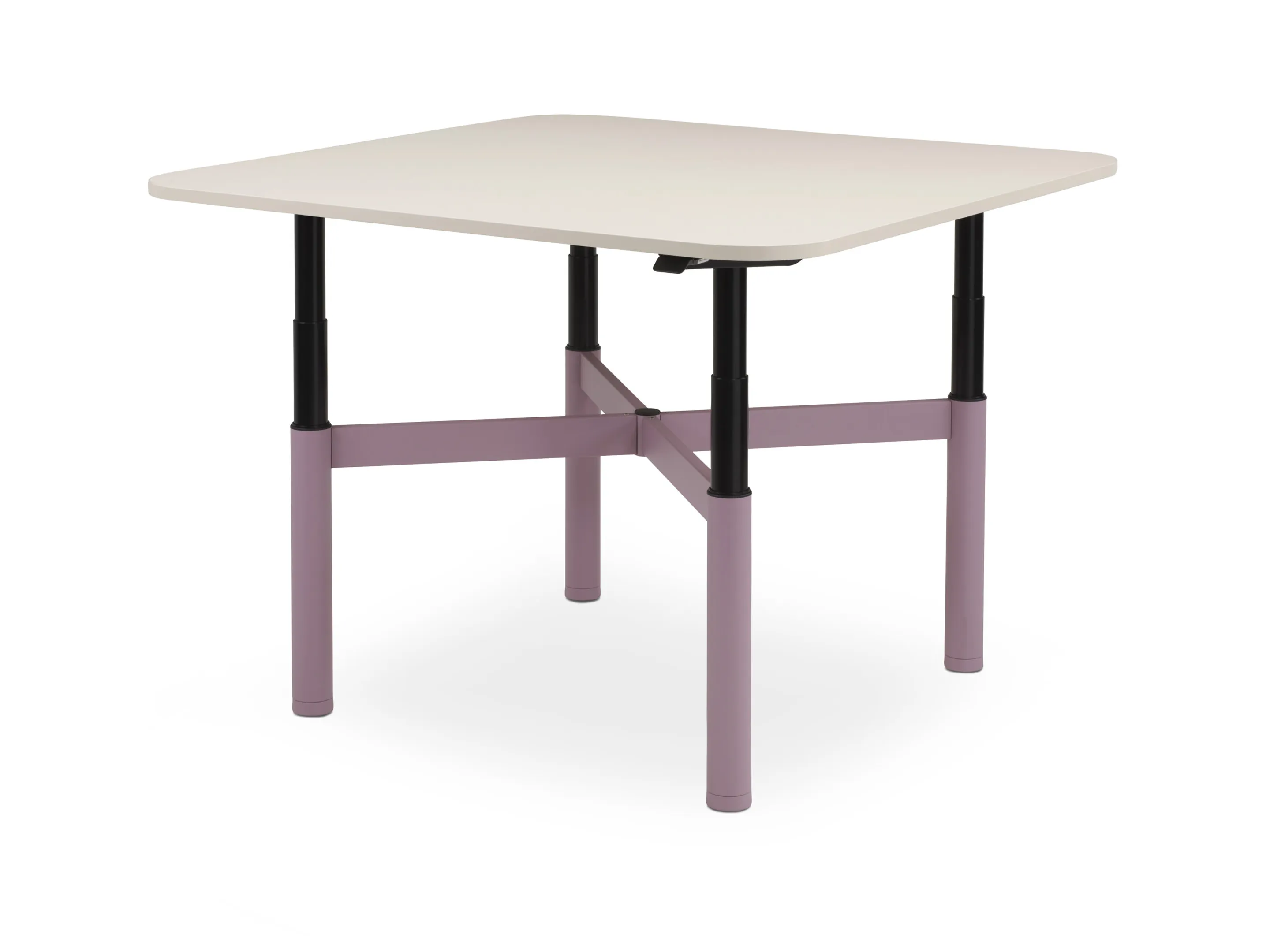 Vergadertafel, elektrisch verstelbaar tussen 650-1300mm. Compleet met vierkant blad van 1400 x 1400mm (B x D) met 4x 250mm teruggeplaatste poten met gekruiste steunbalken.