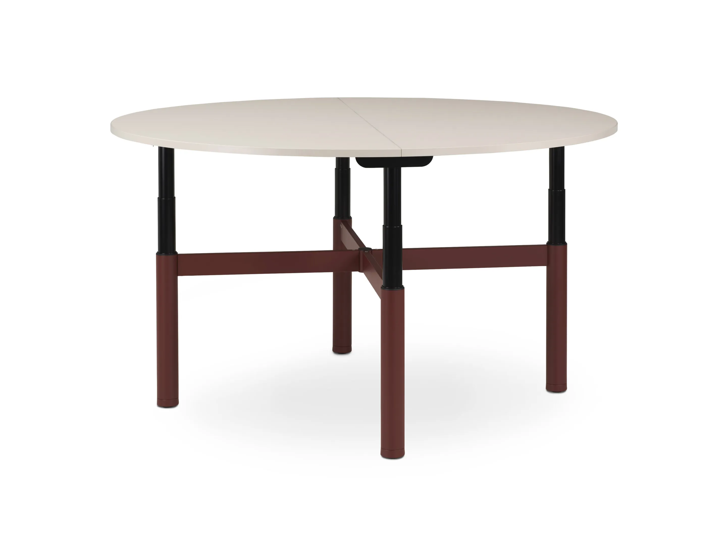 Vergadertafel, elektrisch verstelbaar tussen 650-1300mm. Compleet met rond blad met Ø 1800mm met 4x 150mm teruggeplaatste poten met gekruiste steunbalken.