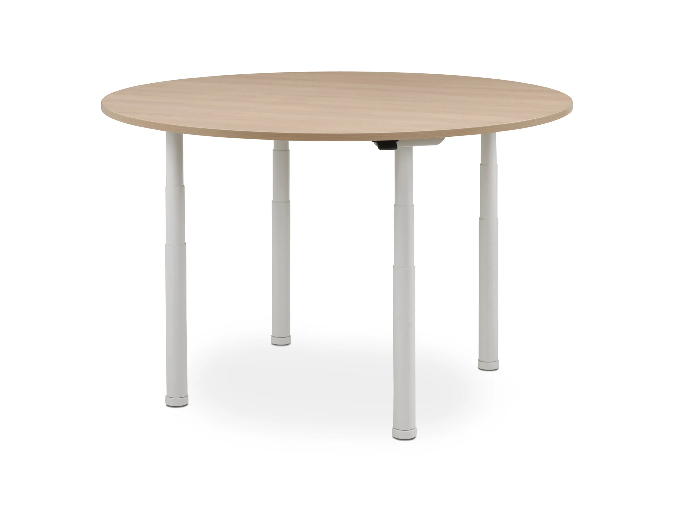 Vergadertafel, elektrisch verstelbaar tussen 650-1300mm. Compleet met rond blad met Ø 1600mm met 4x 200mm teruggeplaatste poten.