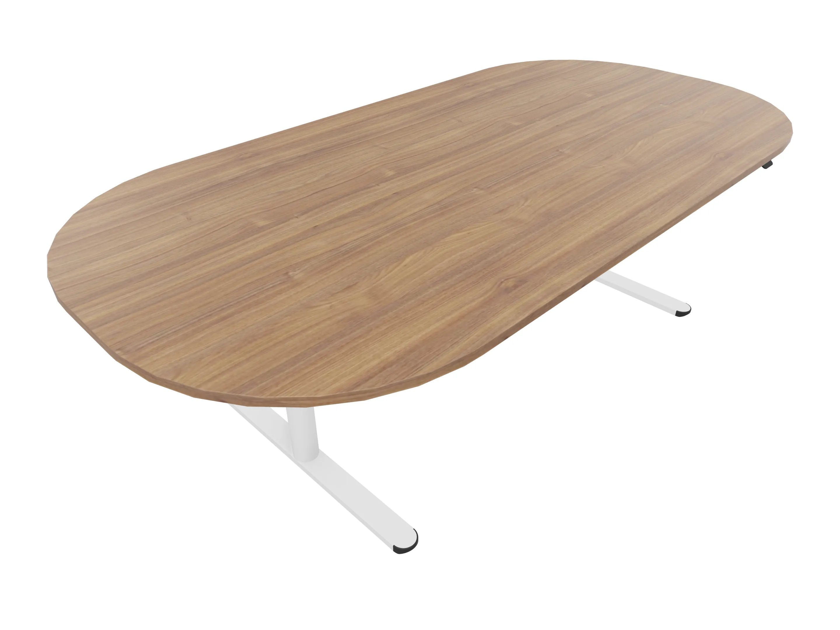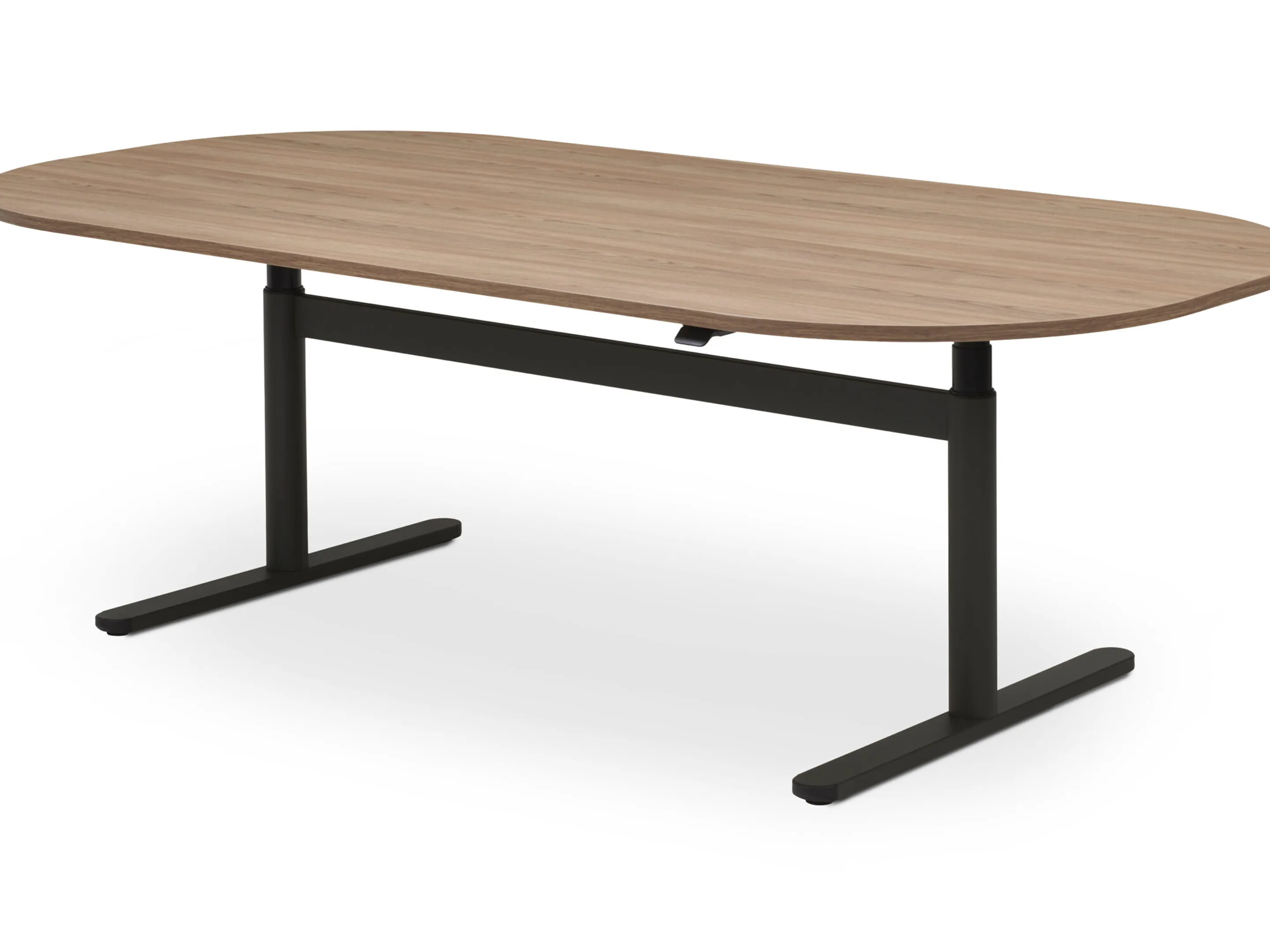 Vergadertafel, elektrisch verstelbaar tussen 650-1300mm. Compleet met ovaalvormig blad van 2400 x 1200mm met 2x 400mm teruggeplaatste T-poten met een steunbalk.