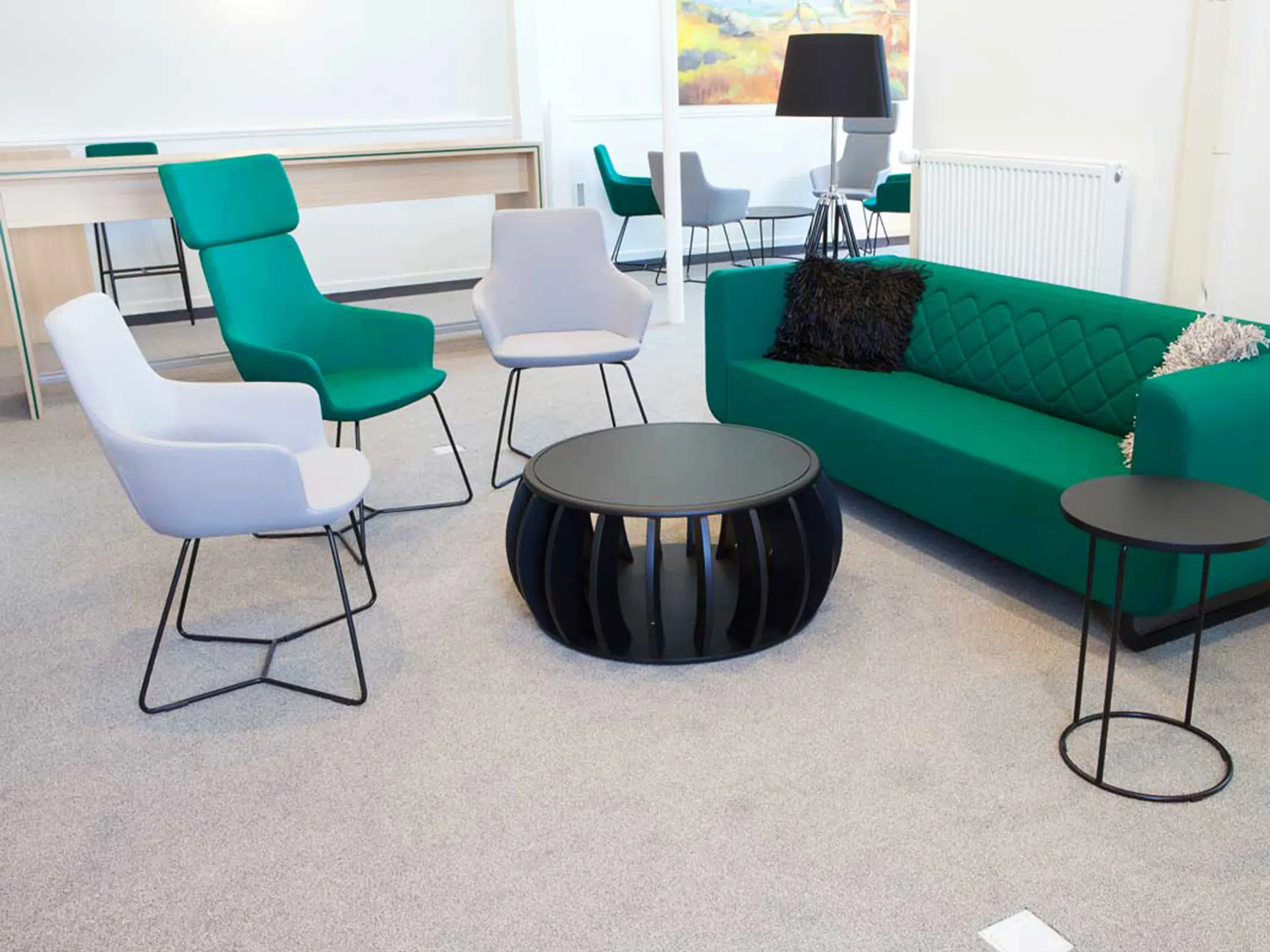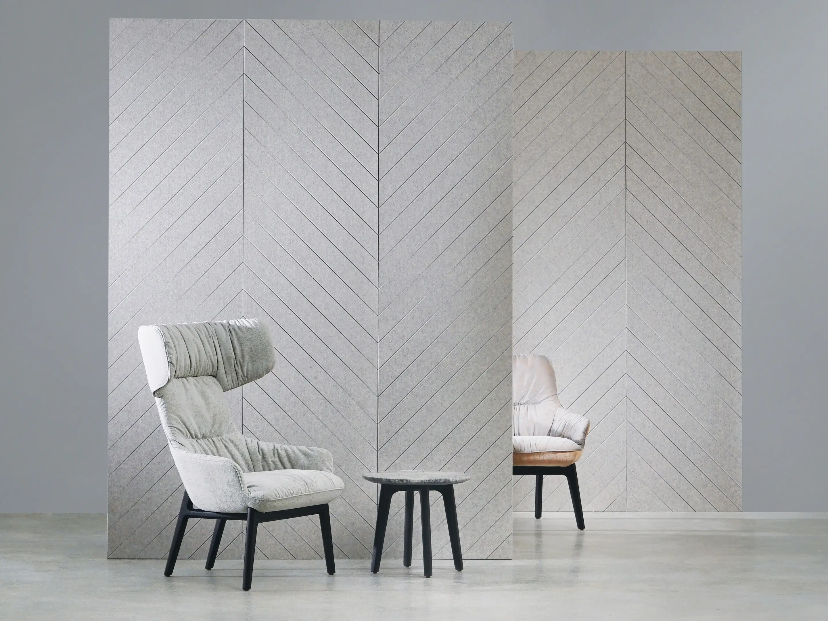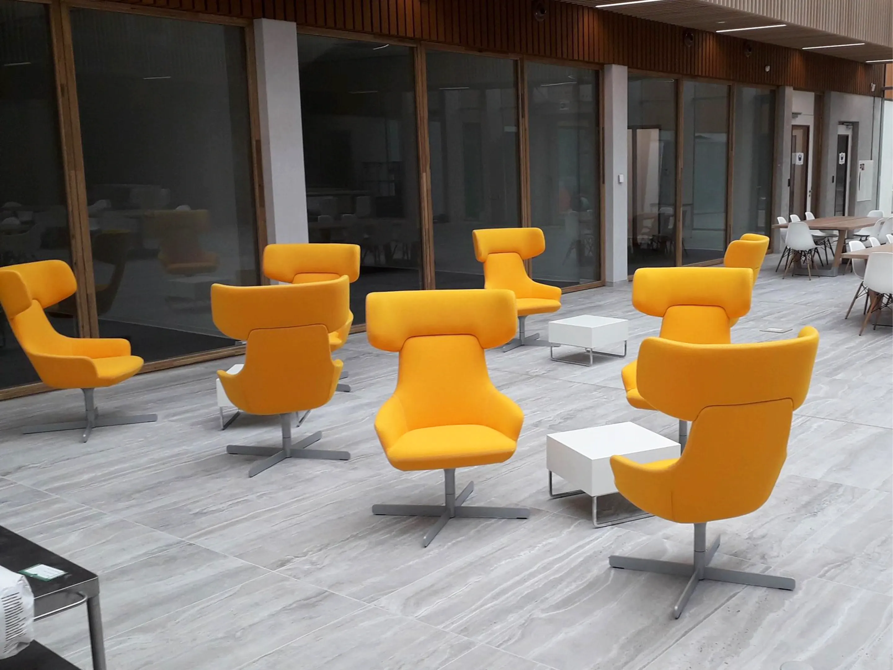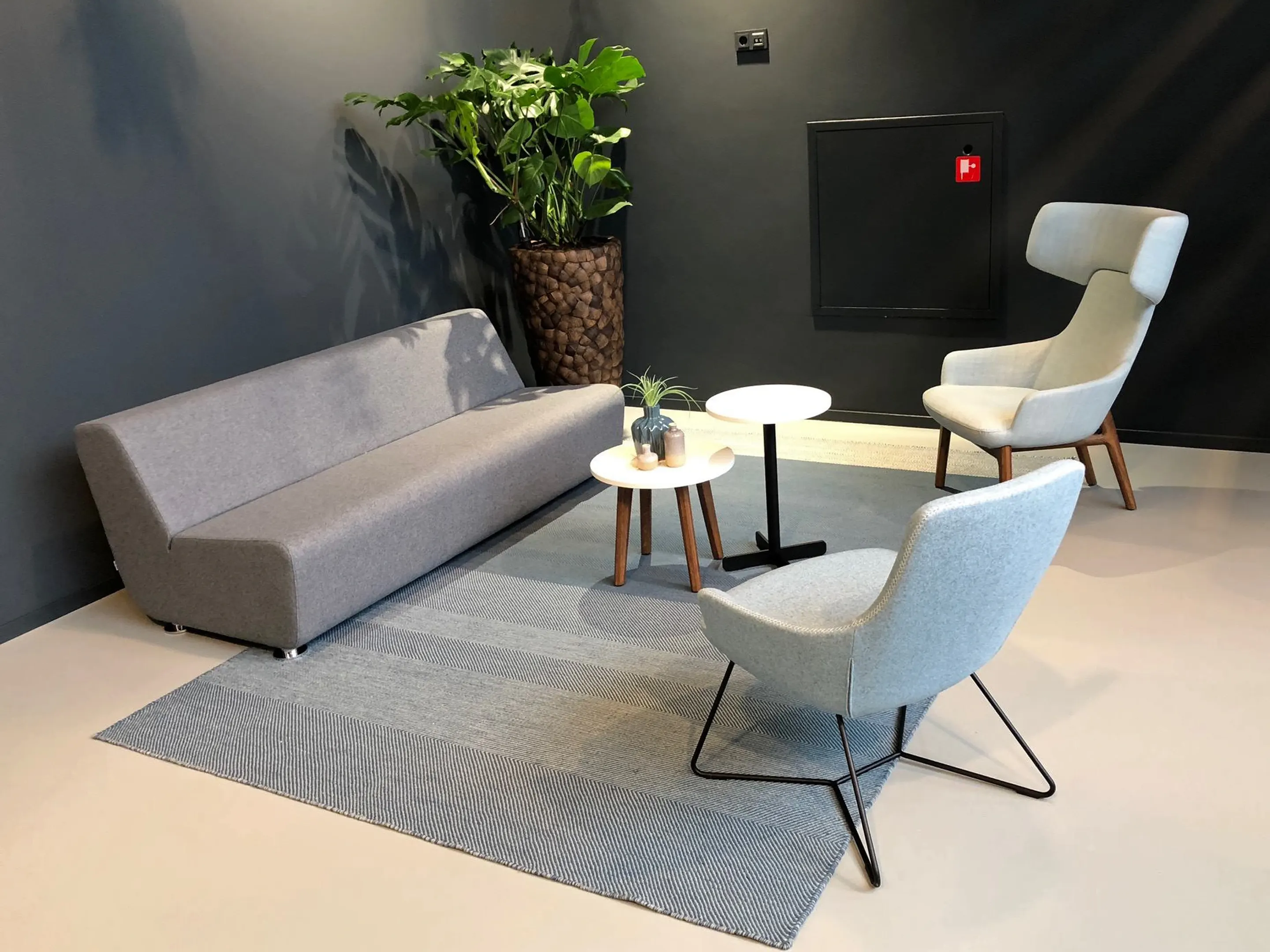 Volledig gestoffeerde oorfauteuil met hoofdsteun (privacy oren) op een draadframe.