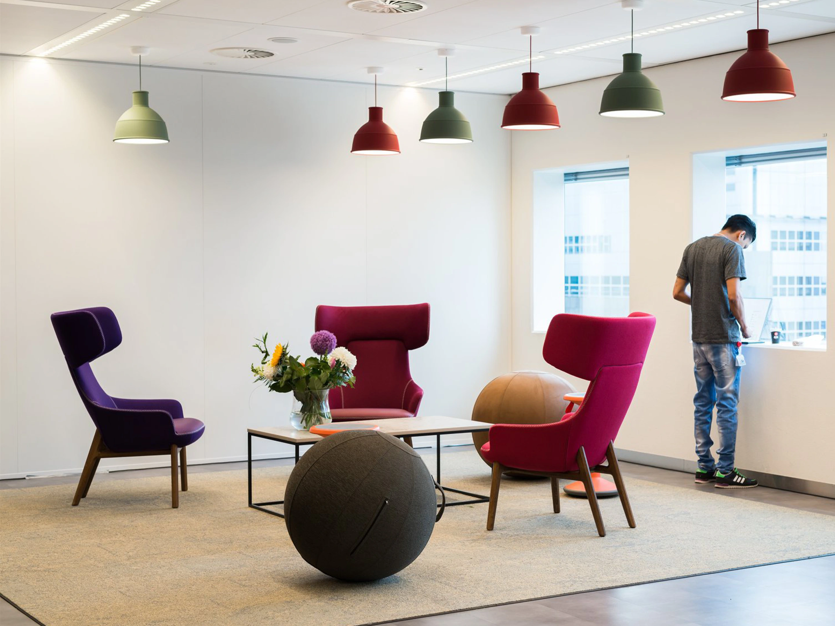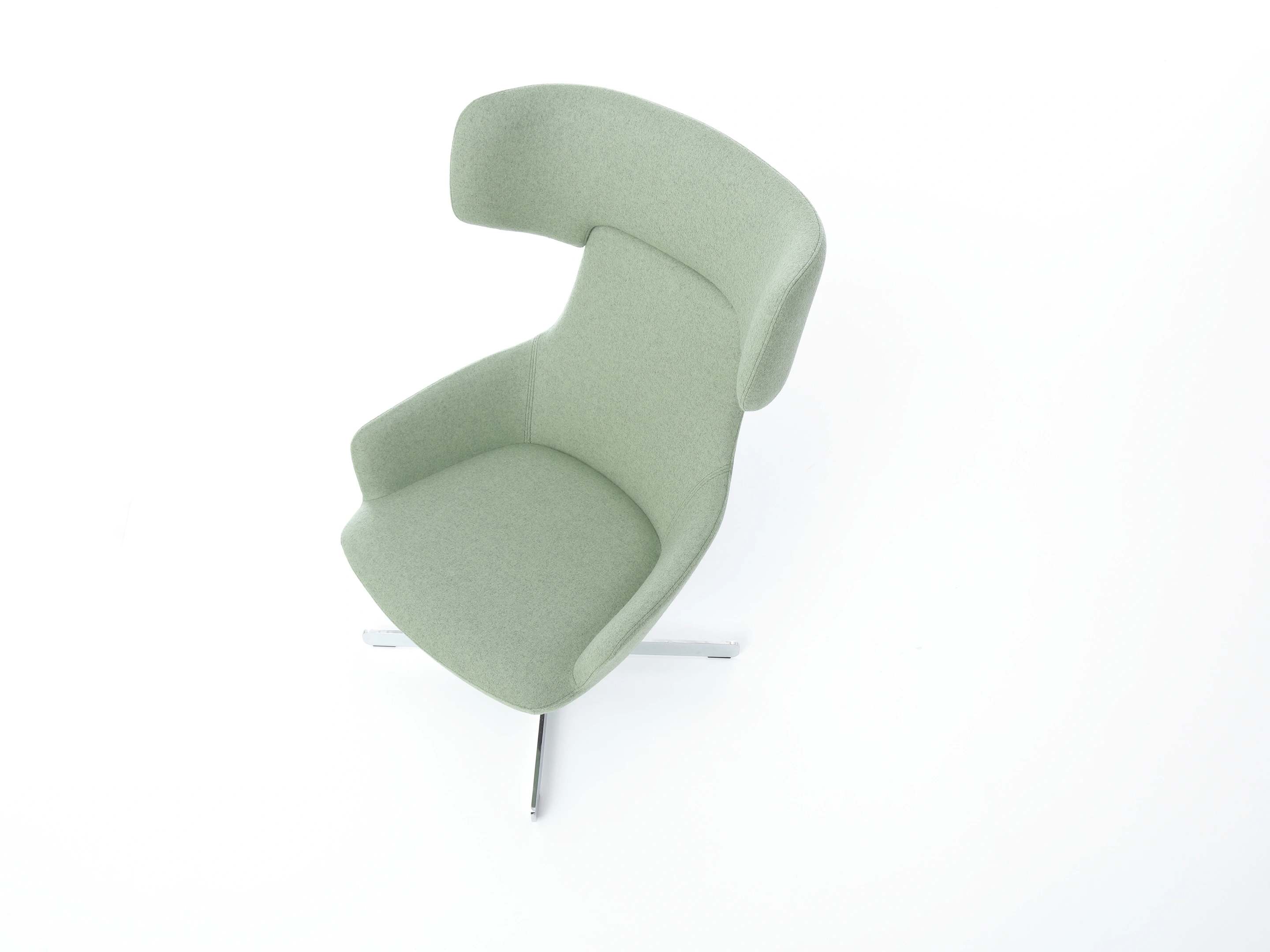 Volledig gestoffeerde oorfauteuil met hoofdsteun (privacy oren) op een draaibaar kruisvoet