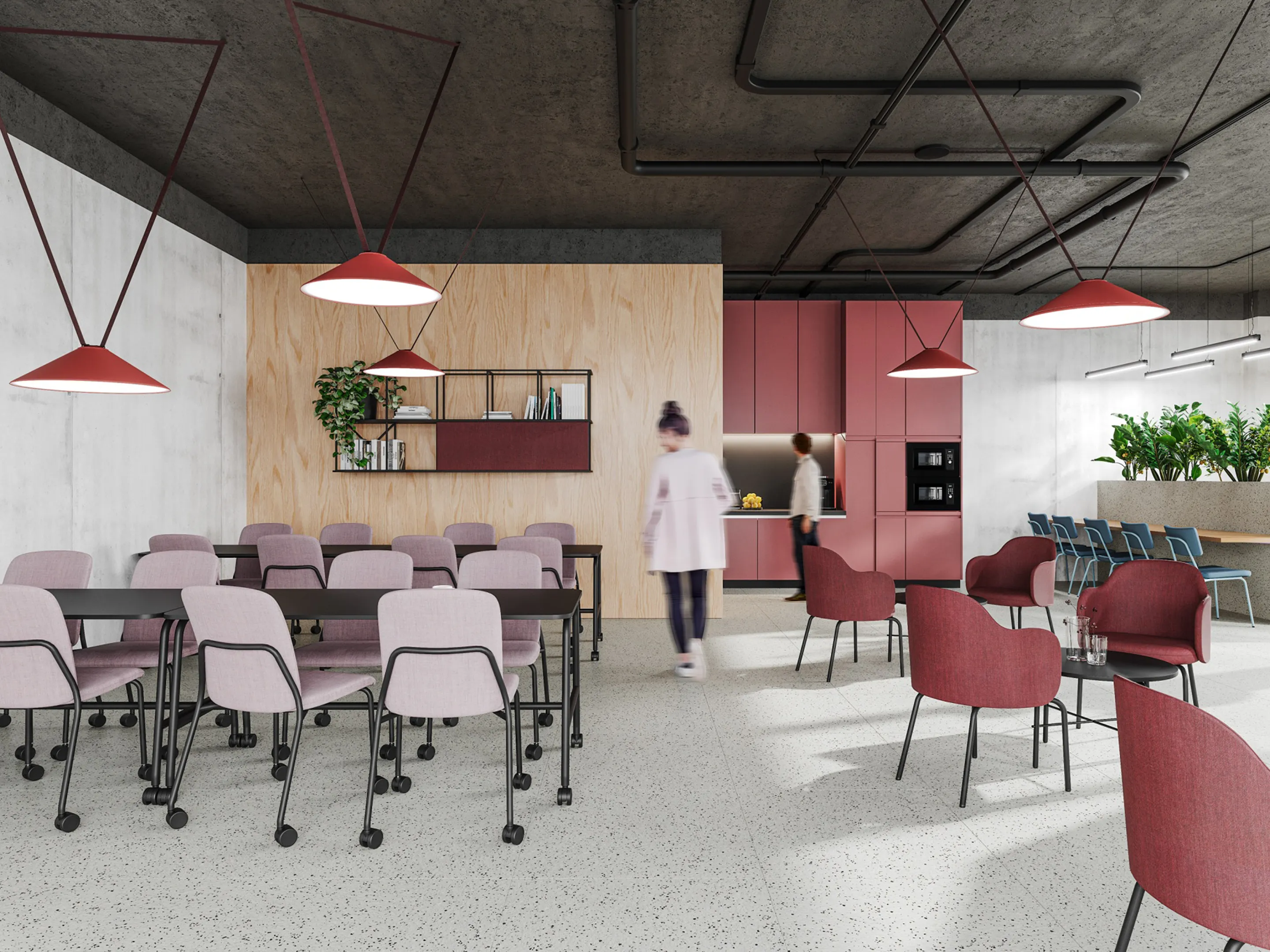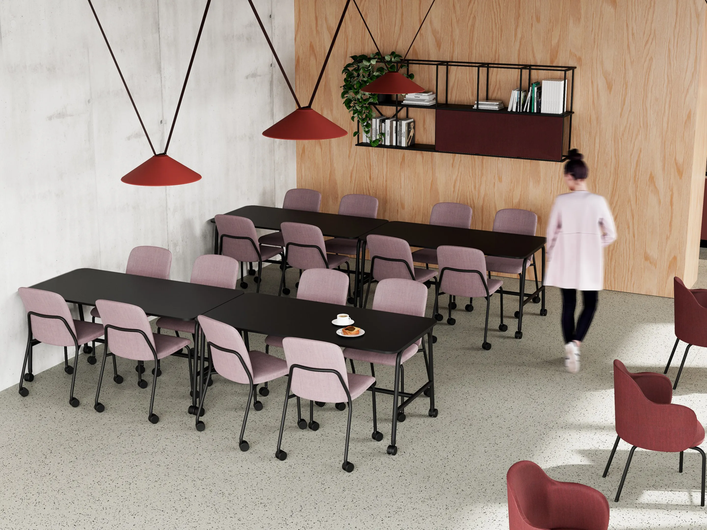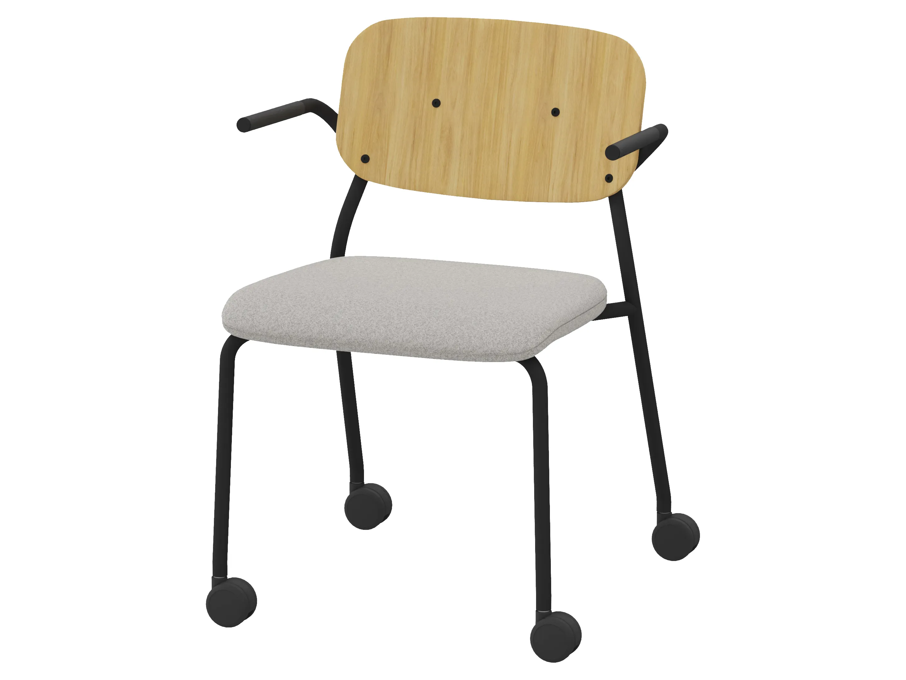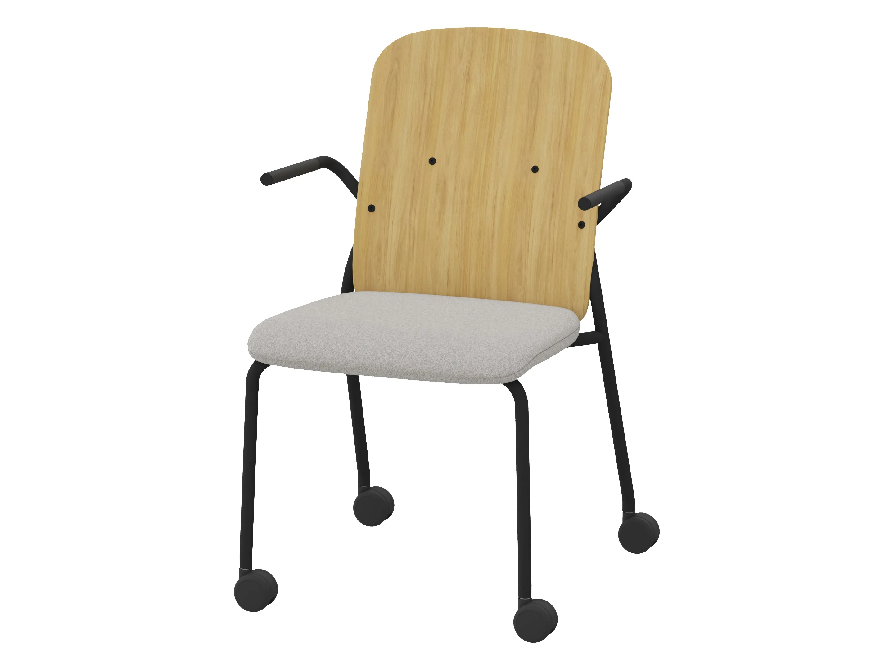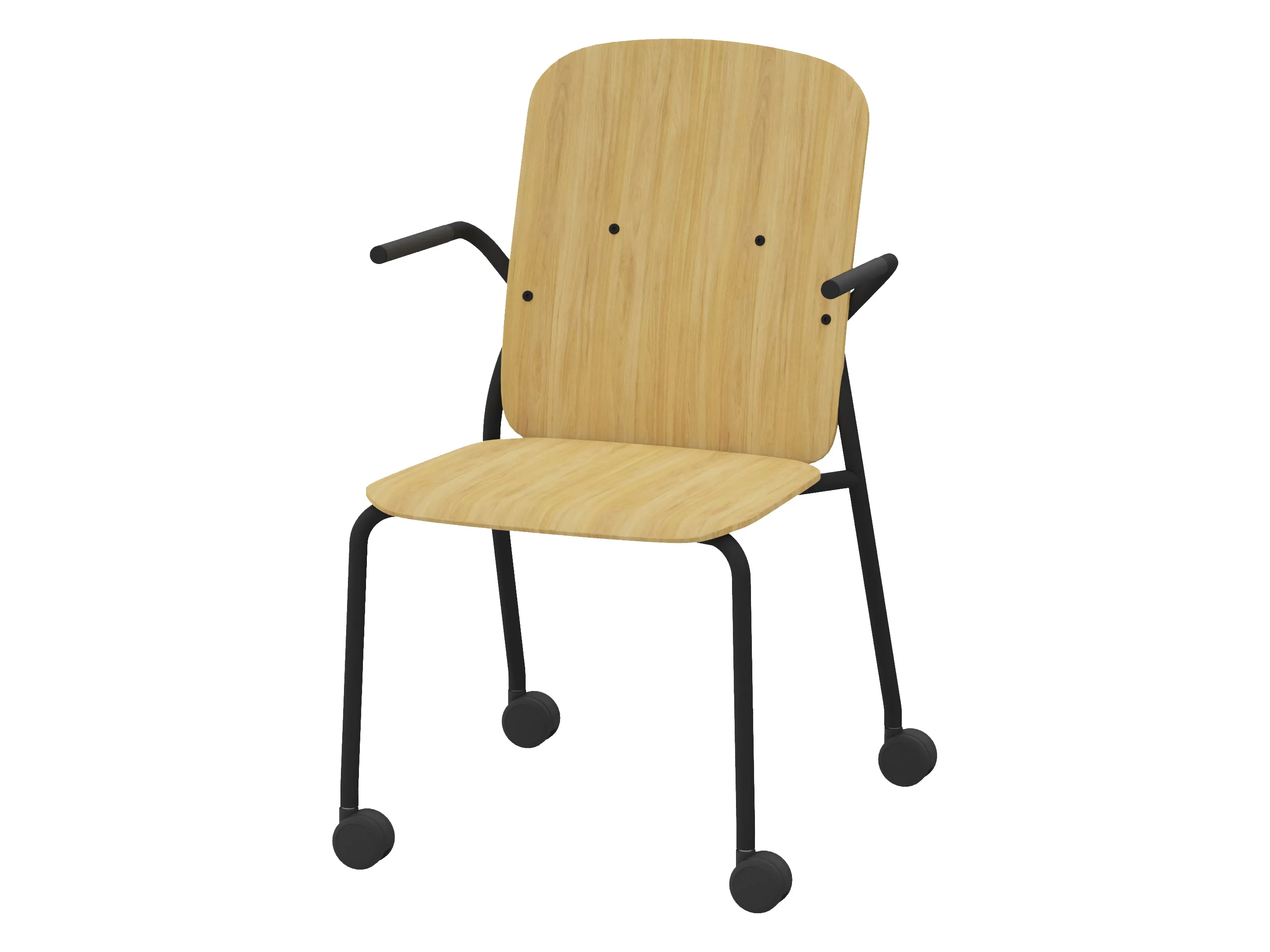 Bijzetstoel met een korte fineer rug en gestoffeerde zitting op een 4-poots frame op wielen. Met armleuningen. Stapelbaar tot 4 stuks. Afmeting: 570 x 590 x 800mm (B x D x H). Zithoogte 470mm.