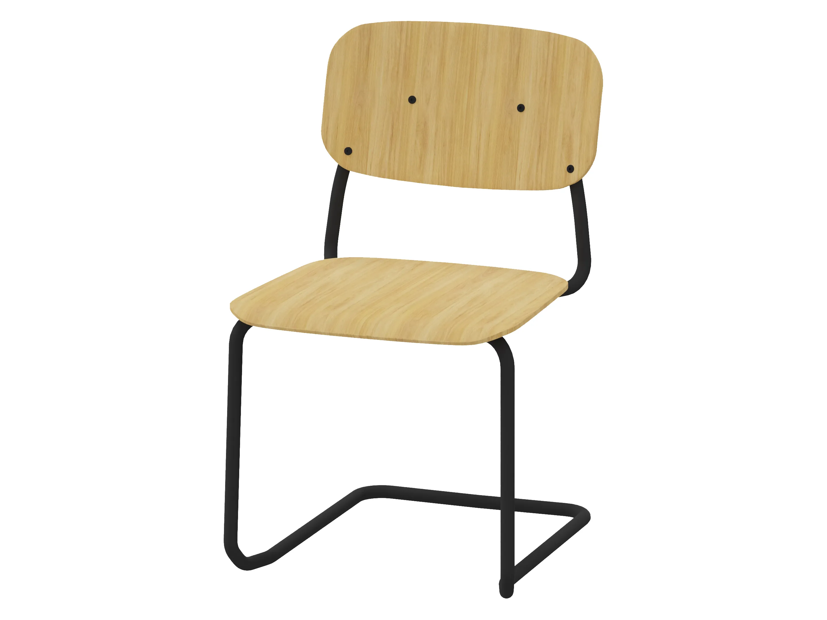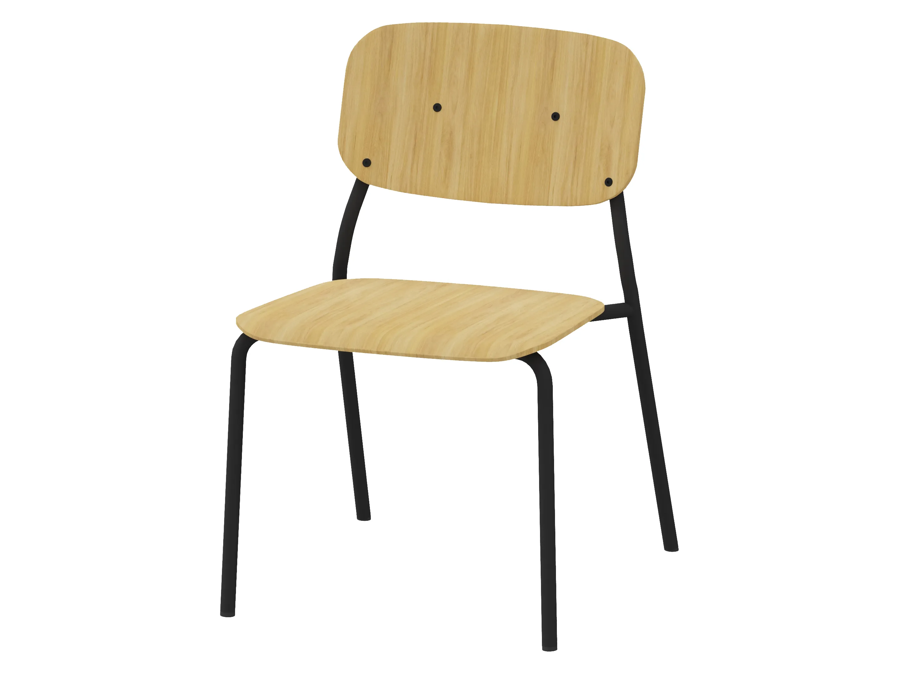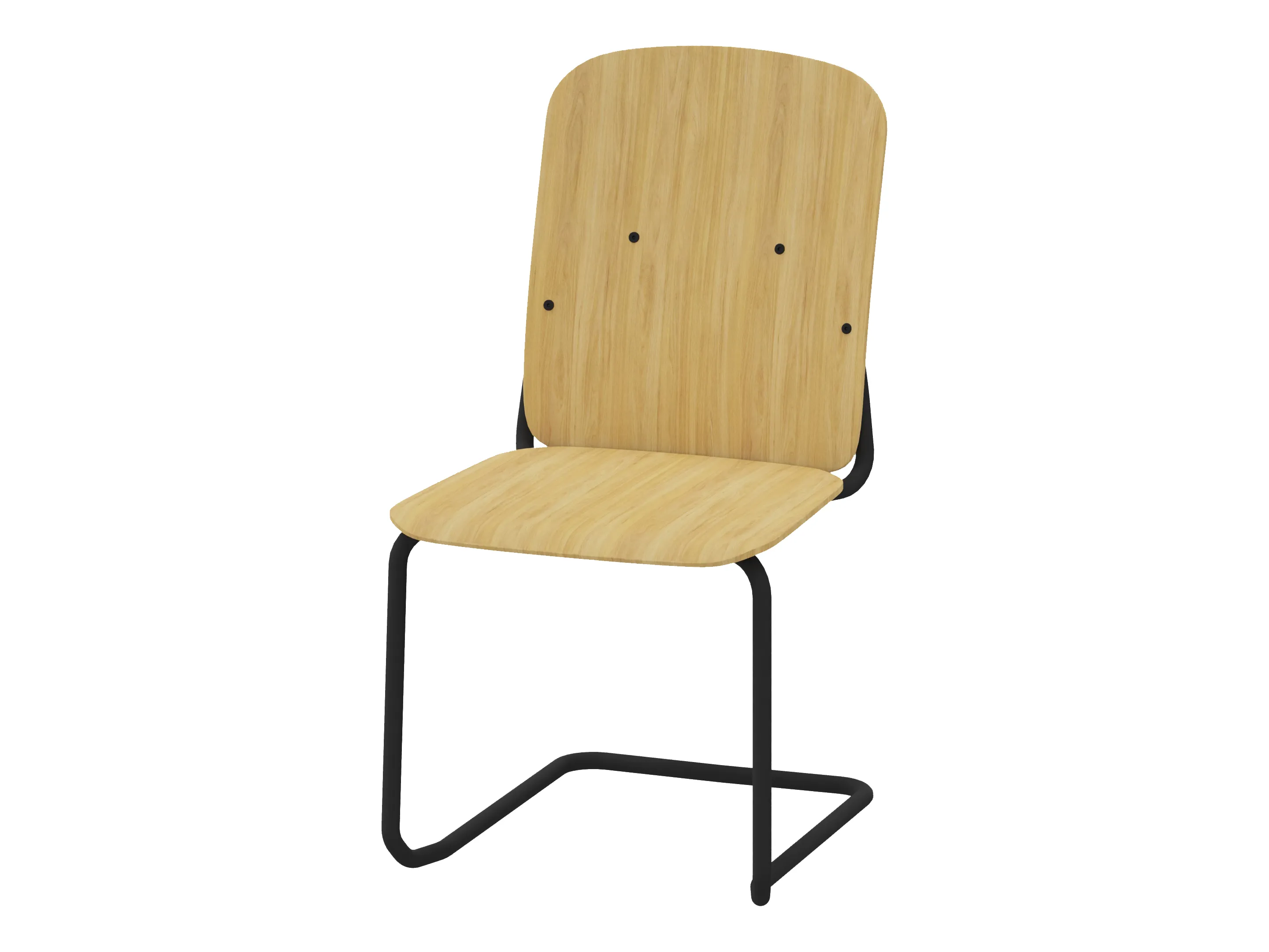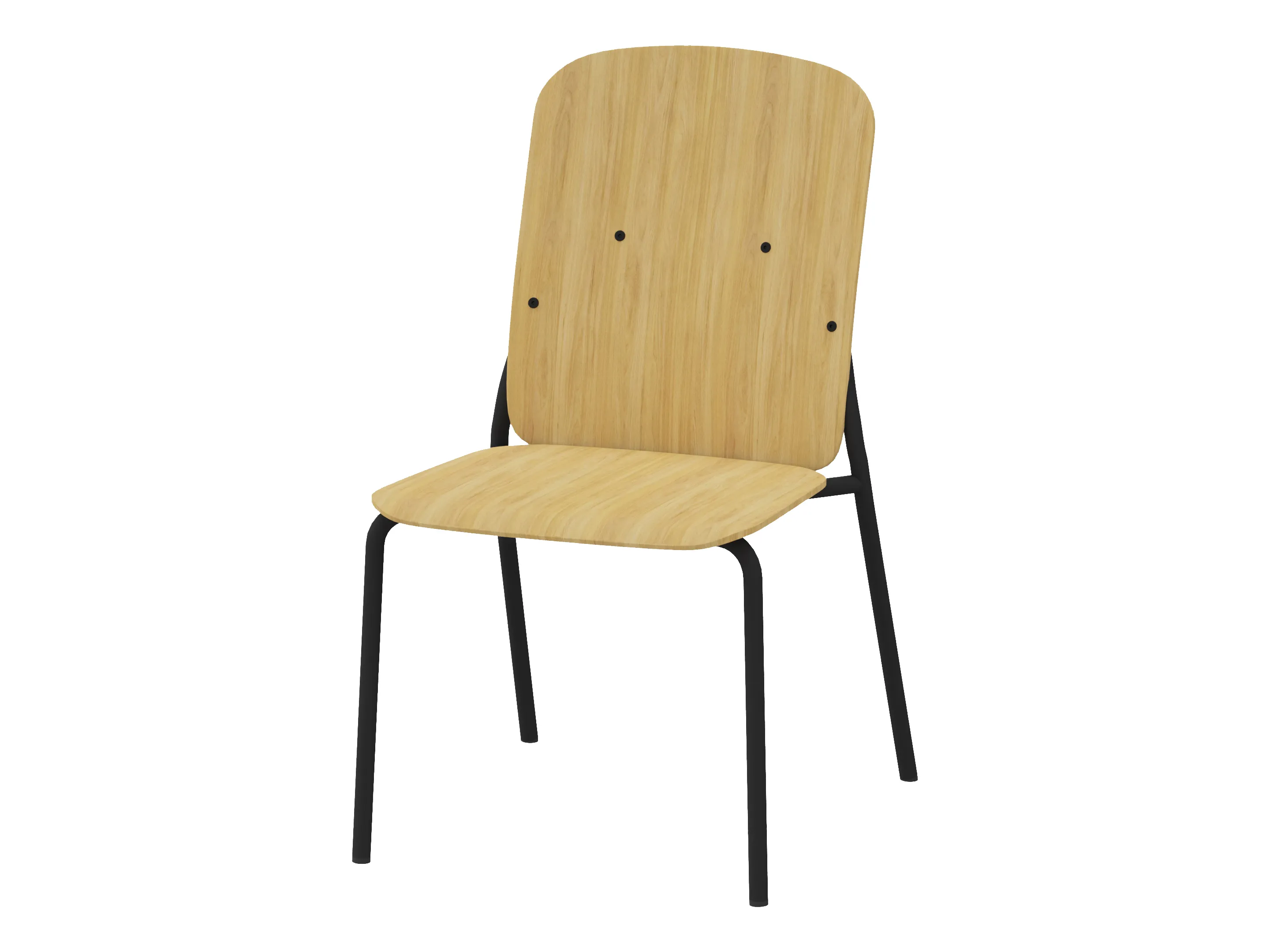 Bijzetstoel met een korte fineer rug en gestoffeerde zitting op een 4-poots frame op glijders. Zonder armleuningen. Stapelbaar tot 4 stuks. Afmeting: 525 x 590 x 800mm (B x D x H). Zithoogte 470mm.