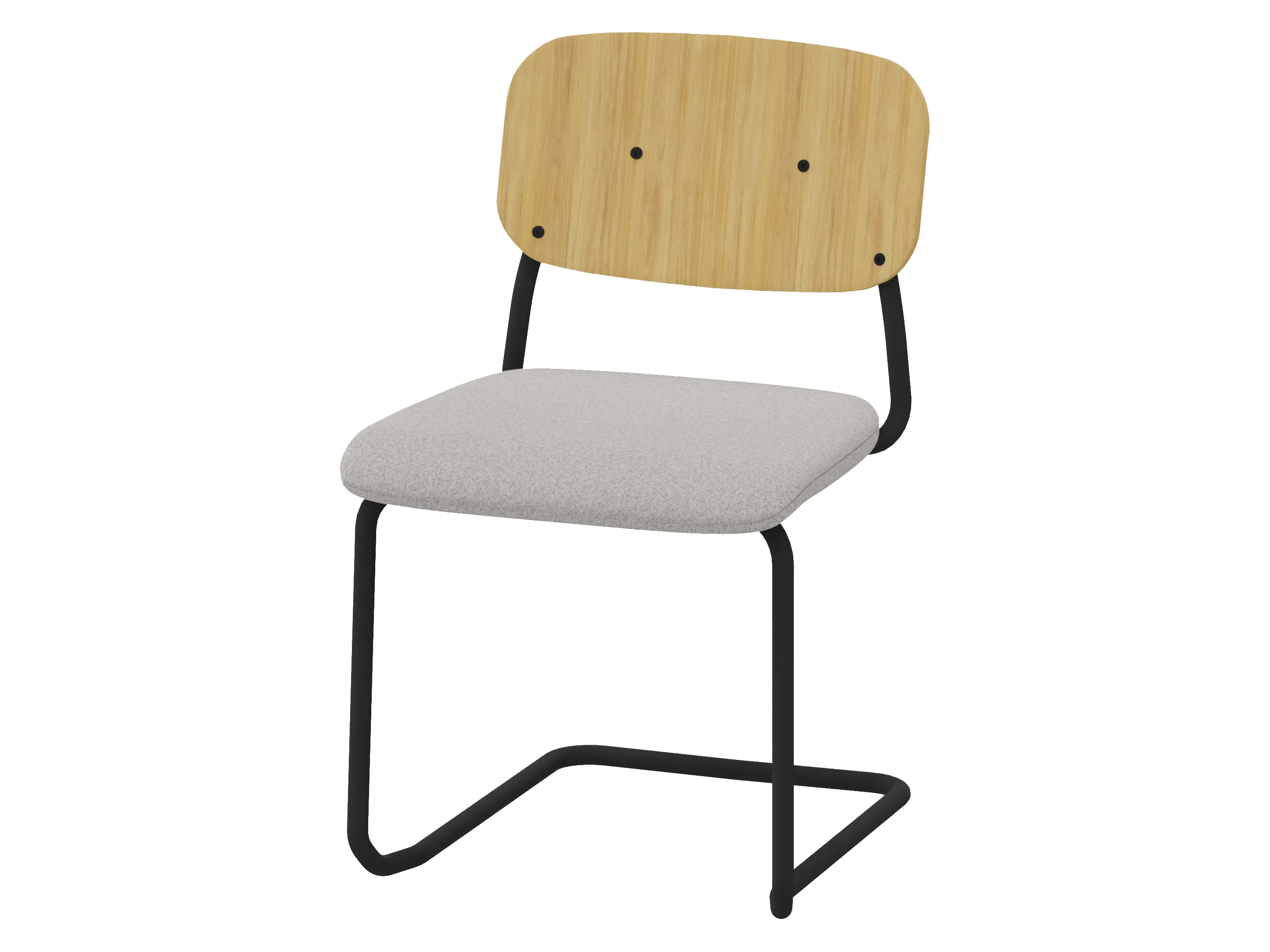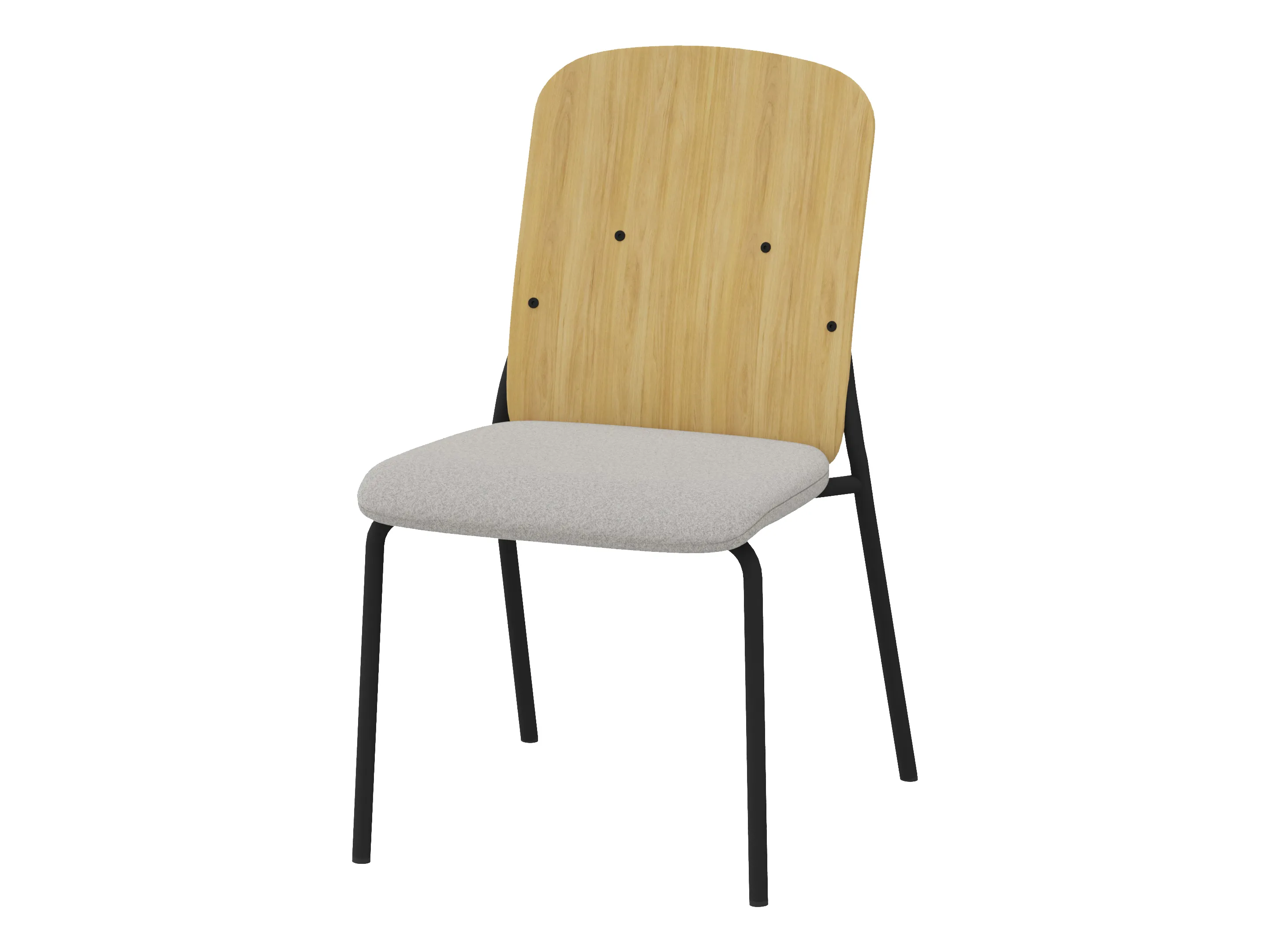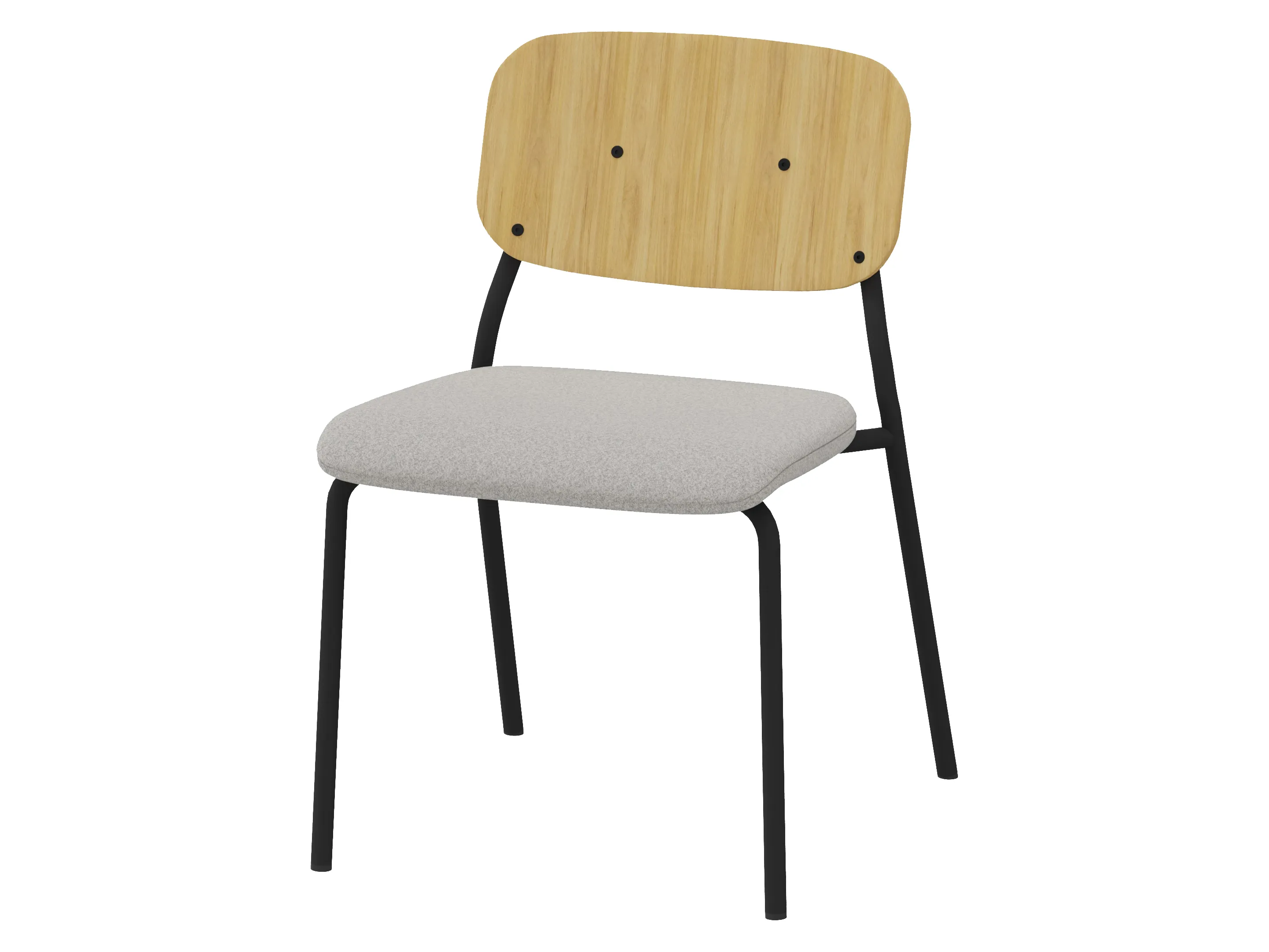 Bijzetstoel met een korte fineer rug en gestoffeerde zitting op een 4-poots frame op glijders. Zonder armleuningen. Stapelbaar tot 4 stuks. Afmeting: 525 x 590 x 920mm (B x D x H). Zithoogte 470mm.