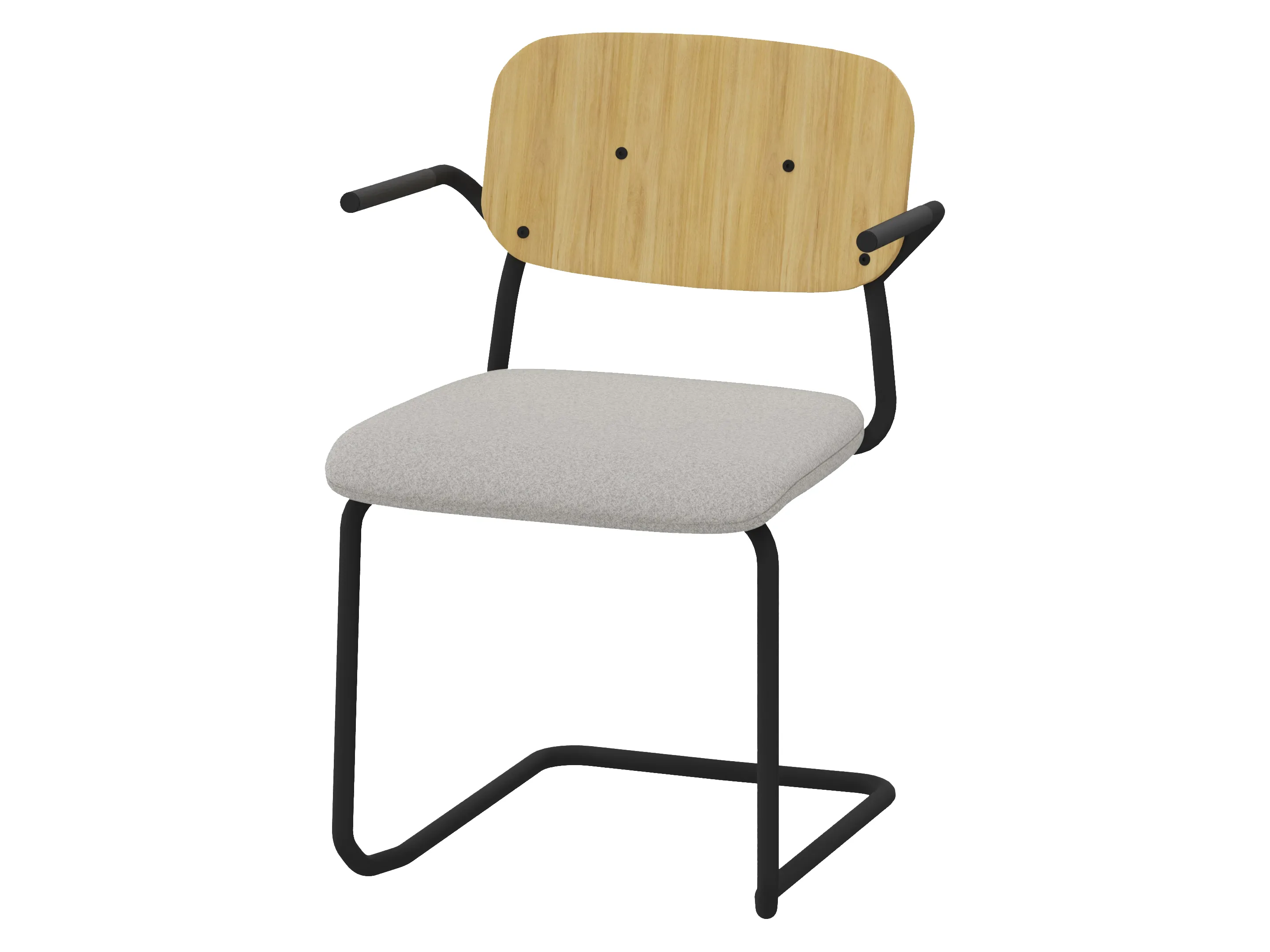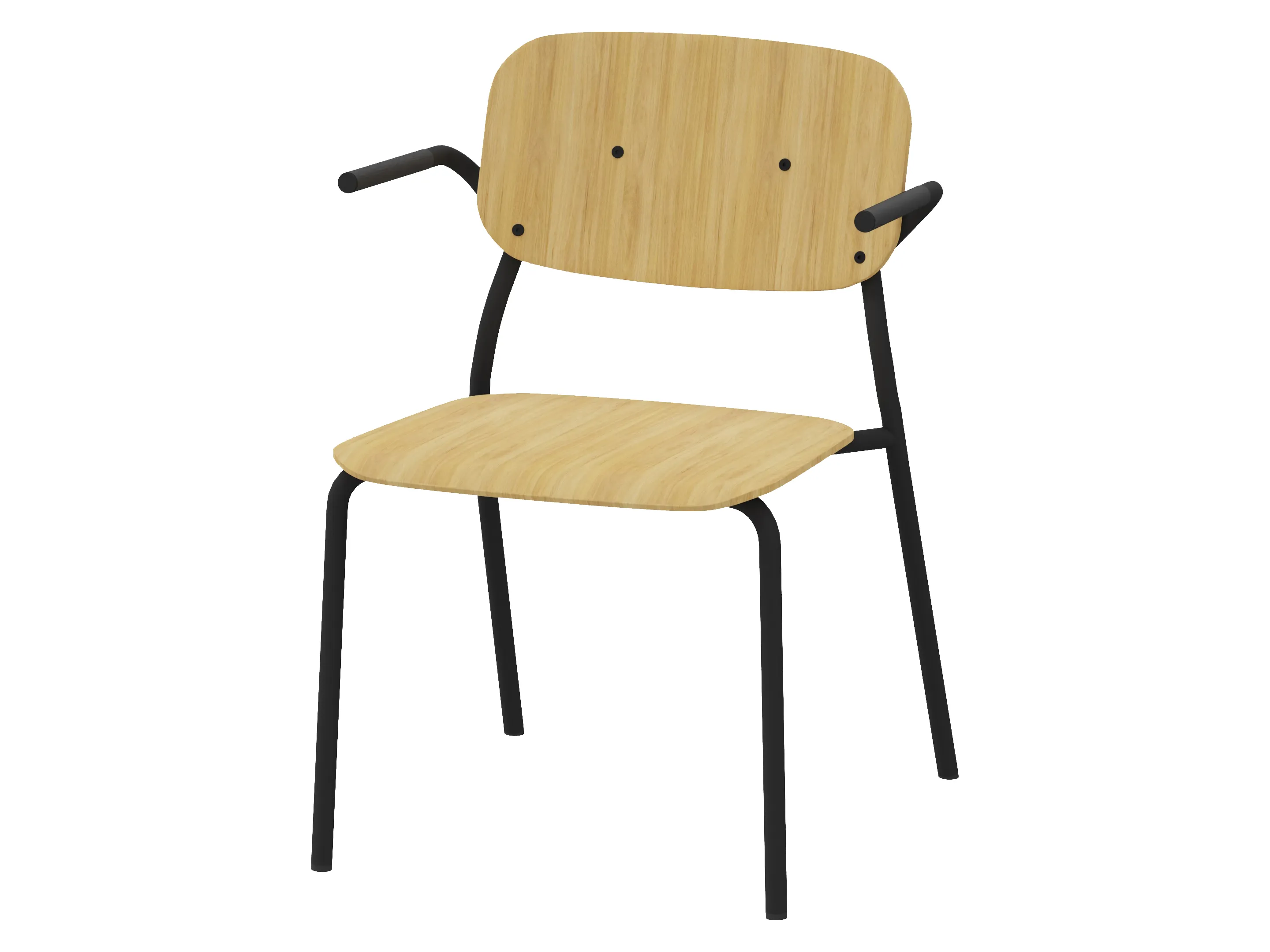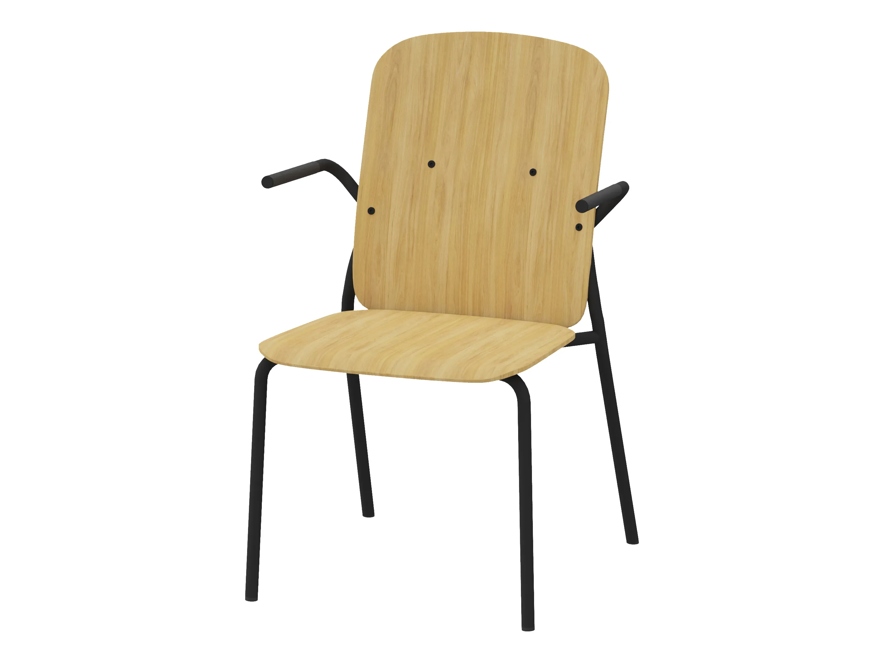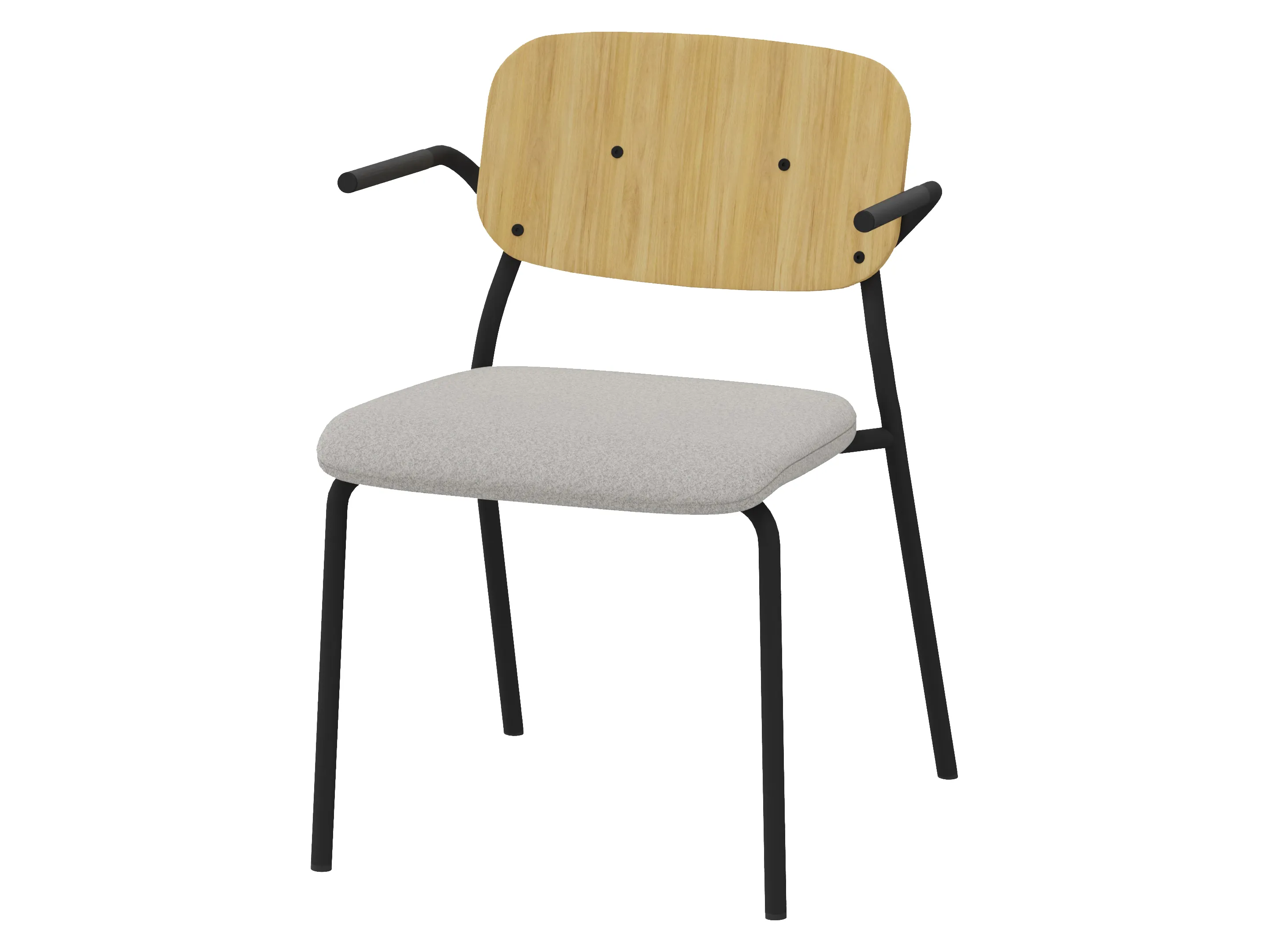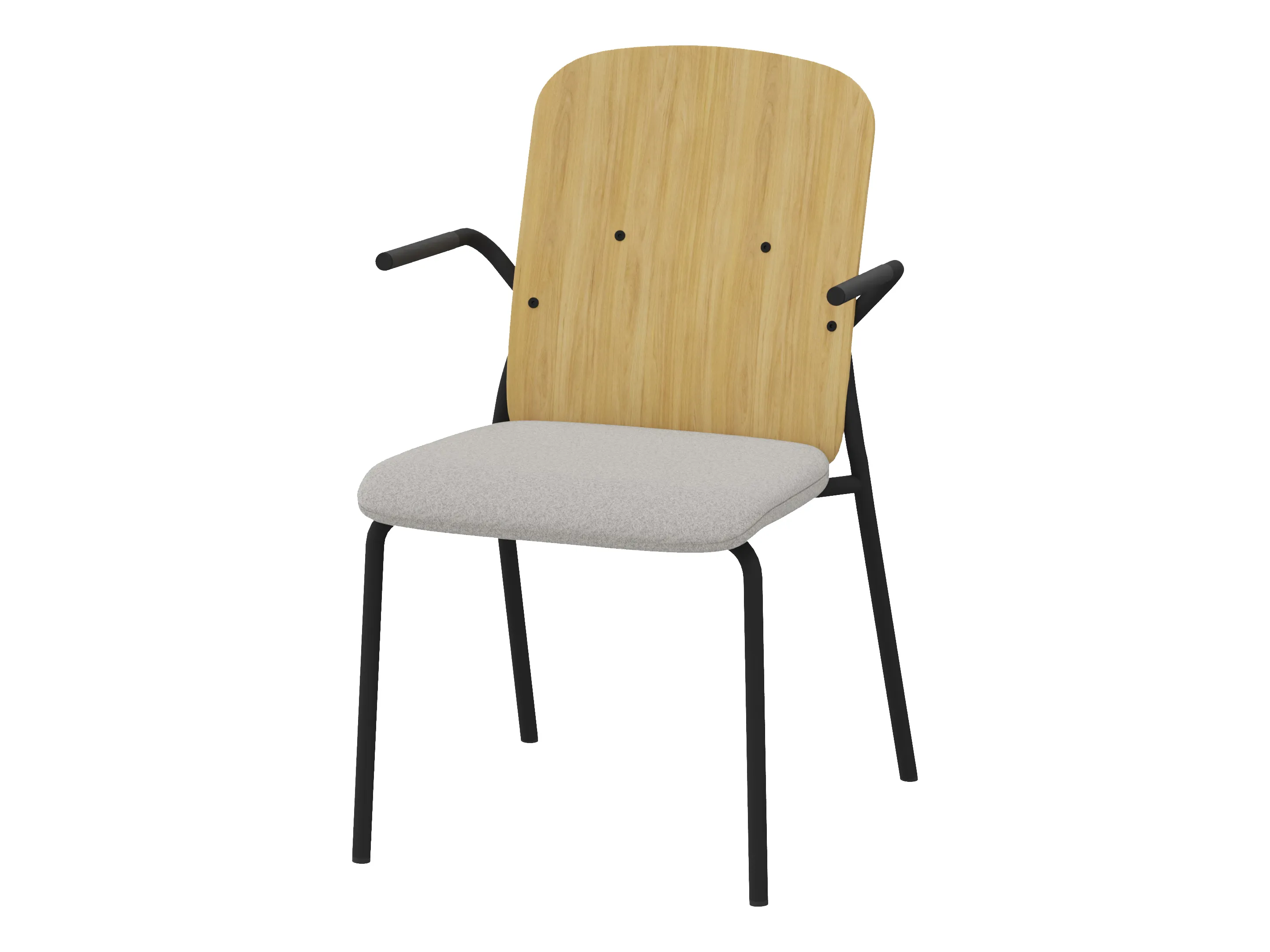 Bijzetstoel met een korte fineer rug en gestoffeerde zitting op een 4-poots frame op glijders. Met armleuningen. Stapelbaar tot 4 stuks. Afmeting: 570 x 590 x 920mm (B x D x H). Zithoogte 470mm.