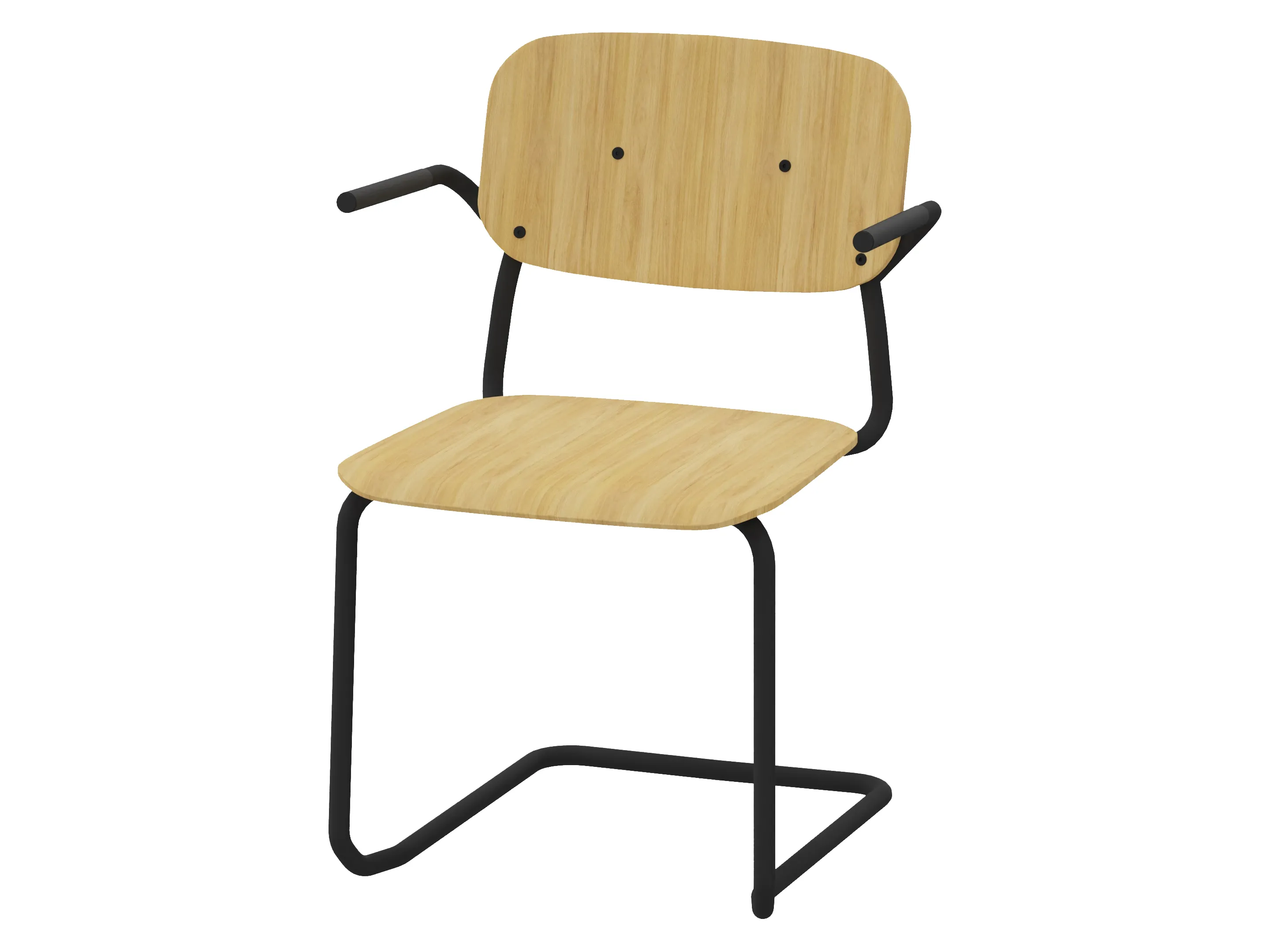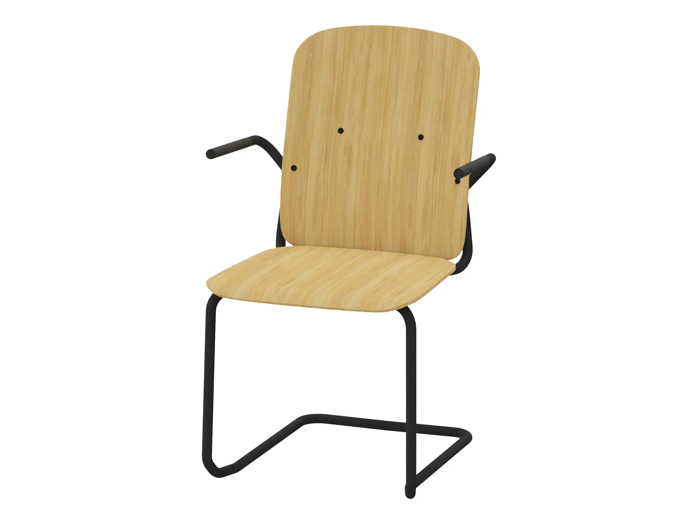 Bijzetstoel met een korte fineer rug en gestoffeerde zitting op een sledeframe op glijders. Met armleuningen. Stapelbaar tot 4 stuks. Afmeting: 570 x 590 x 825mm (B x D x H). Zithoogte 480mm.