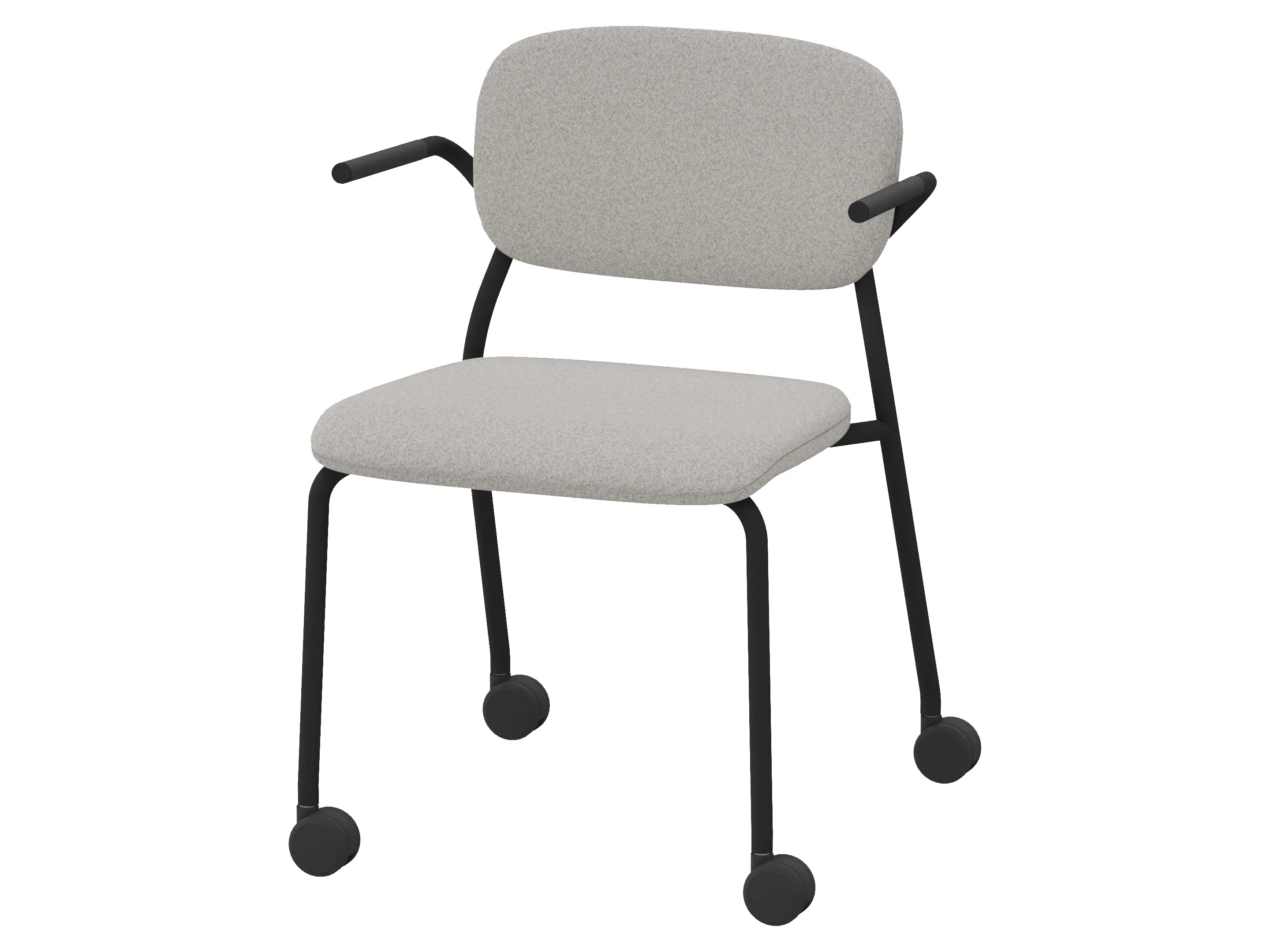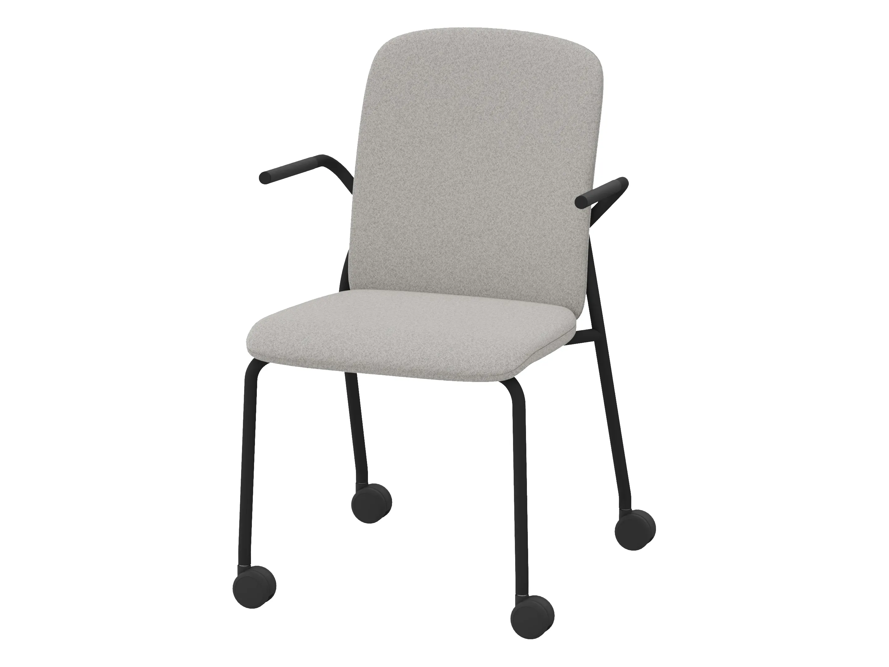 Volledig gestoffeerde bijzetstoel met korte rug op een 4-poots frame op wielen. Met armleuningen. Stapelbaar tot 4 stuks. Afmeting: 570 x 590 x 920mm (B x D x H). Zithoogte 470mm.