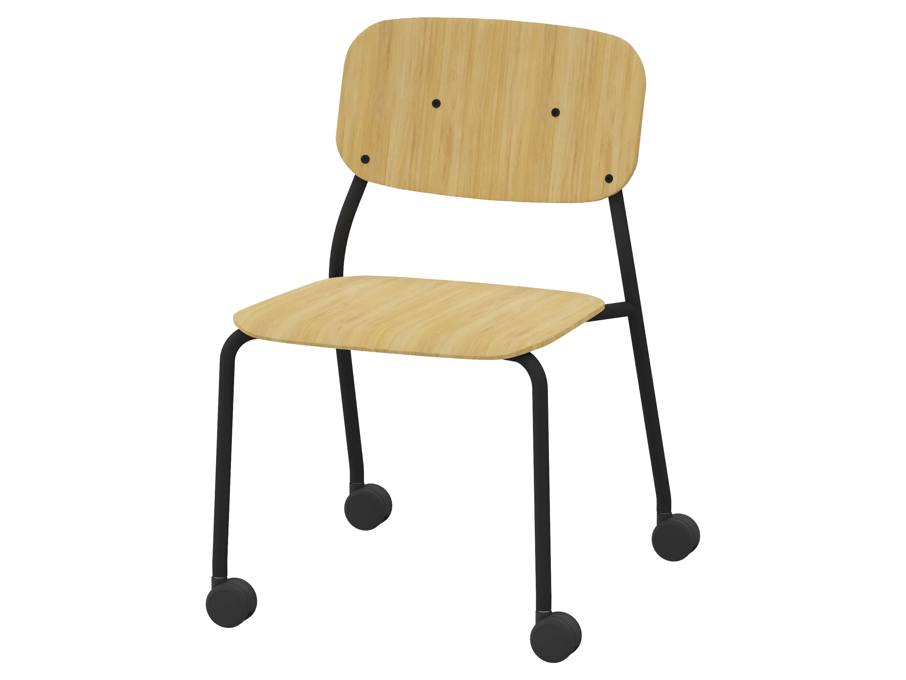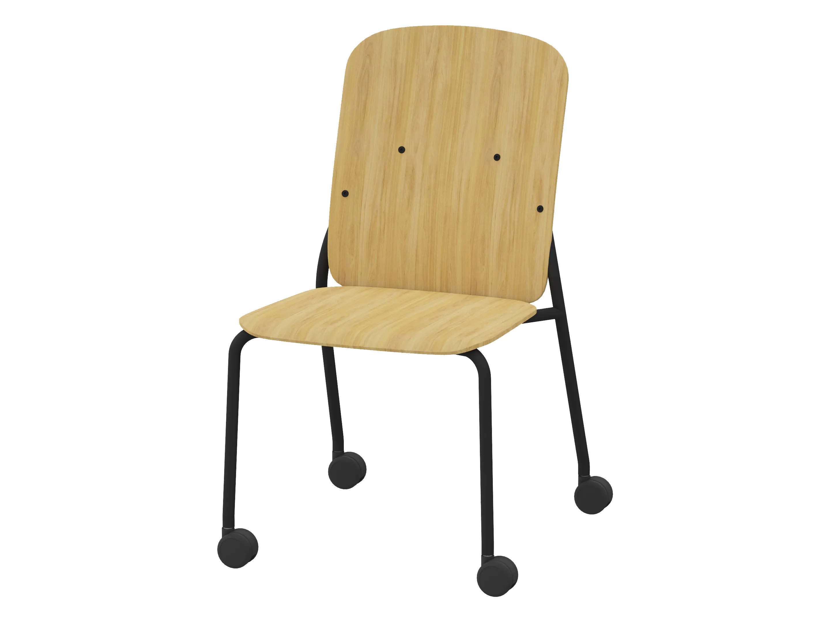 Bijzetstoel met een korte fineer rug en gestoffeerde zitting op een 4-poots frame op wielen. Zonder armleuningen. Stapelbaar tot 4 stuks. Afmeting: 460 x 580 x 795mm (B x D x H). Zithoogte 470mm.