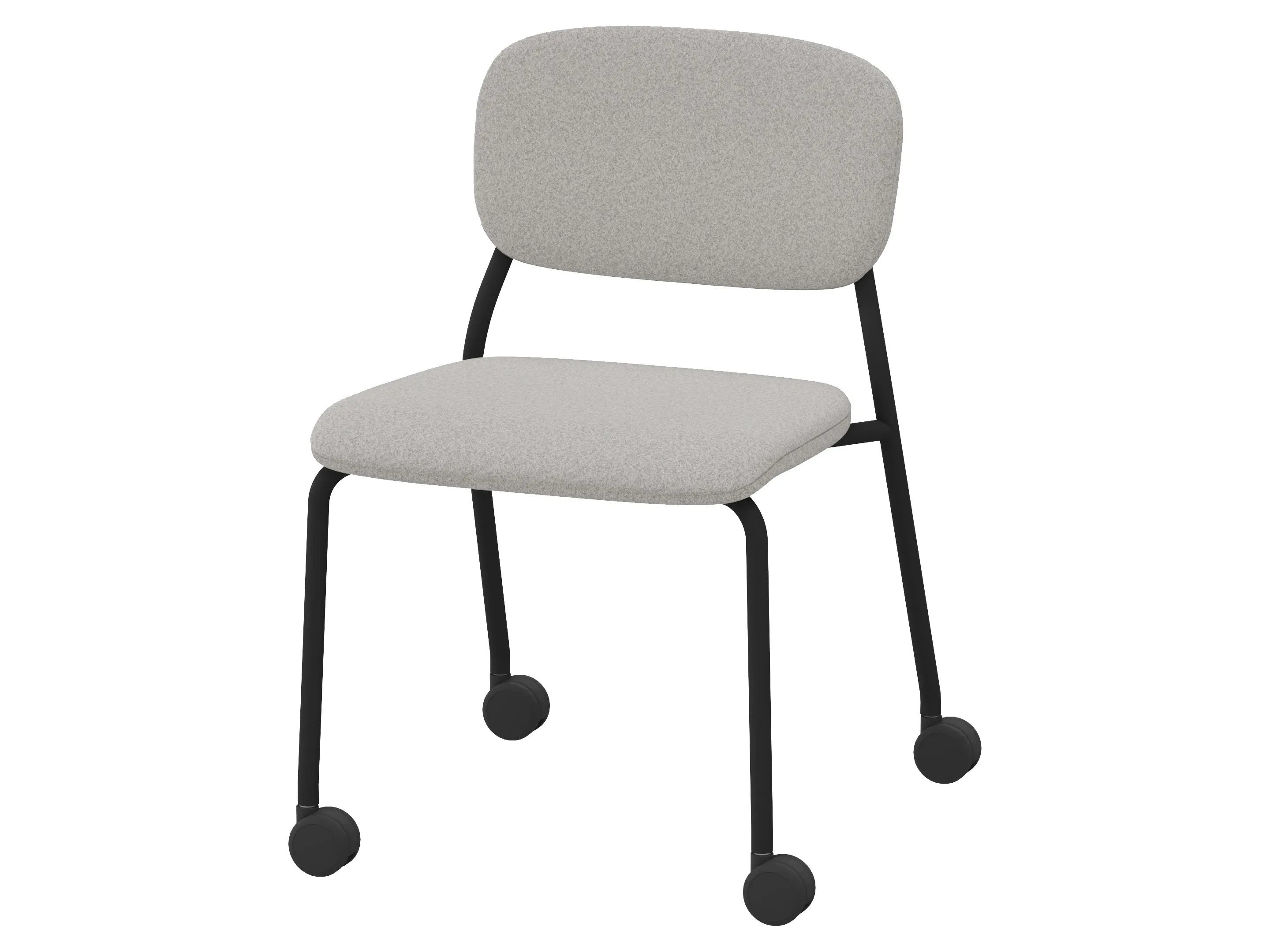 Volledig gefineerde bijzetstoel met een korte rug op een 4-poots frame op wielen. Zonder armleuningen. Stapelbaar tot 4 stuks. Afmeting: 460 x 580 x 795mm (B x D x H). Zithoogte 430mm.
