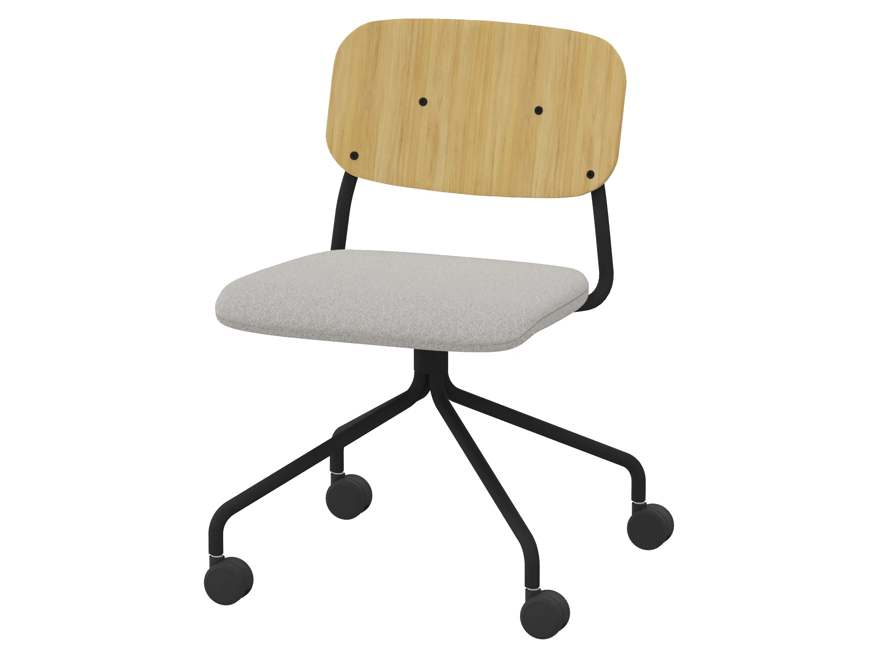 Bijzetstoel met een korte fineer rugleuning en gestoffeerde zitting op een 4-teens kruis op wielen. Excl. armleuningen, draaibaar. Afmeting: 555 x 600 x 800mm. Zithoogte 470mm.