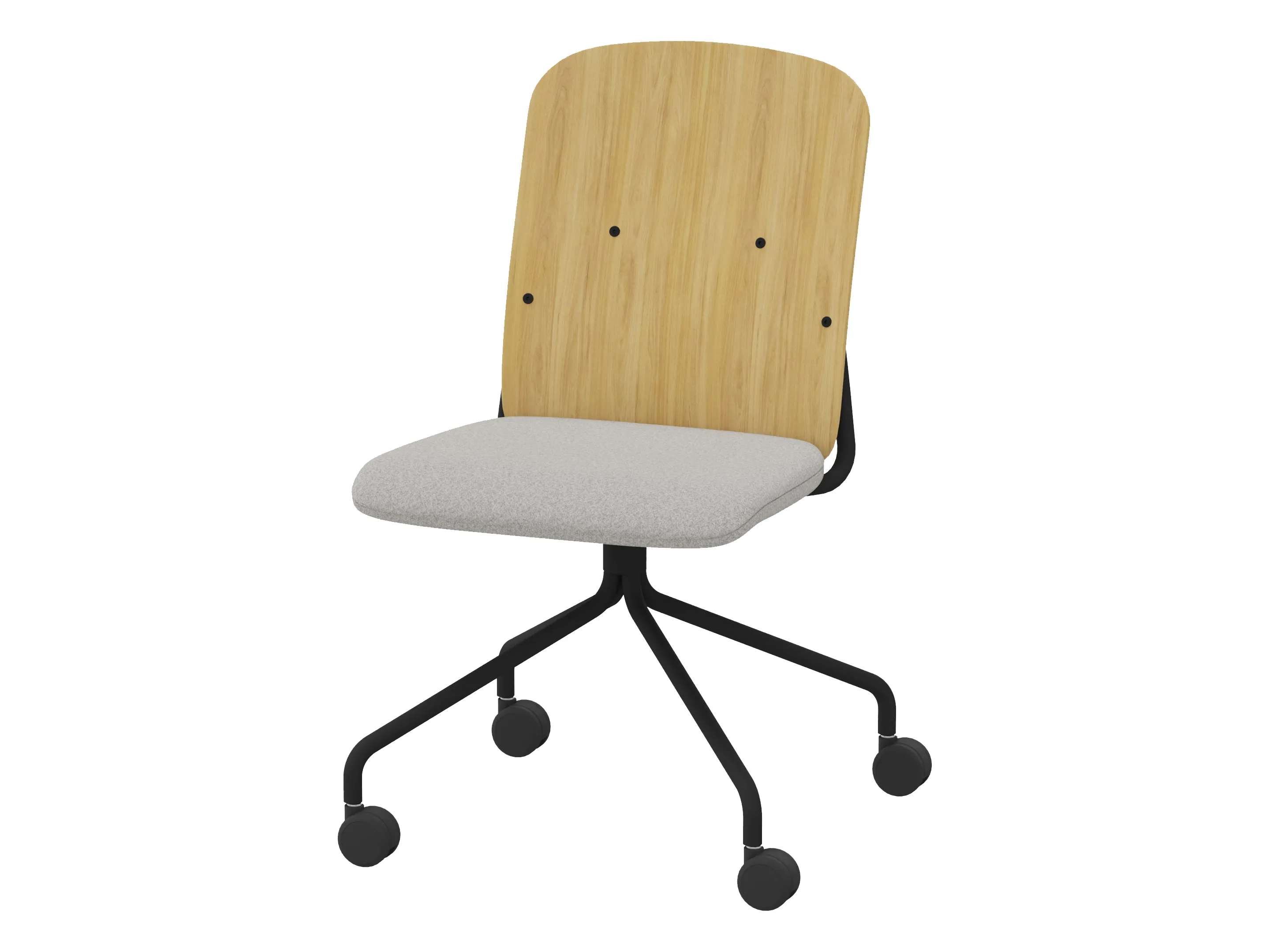 Bijzetstoel met een fineer rugleuning en gestoffeerde zitting op een 4-teens kruis op wielen. Excl. armleuningen, draaibaar. Afmeting: 555 x 630 x 920mm. Zithoogte 470mm.