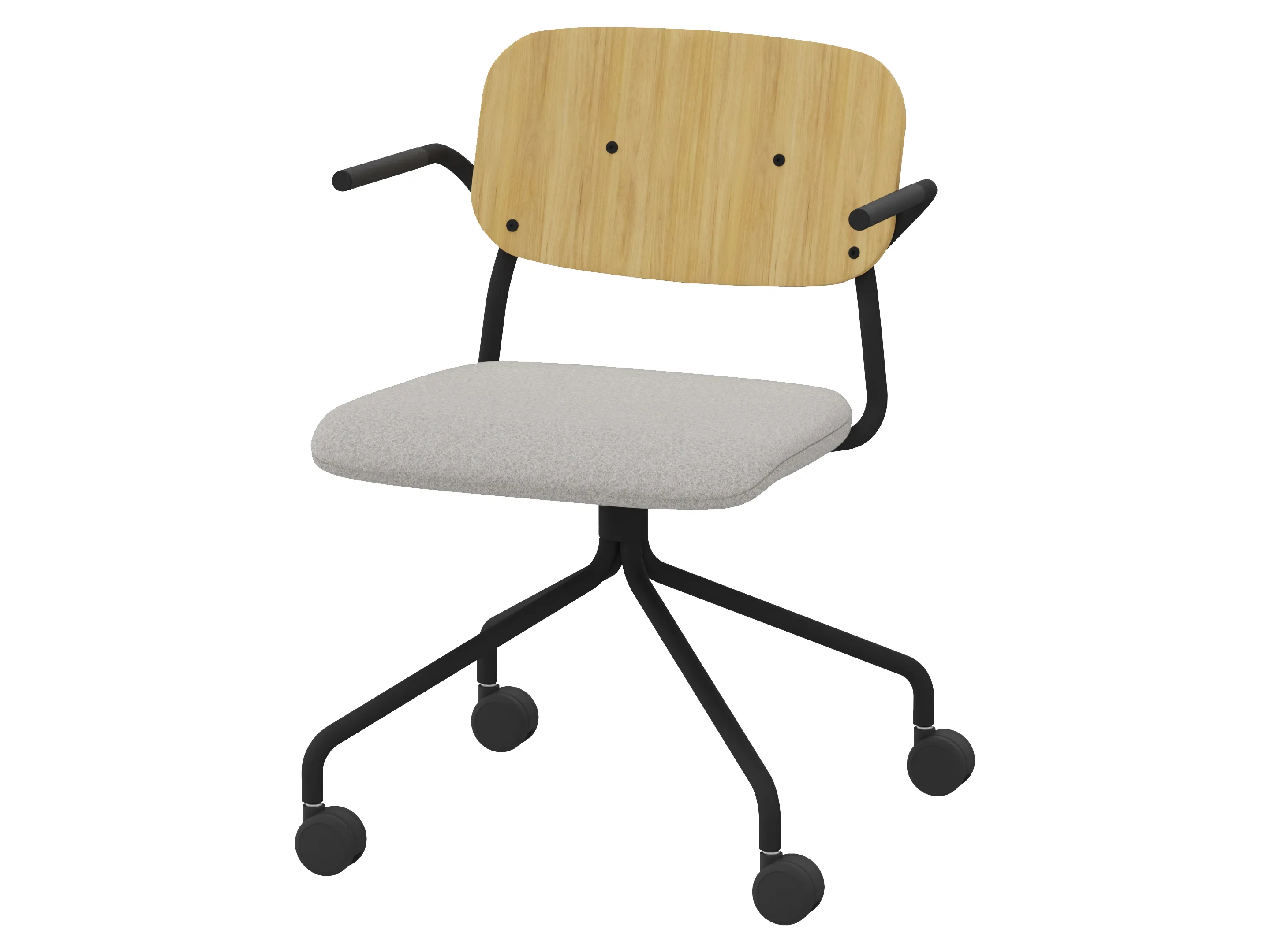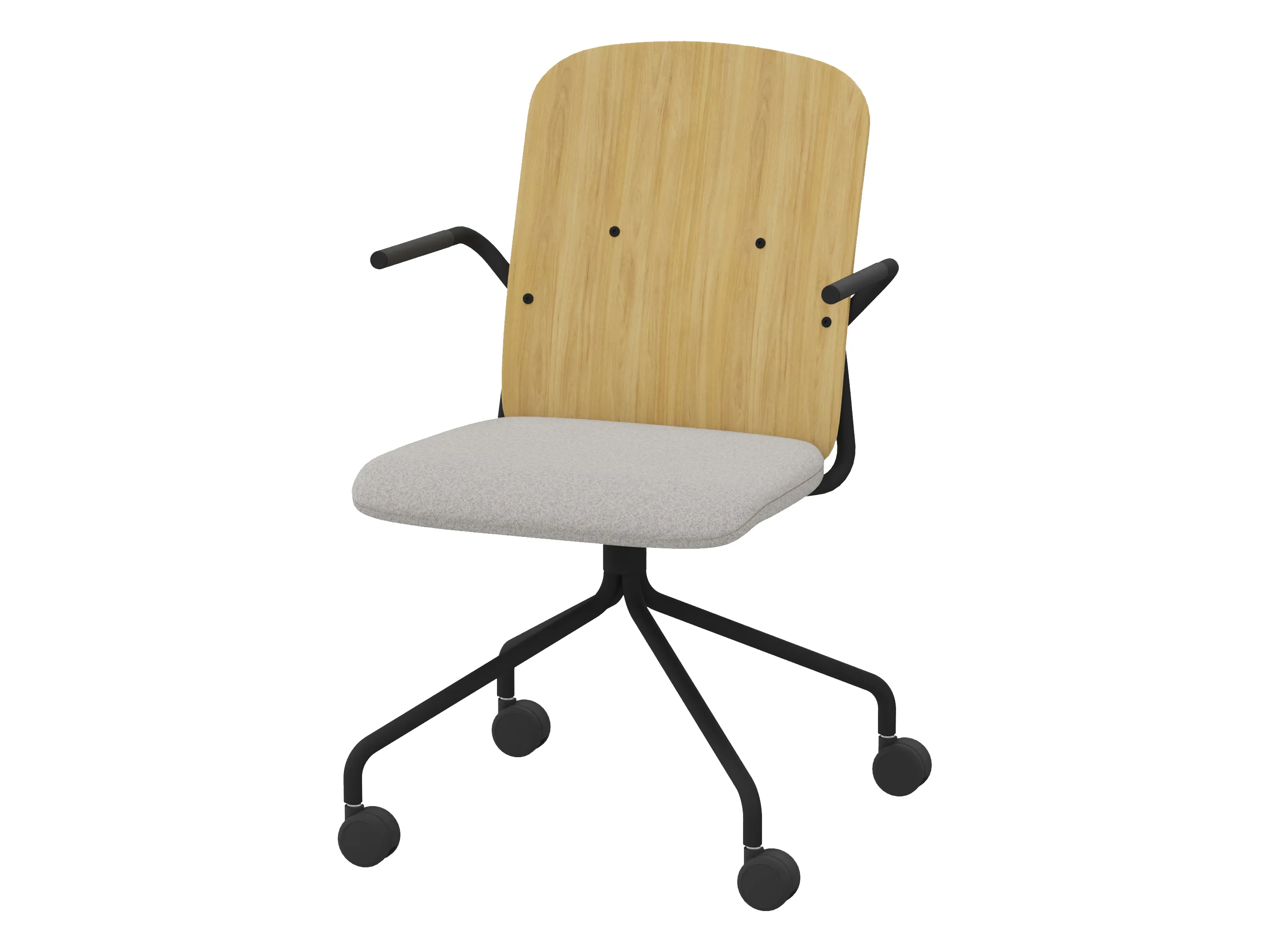 Bijzetstoel met een korte fineer rugleuning en gestoffeerde zitting op een 4-teens kruis op wielen. Incl. armleuningen, draaibaar. Afmeting: 570 x 600 x 800mm. Zithoogte 470mm.