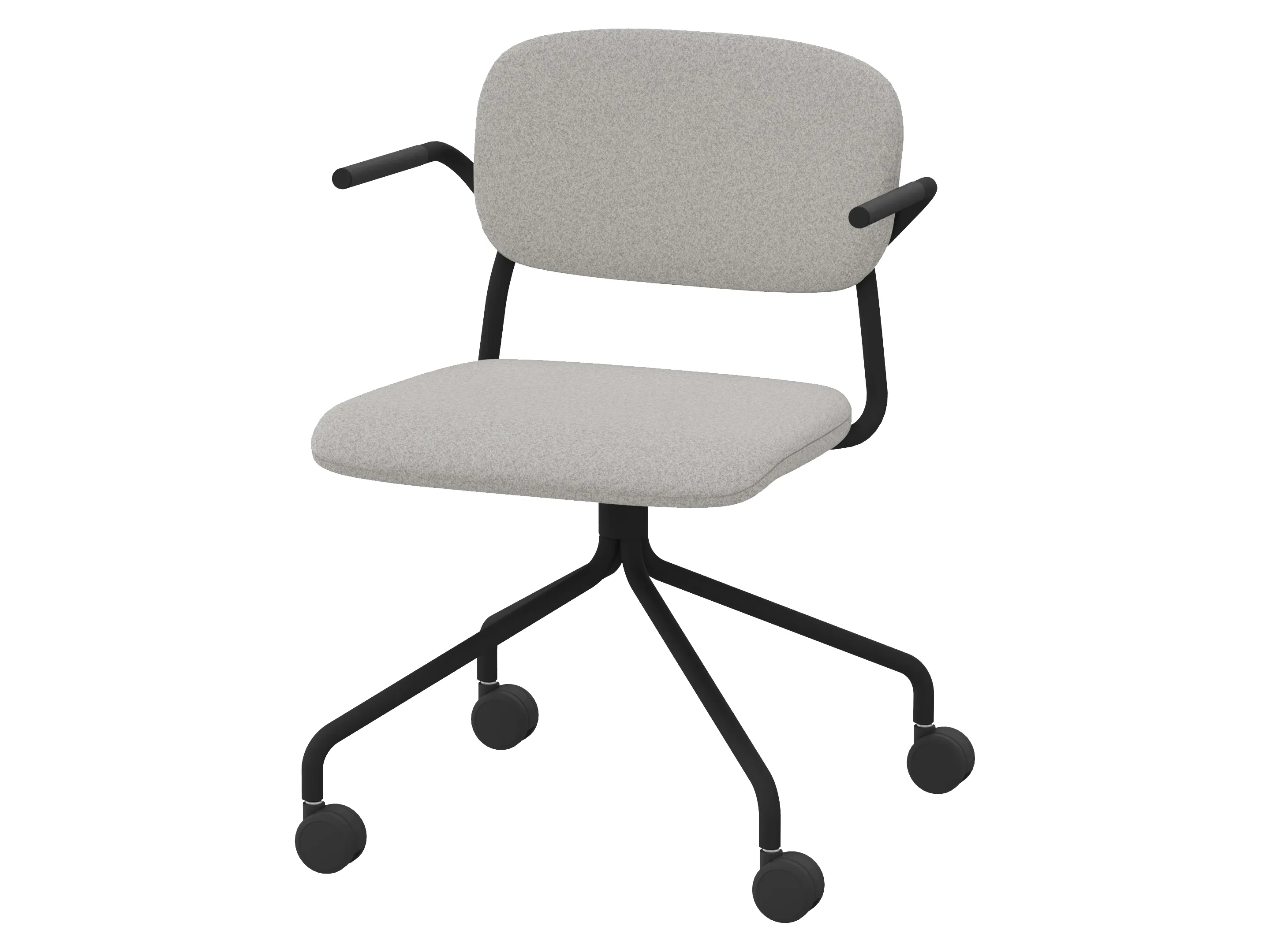 Volledig gestoffeerde bijzetstoel met een korte rugleuning op een 4-teens kruis op wielen. Incl. armleuningen, draaibaar. Afmeting: 550 x 600 x 800mm. Zithoogte 470mm.