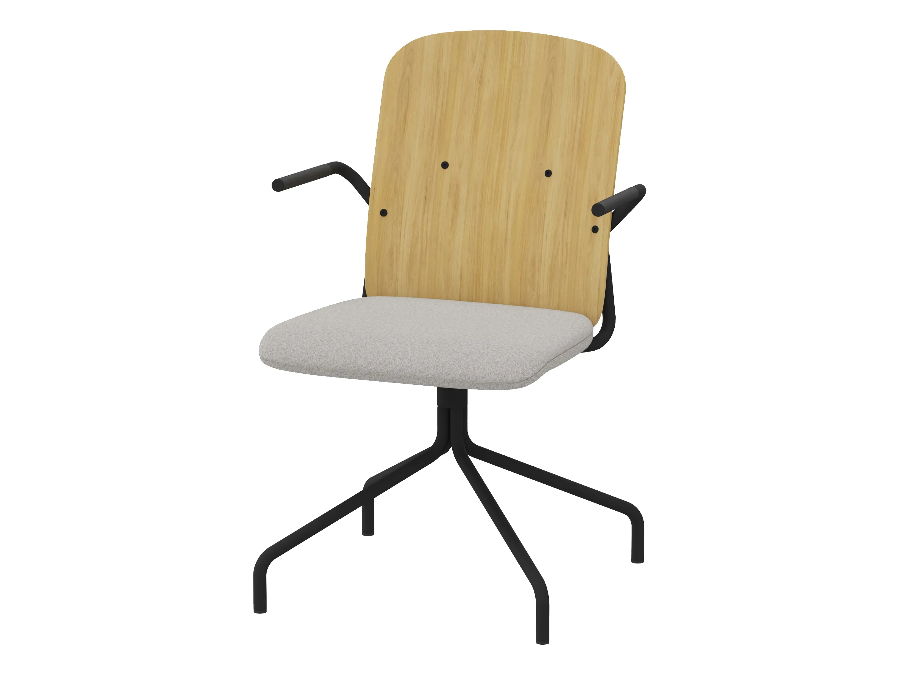 Bijzetstoel met een fineer rugleuning en gestoffeerde zitting op een 4-teens kruis op glijders. Excl. armleuningen, draaibaar. Afmeting: 515 x 590 x 920mm. Zithoogte 470mm.