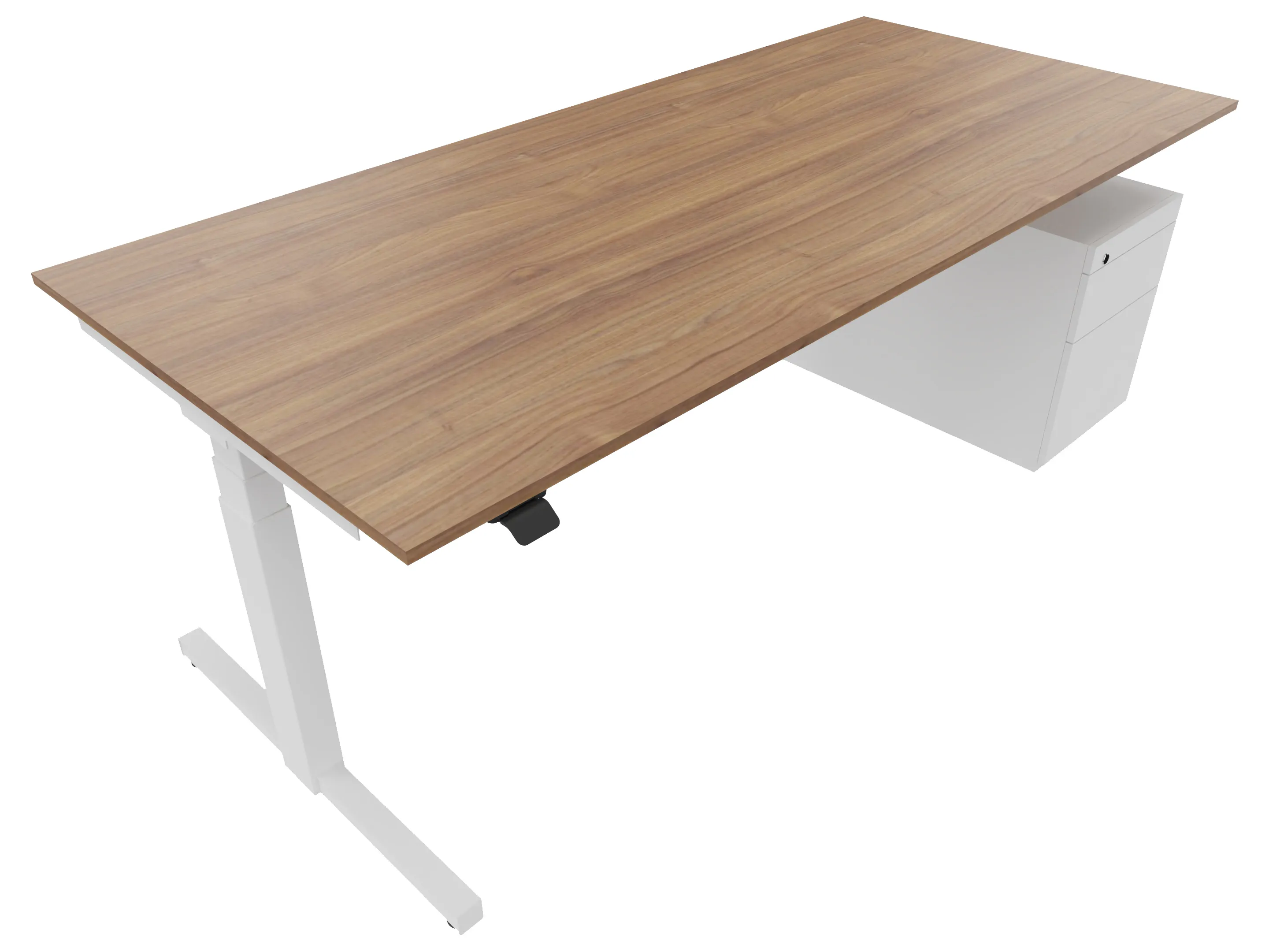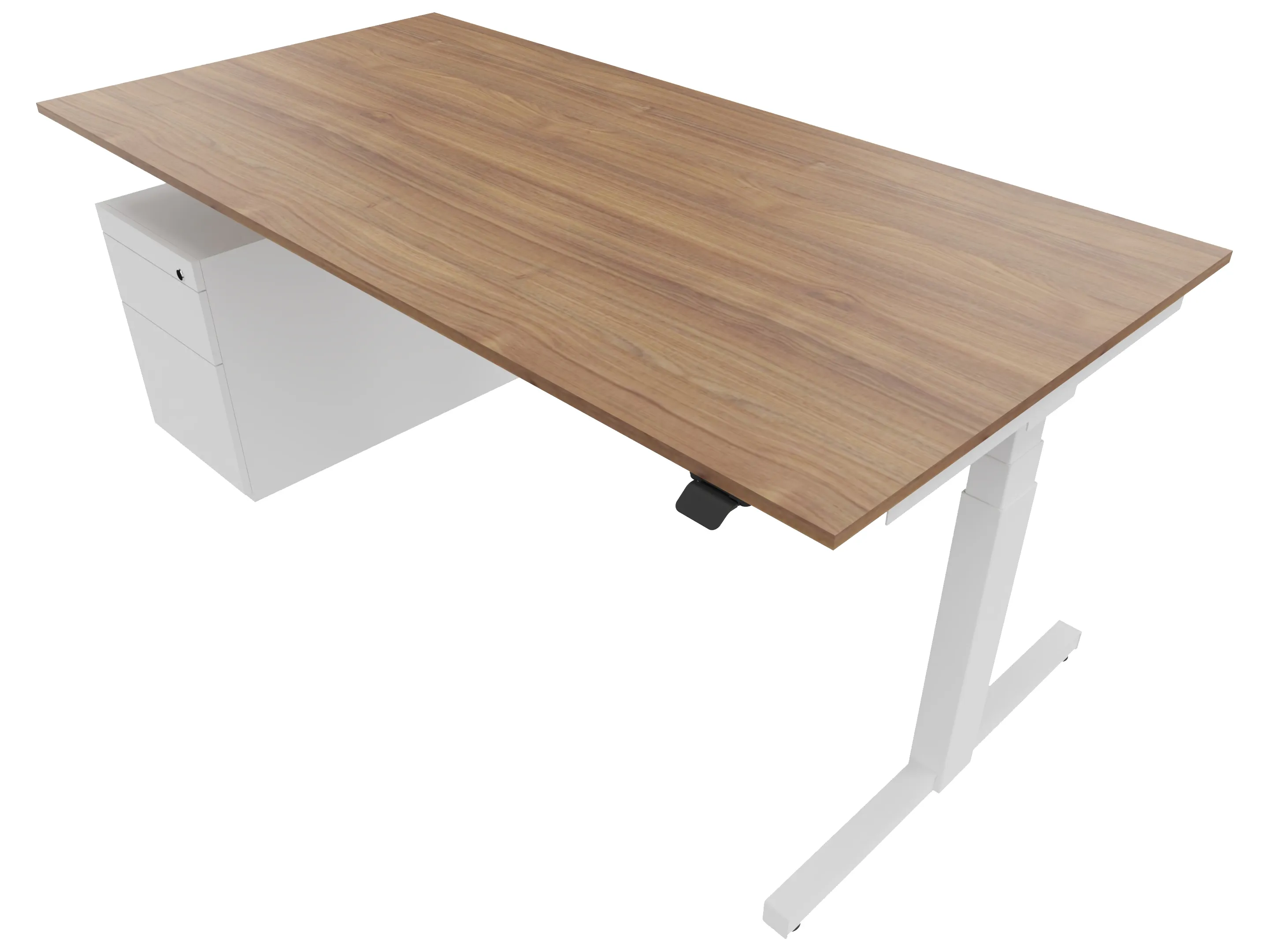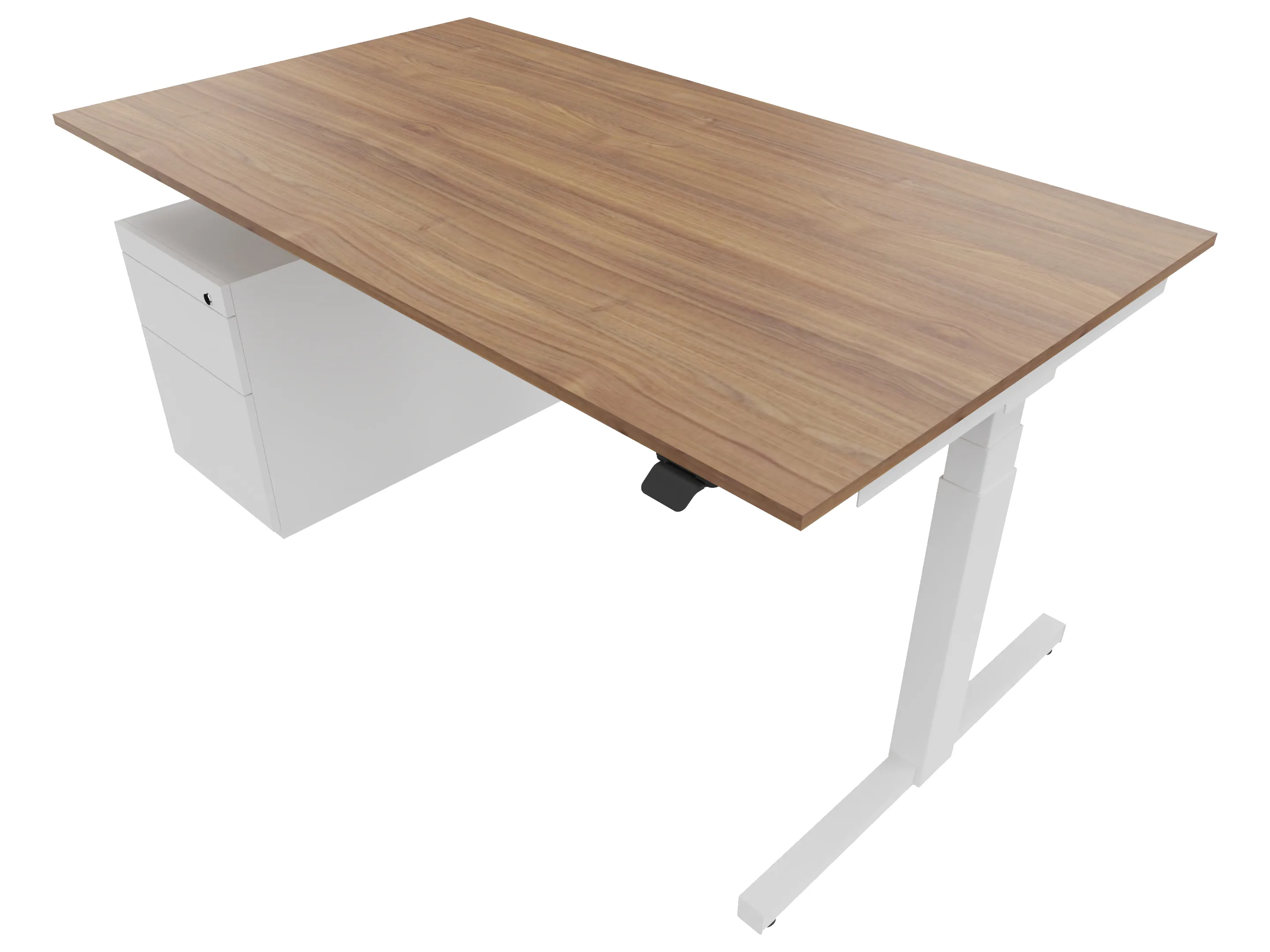Zit-sta bureau, elektrisch verstelbaar tussen 640-1300mm, compleet met 1 werkblad van 1600 x 800mm, wangpoten en hoog-laag bediening (gemonteerd onder blad), ladenblok (links gemonteerd), met hangmappenlade.