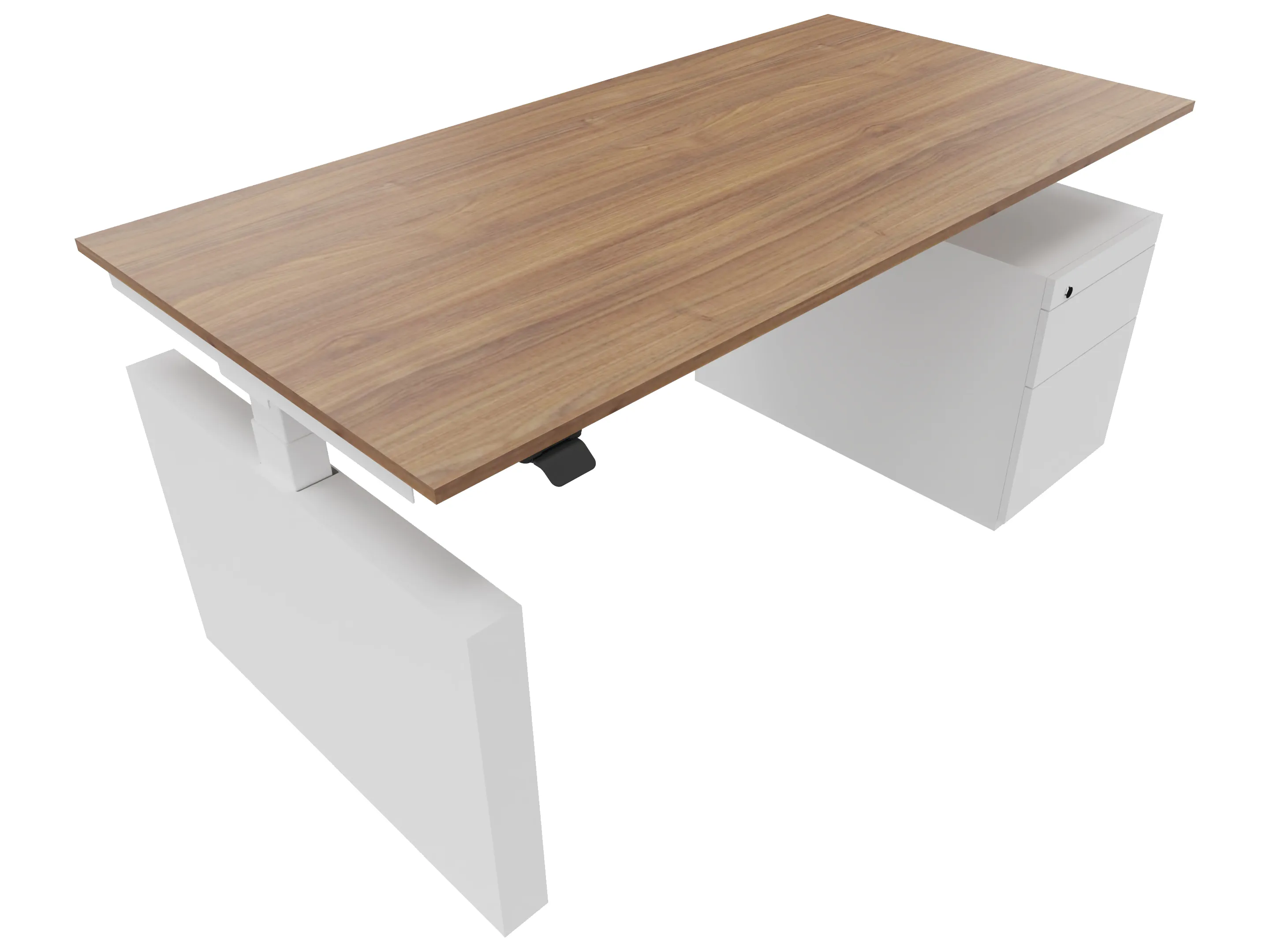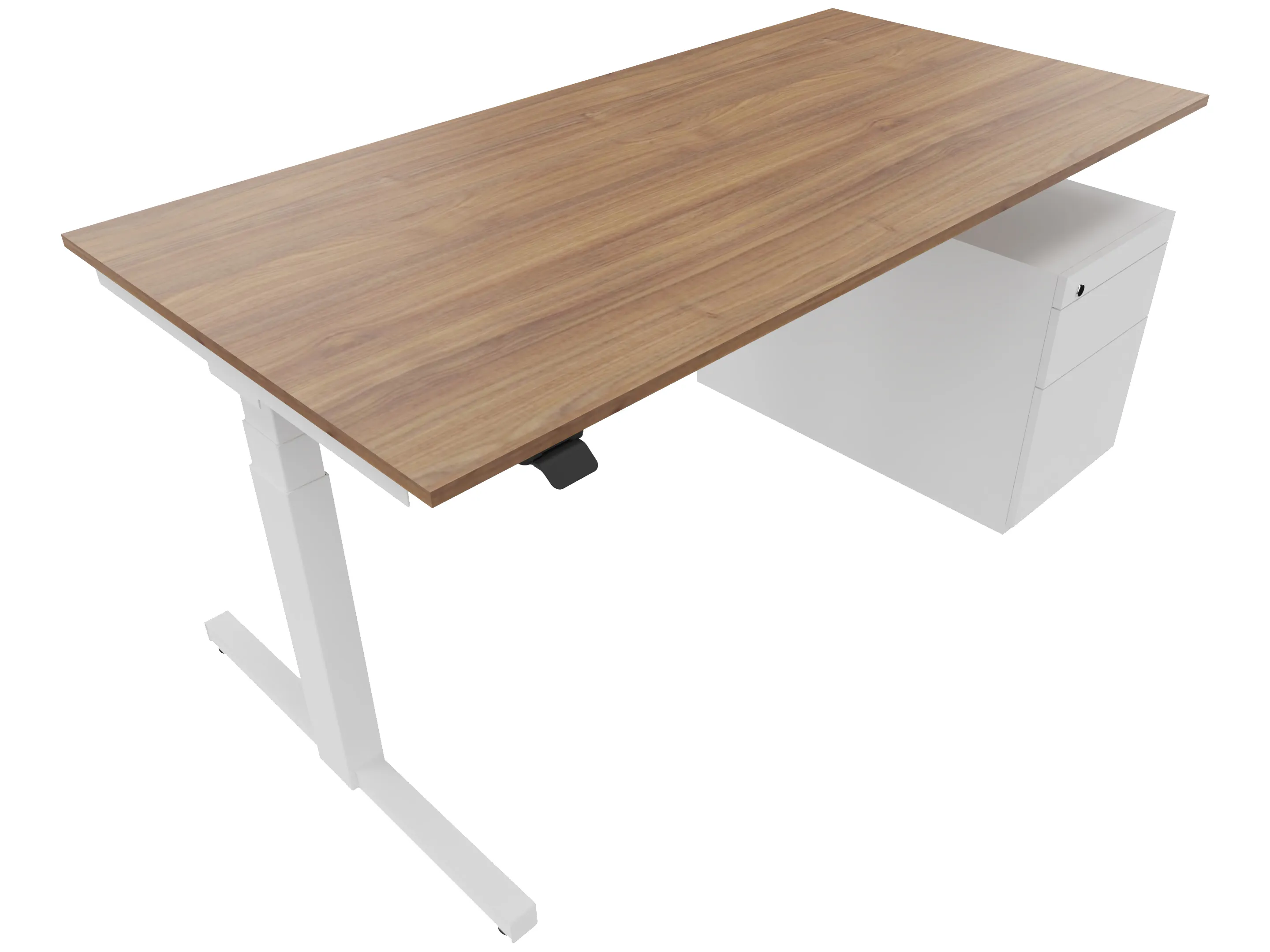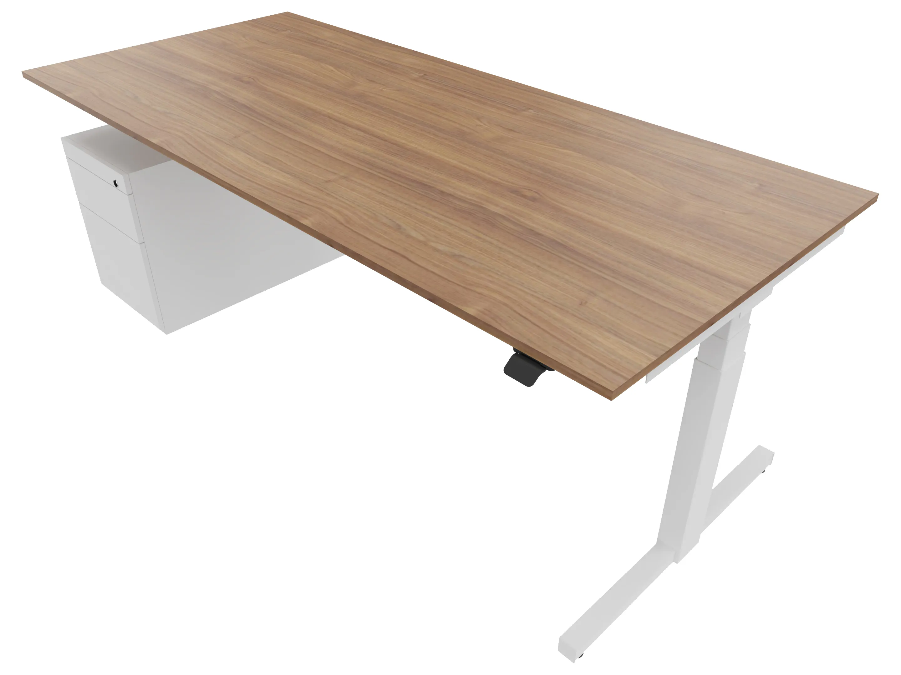Zit-sta bureau, elektrisch verstelbaar tussen 640-1300mm, compleet met 1 werkblad van 1600 x 800mm, wangpoten en hoog-laag bediening (gemonteerd onder blad), ladenblok (links gemonteerd), met hangmappenlade.