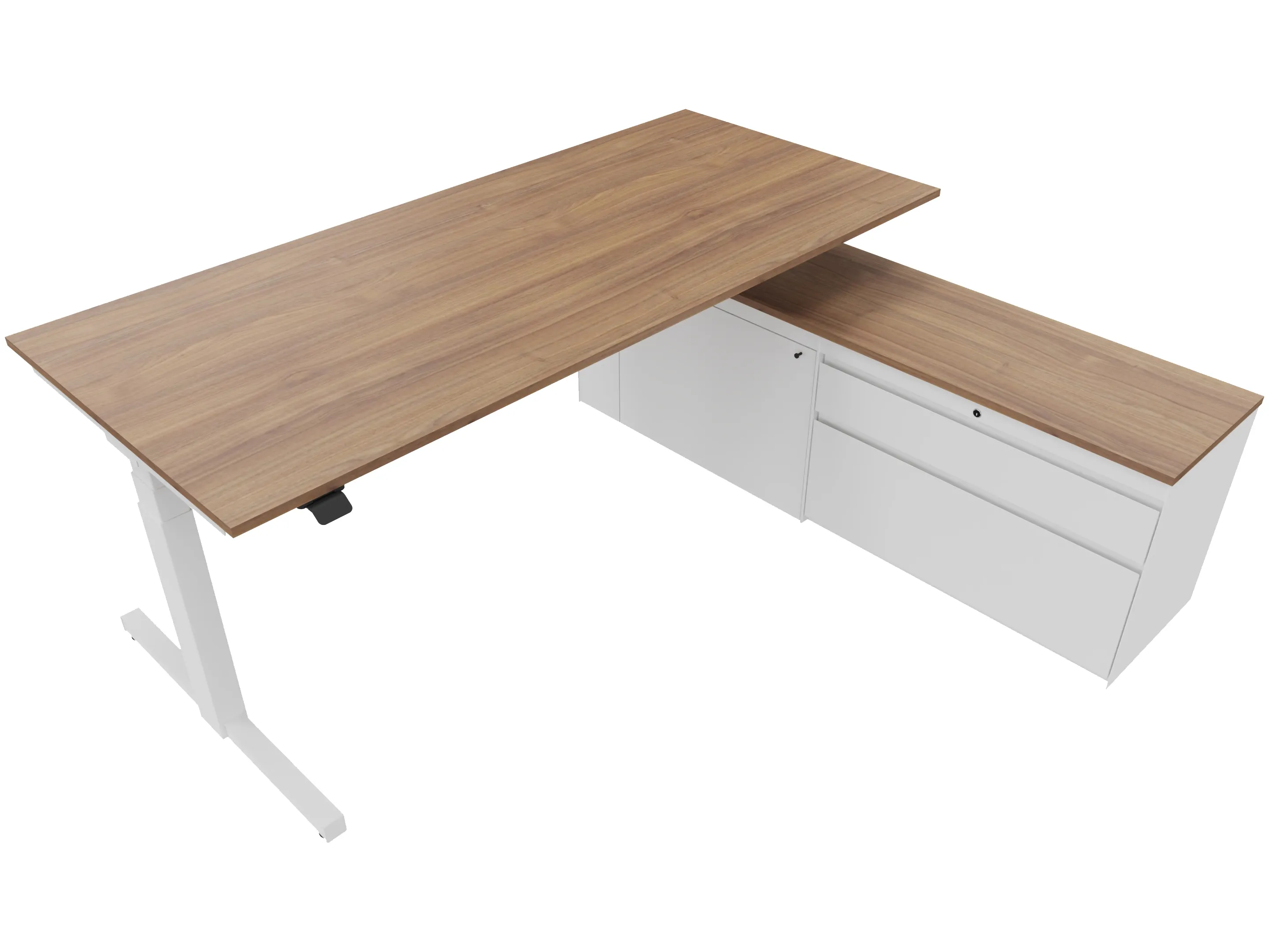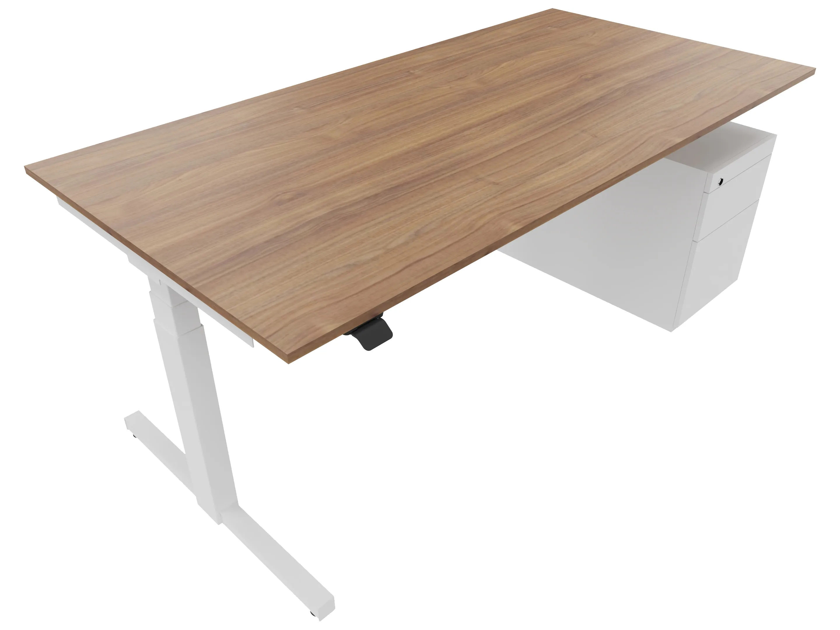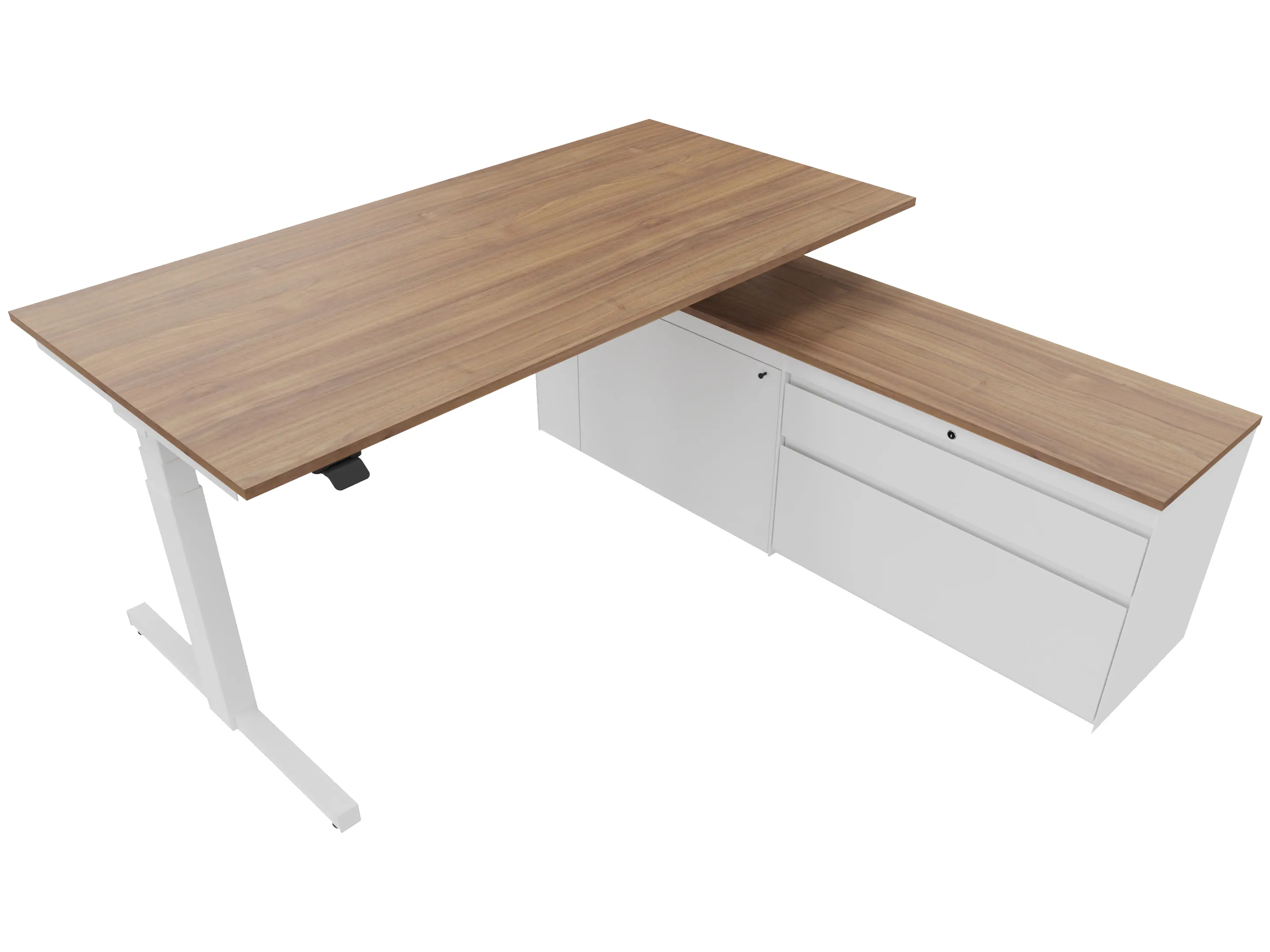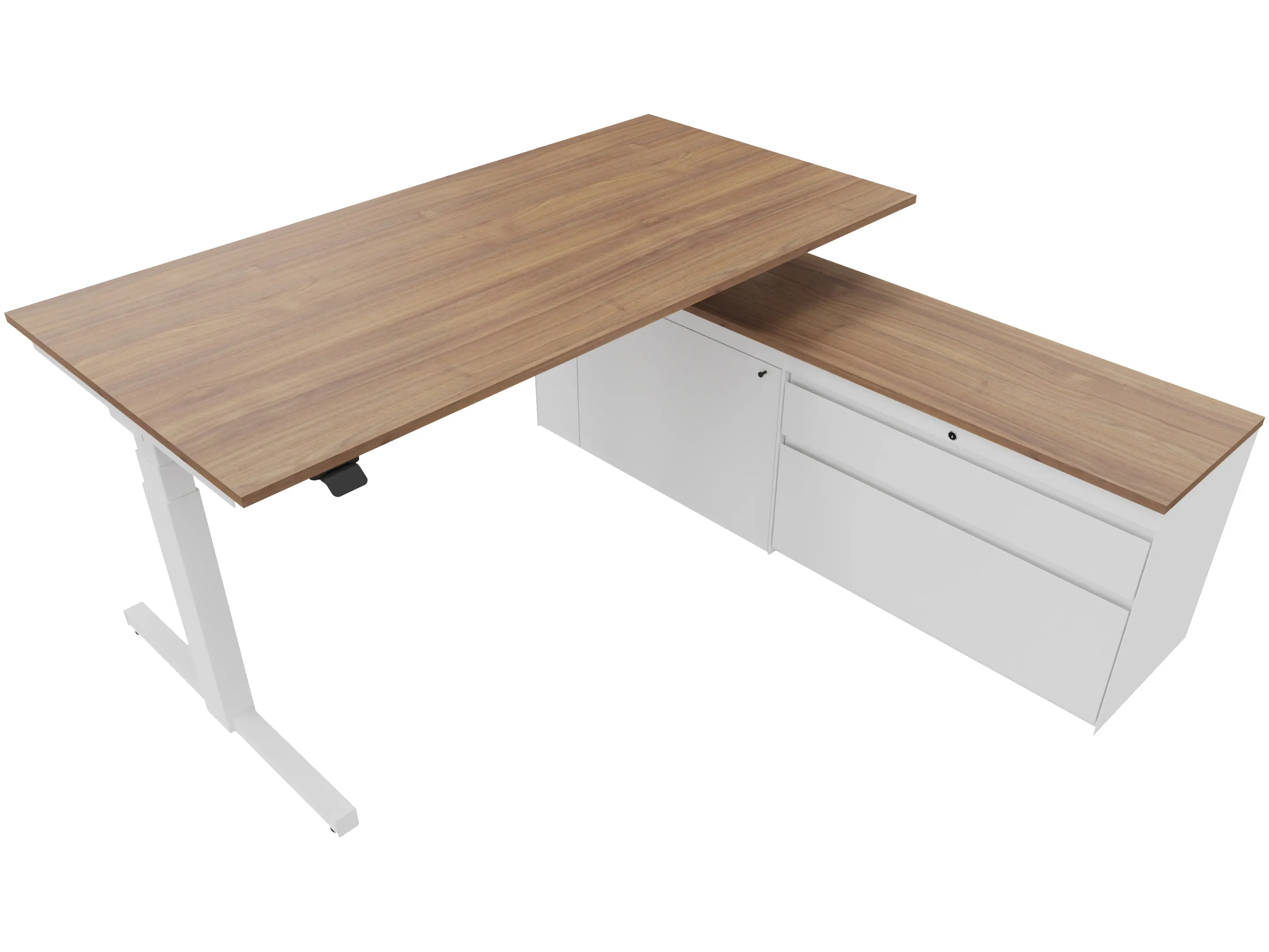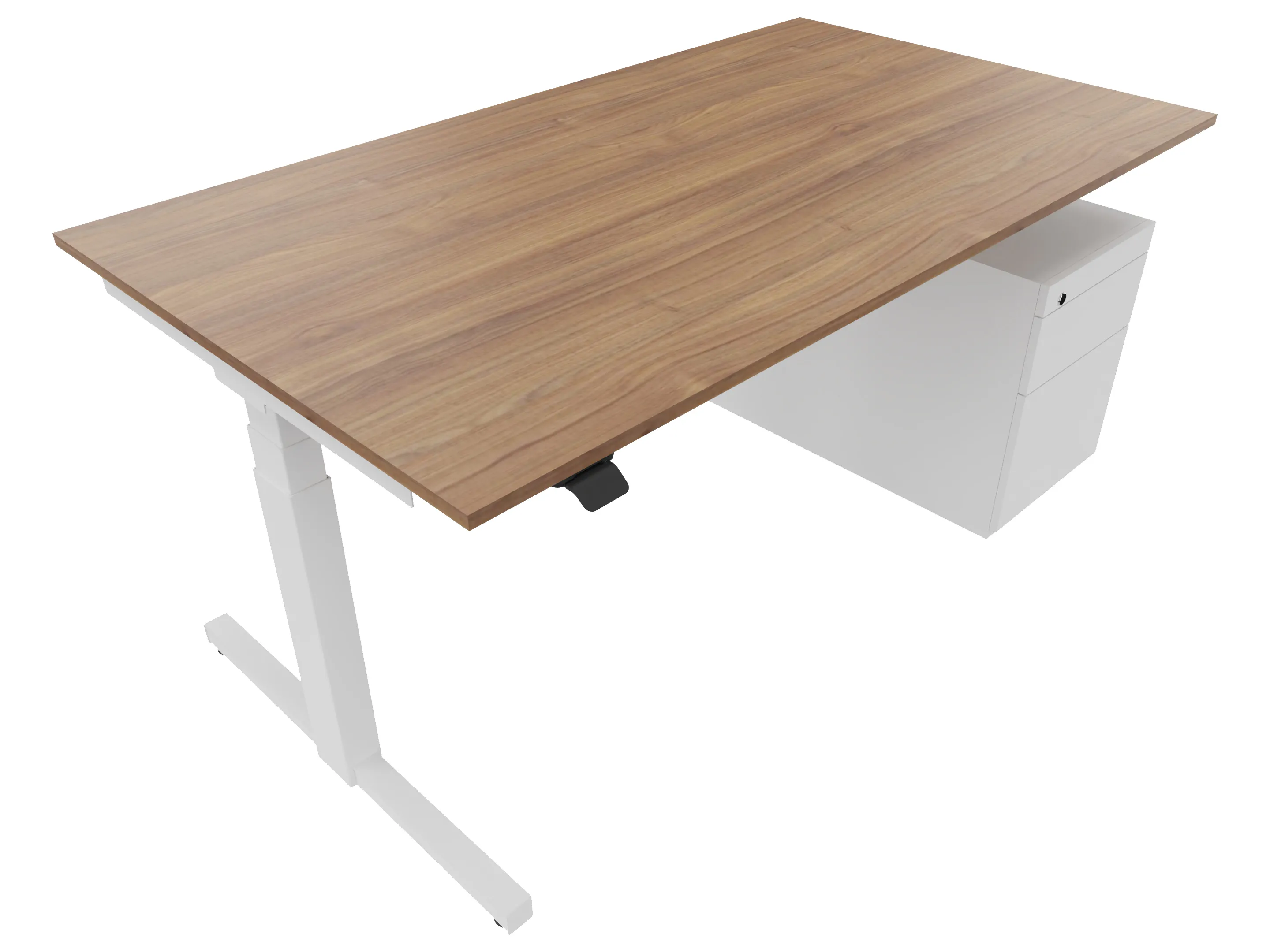 Zit-sta bureau, elektrisch verstelbaar tussen 640-1300mm, compleet met 1 werkblad van 1600 x 900mm, T-poten en hoog-Raag bediening (gemonteerd onder blad), kast (rechts gemonteerd), met 2 lades en één draaideur.