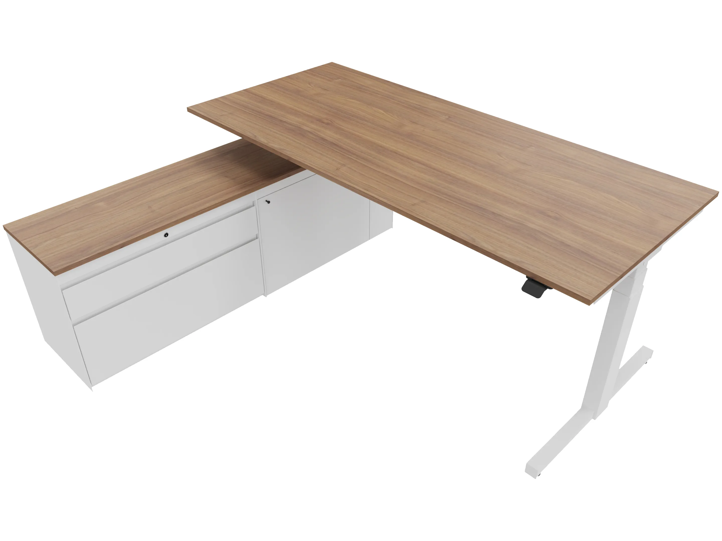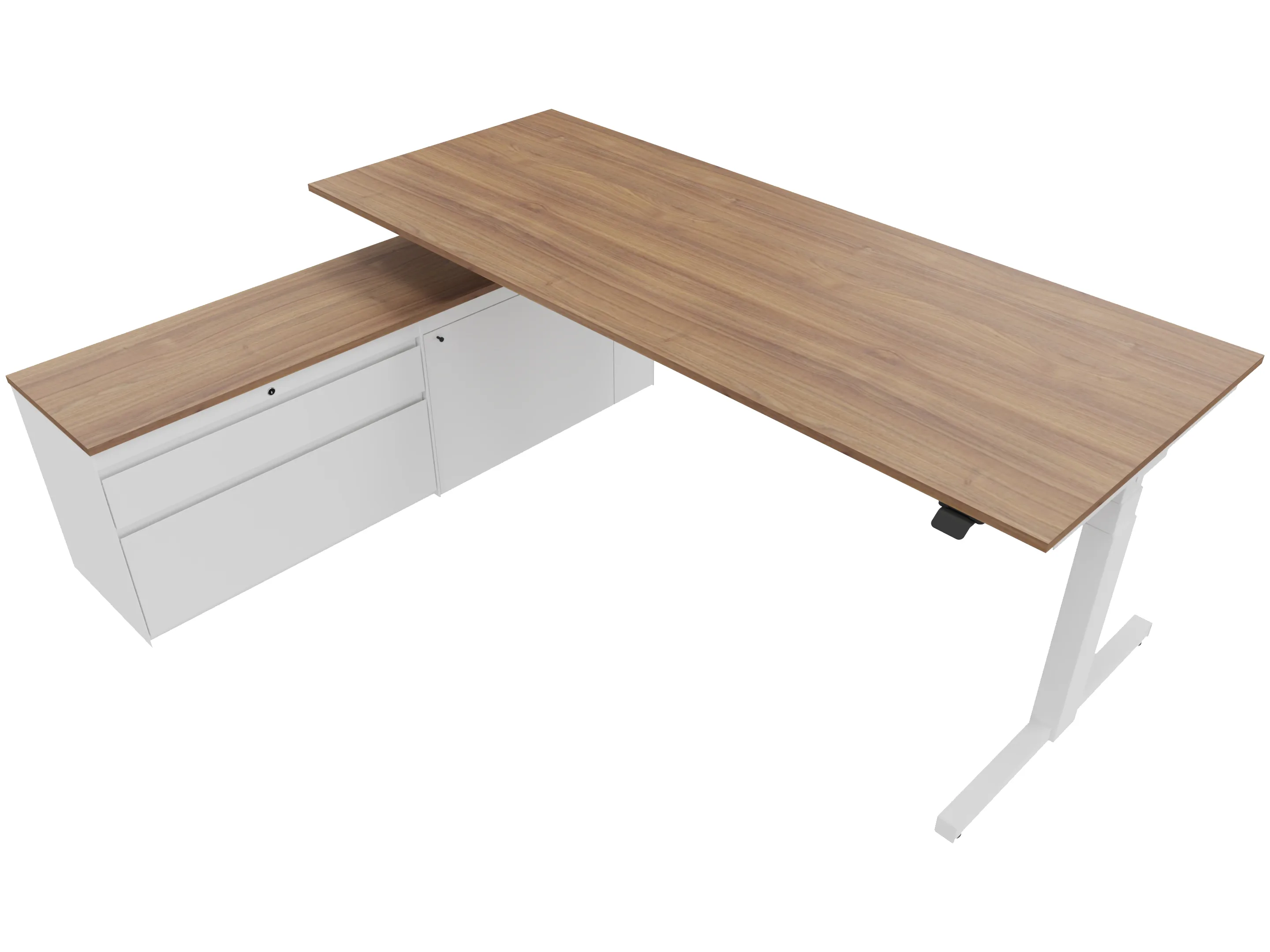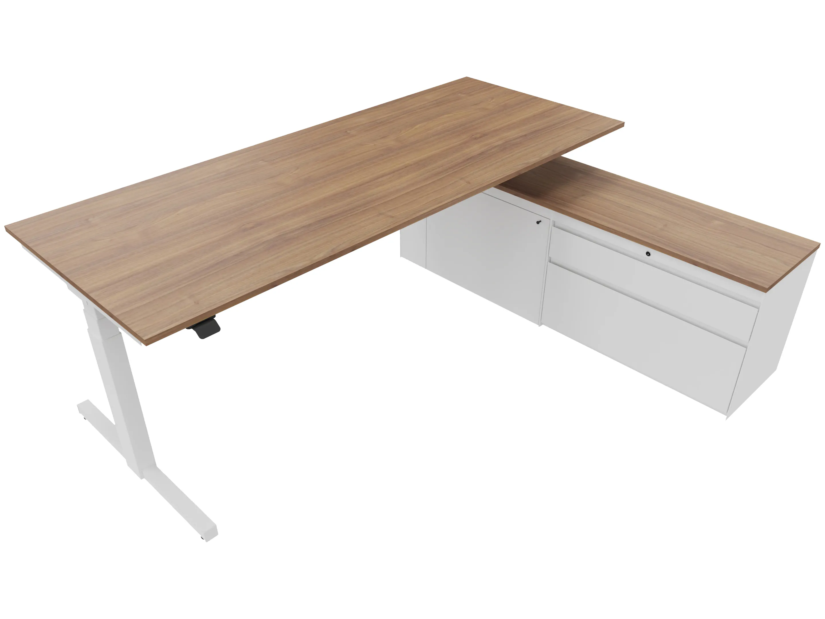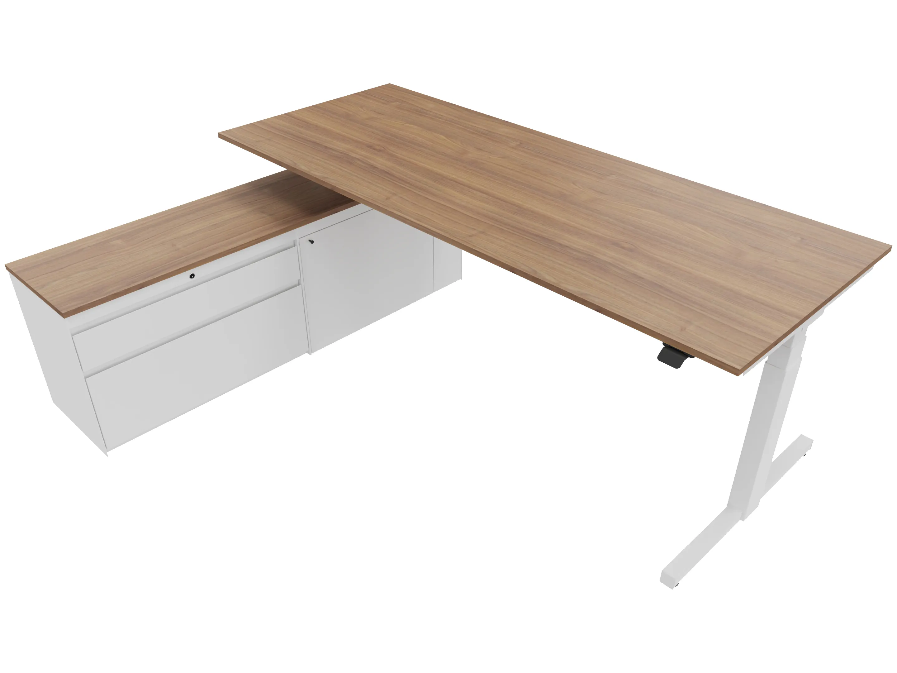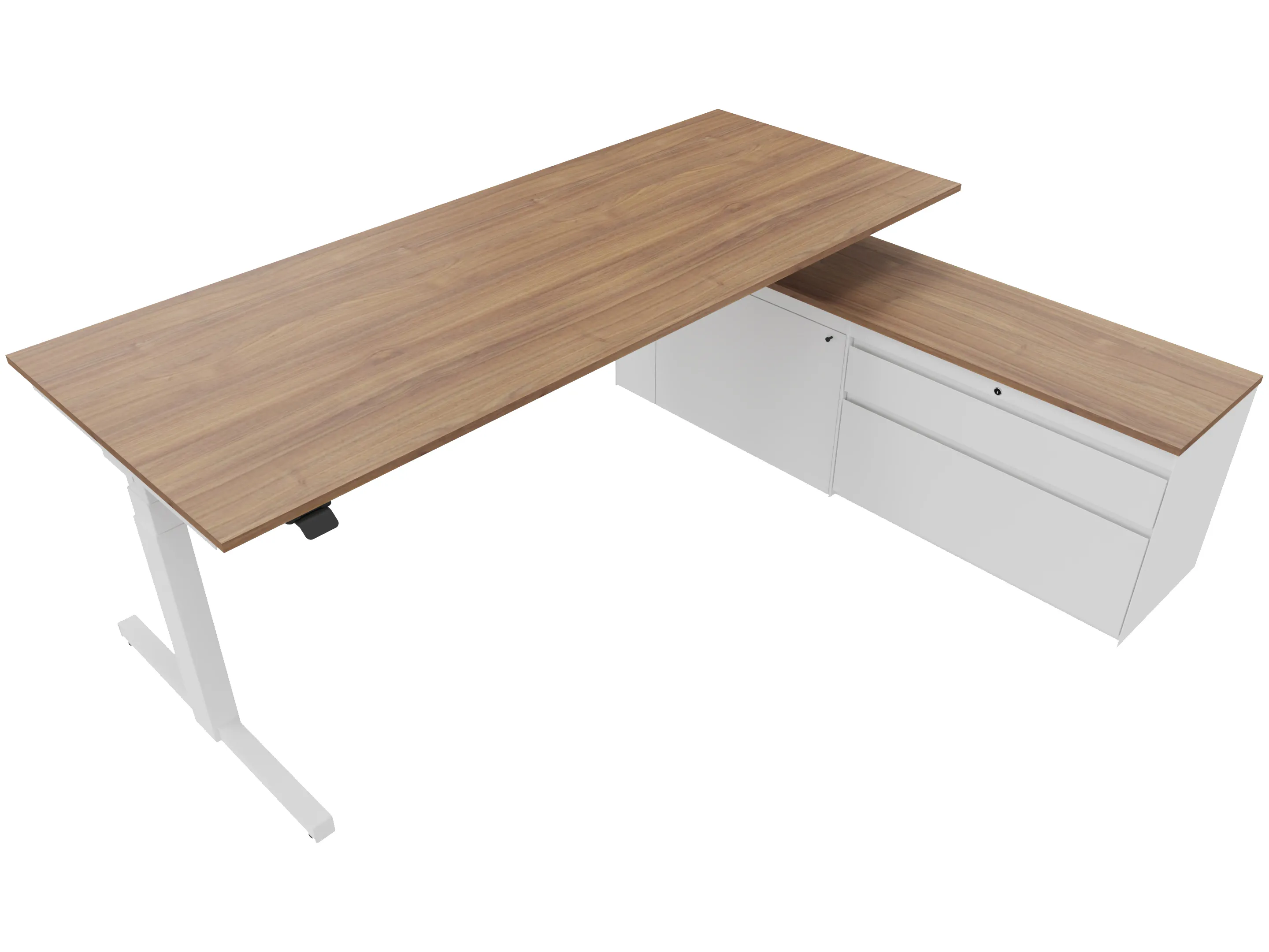 Zit-sta bureau, elektrisch verstelbaar tussen 640-1300mm, compleet met 1 werkblad van 1600 x 900mm, T-poten en hoog-Raag bediening (gemonteerd onder blad), kast (rechts gemonteerd), met 2 lades en één draaideur.