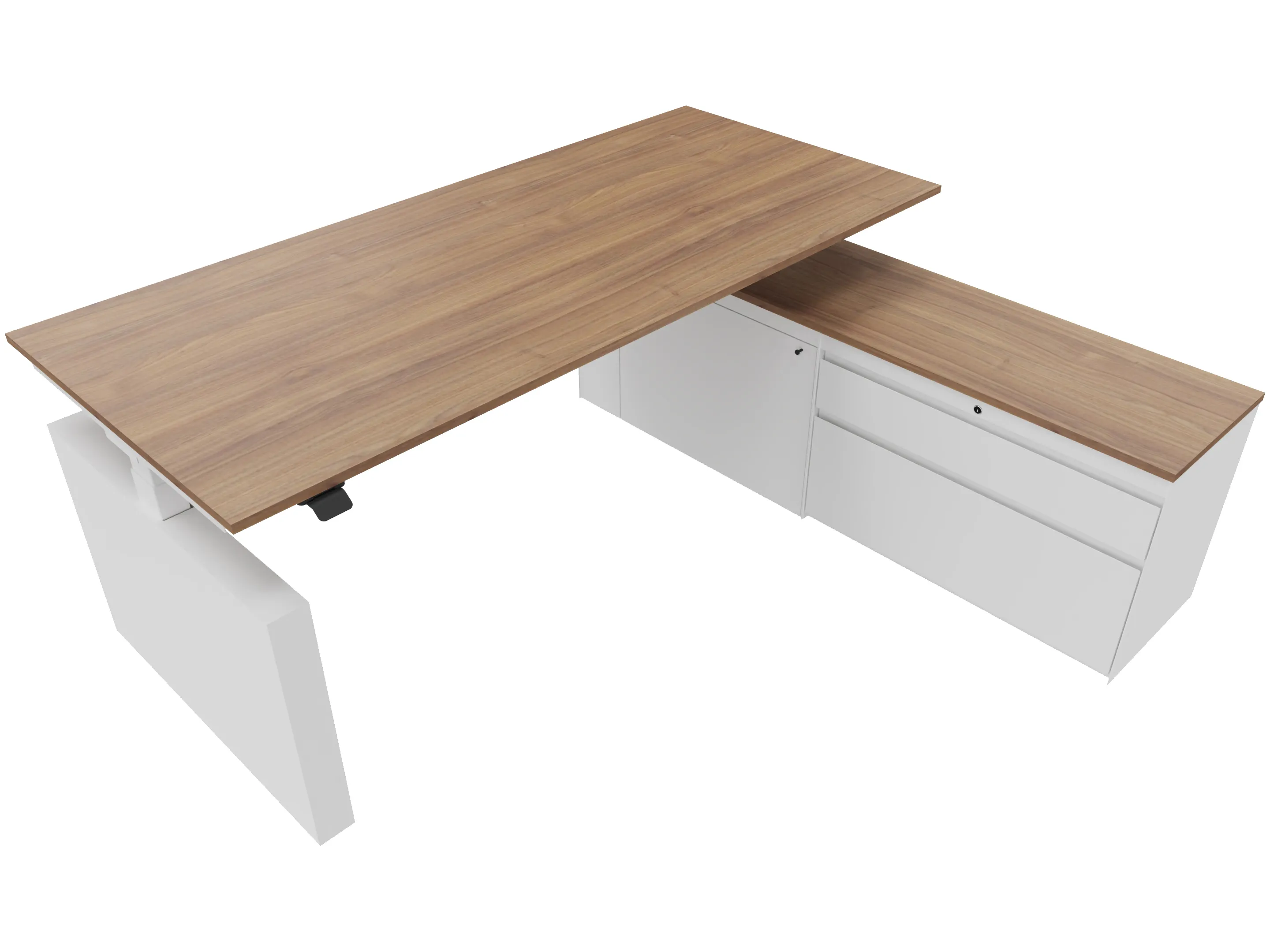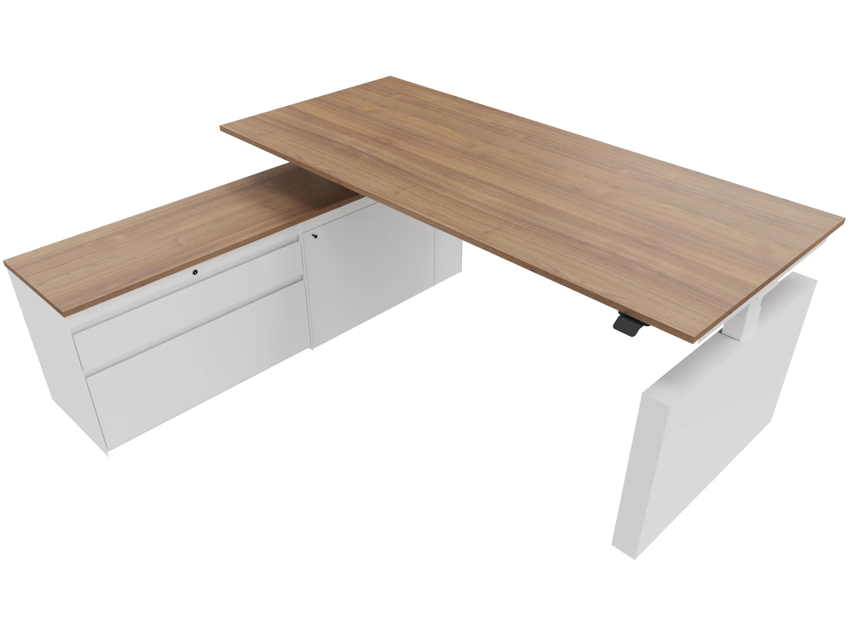 Zit-sta bureau, elektrisch verstelbaar tussen 640-1300mm, compleet met 1 werkblad van 2000 x 900mm, wangpoten en hoog-laag bediening (gemonteerd onder blad), kast (links gemonteerd), met 2 lades en één draaideur.