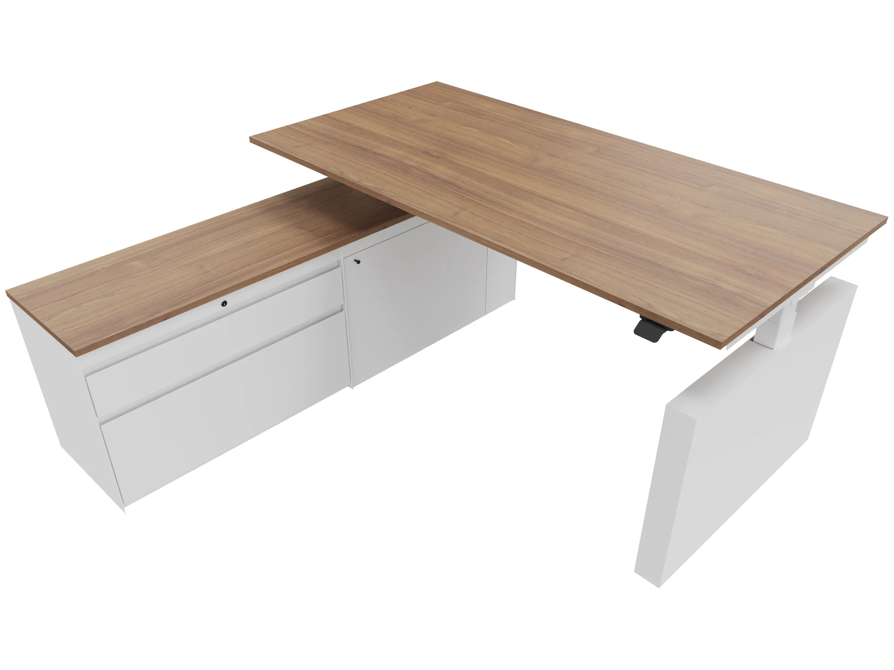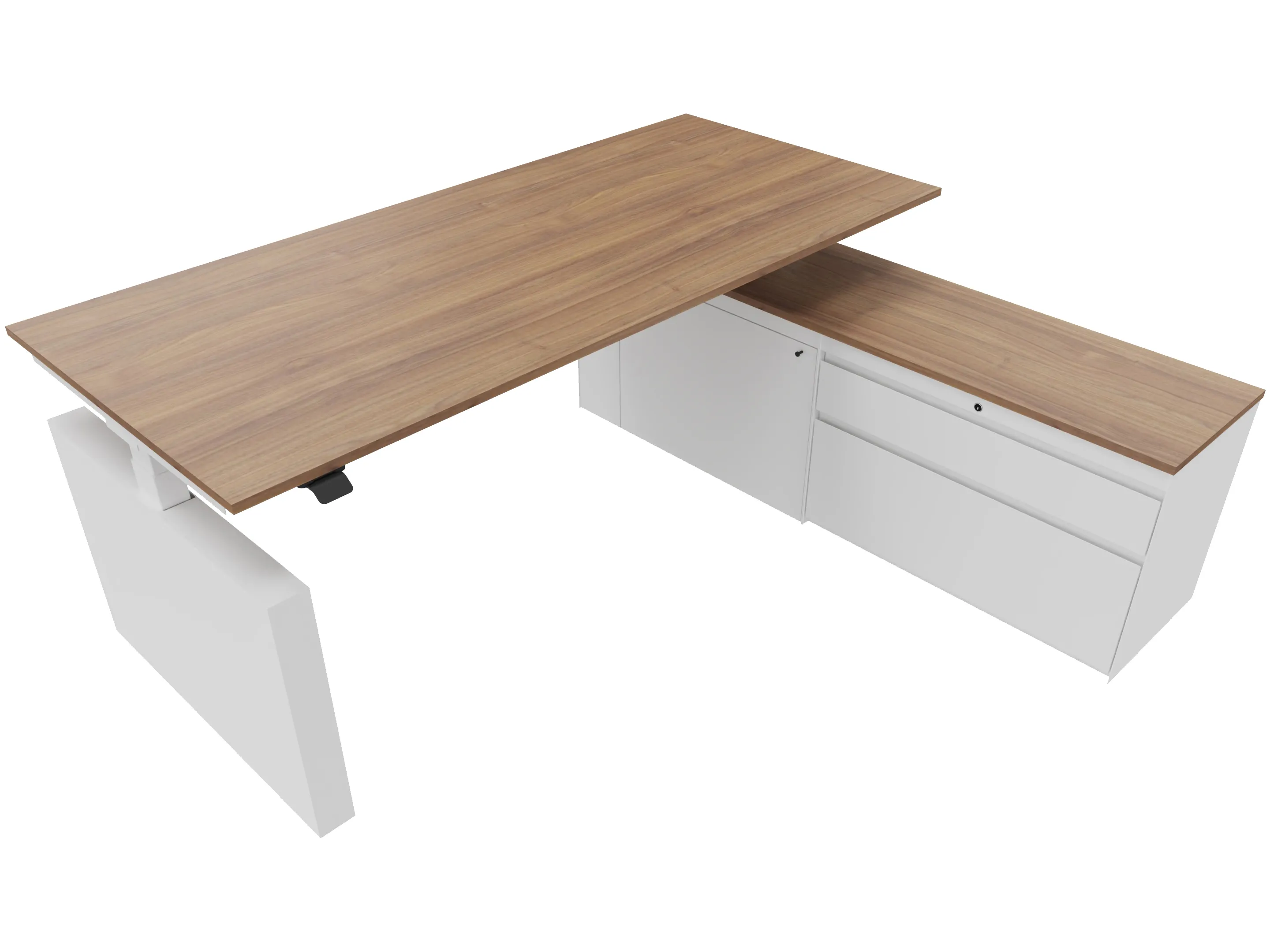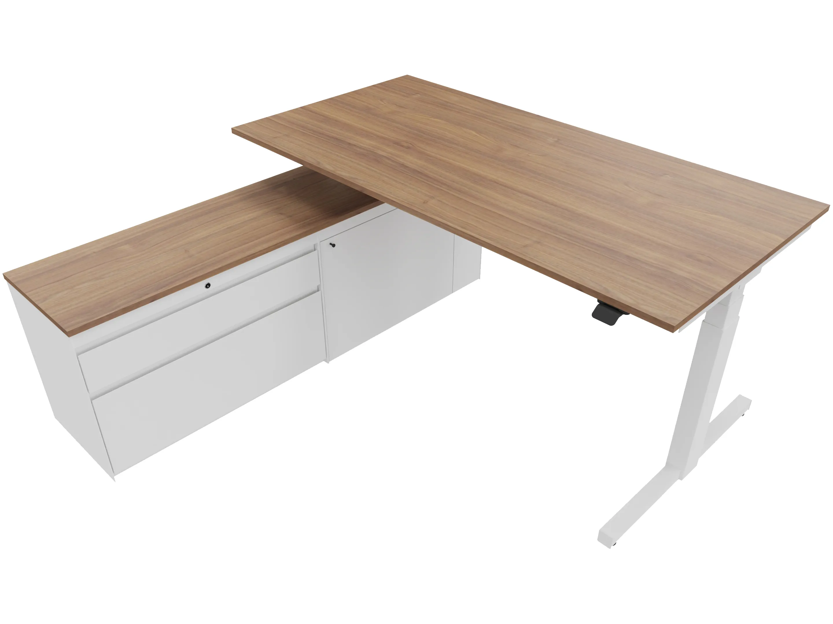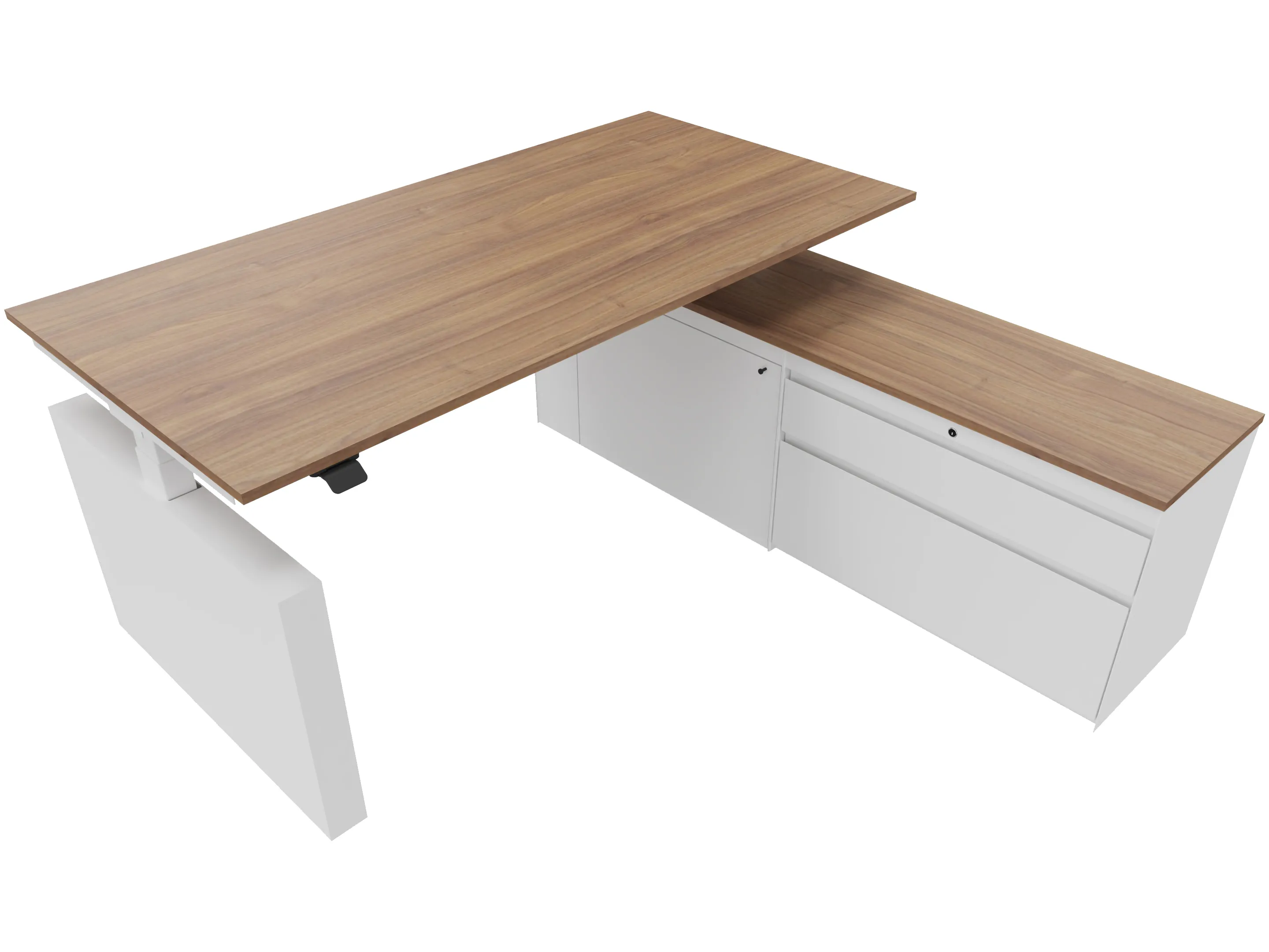 Zit-sta bureau, elektrisch verstelbaar tussen 640-1300mm, compleet met 1 werkblad van 1600 x 900mm, wangpoten en hoog-Raag bediening (gemonteerd onder blad), kast (rechts gemonteerd), met 2 lades en één draaideur.