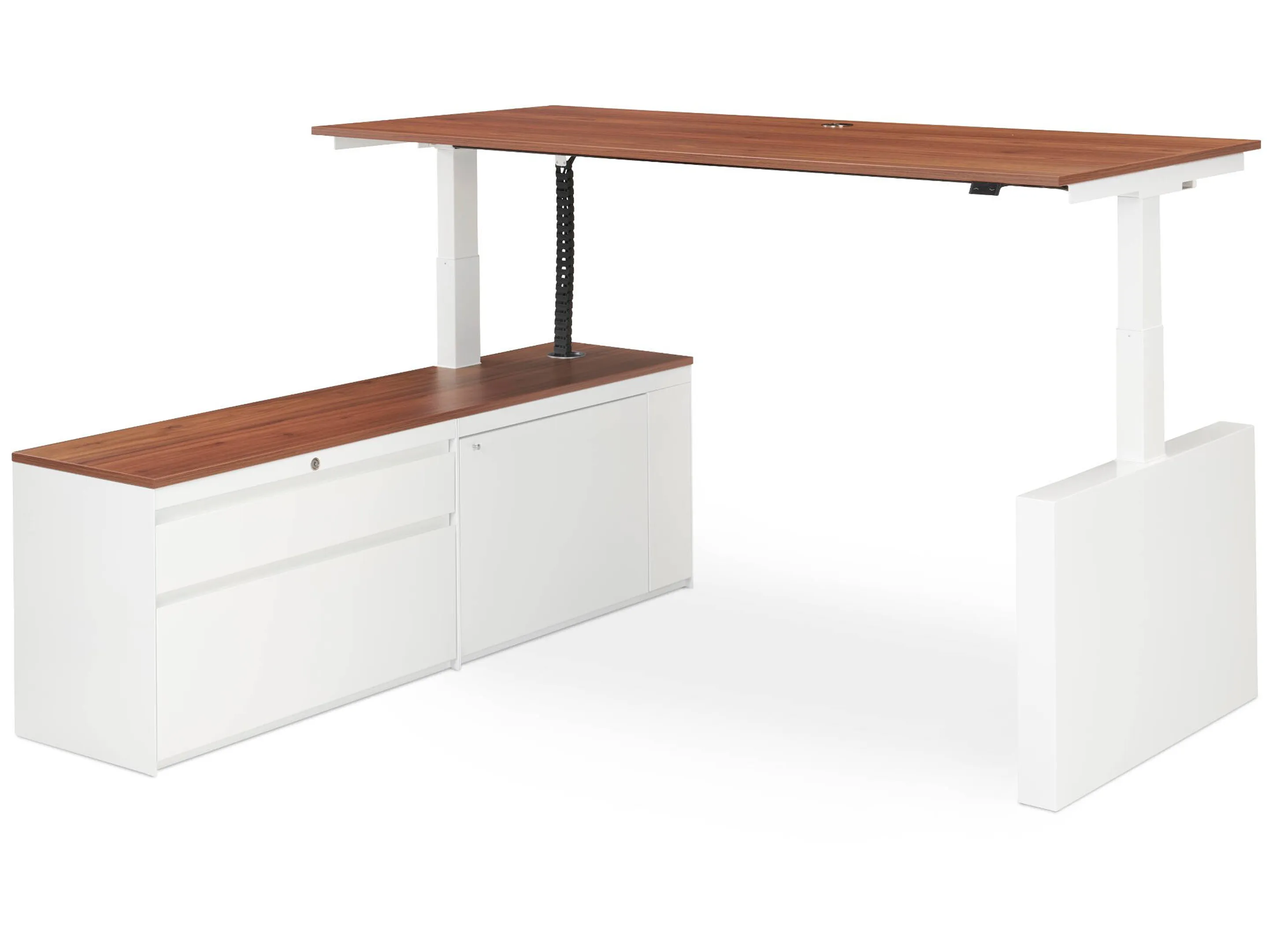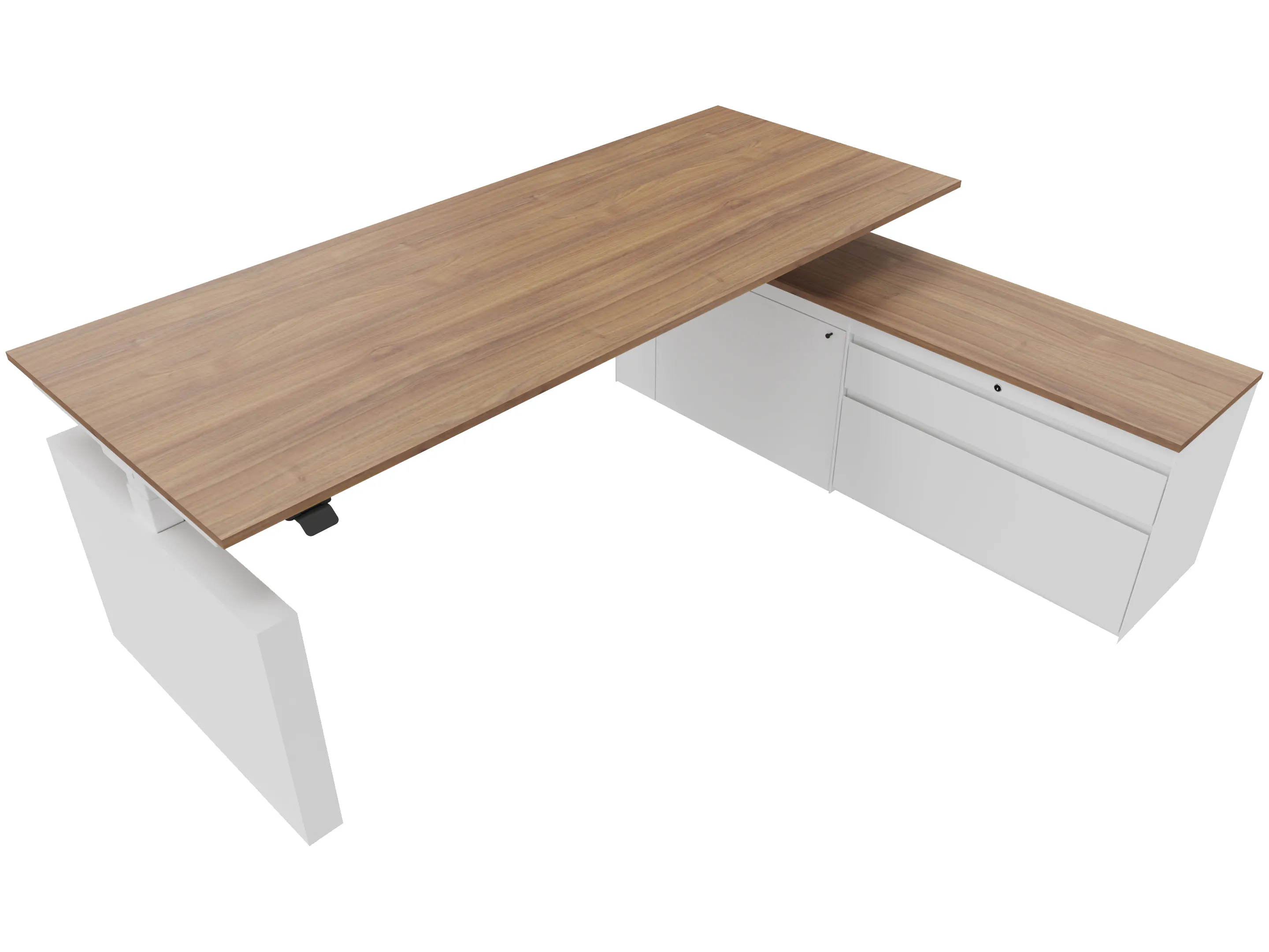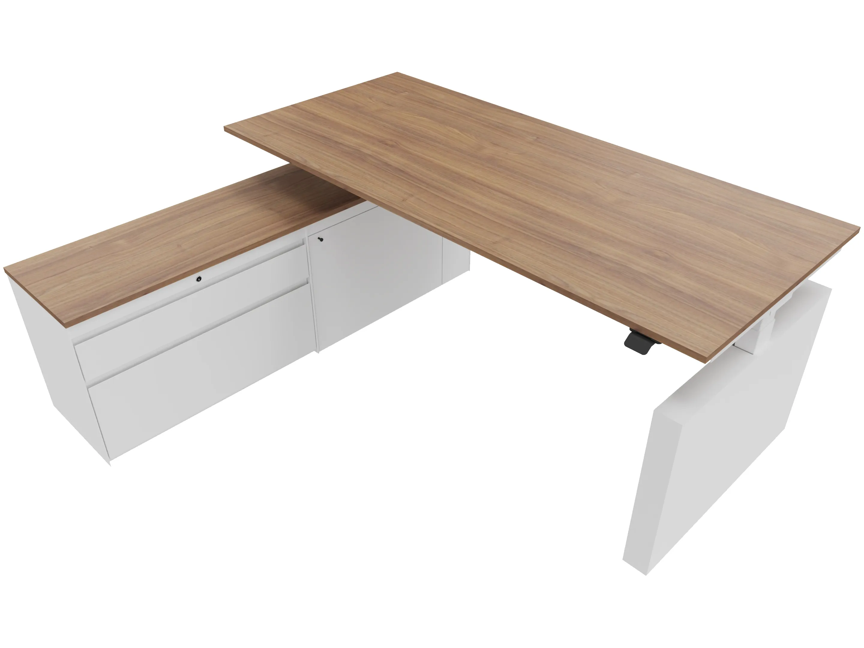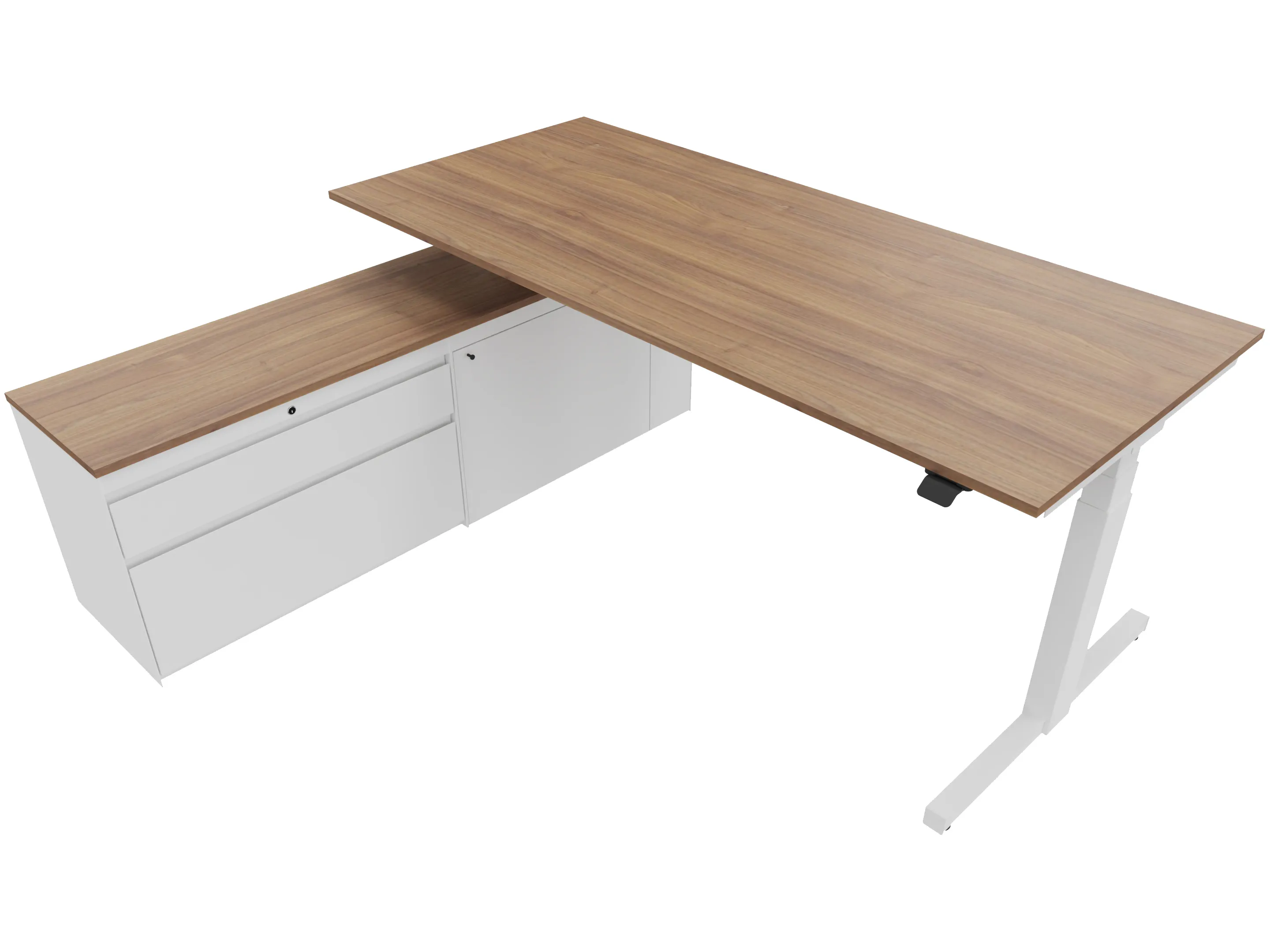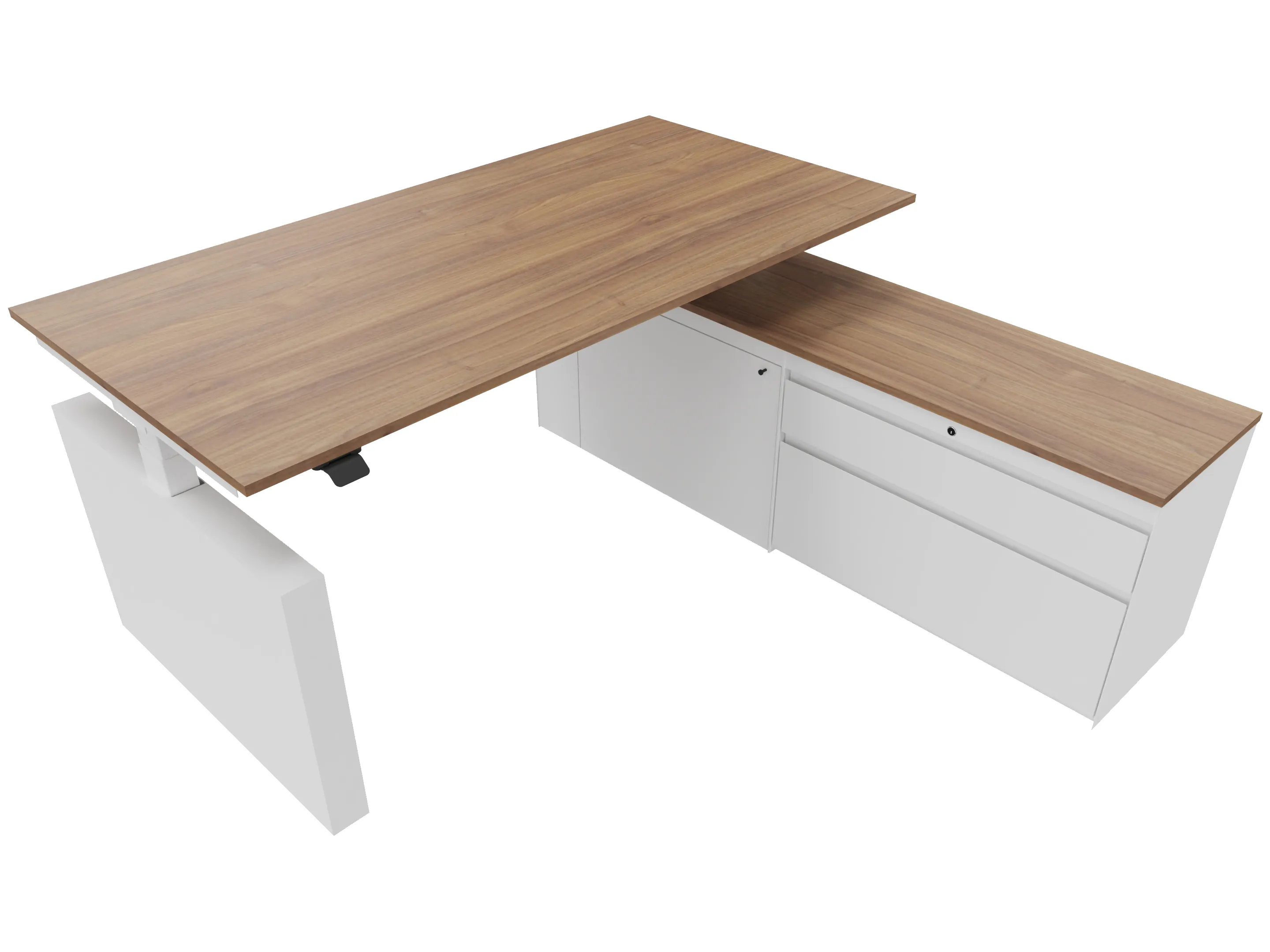 Zit-sta bureau, elektrisch verstelbaar tussen 640-1300mm, compleet met 1 werkblad van 1600 x 900mm, wangpoten en hoog-Raag bediening (gemonteerd onder blad), kast (rechts gemonteerd), met 2 lades en één draaideur.