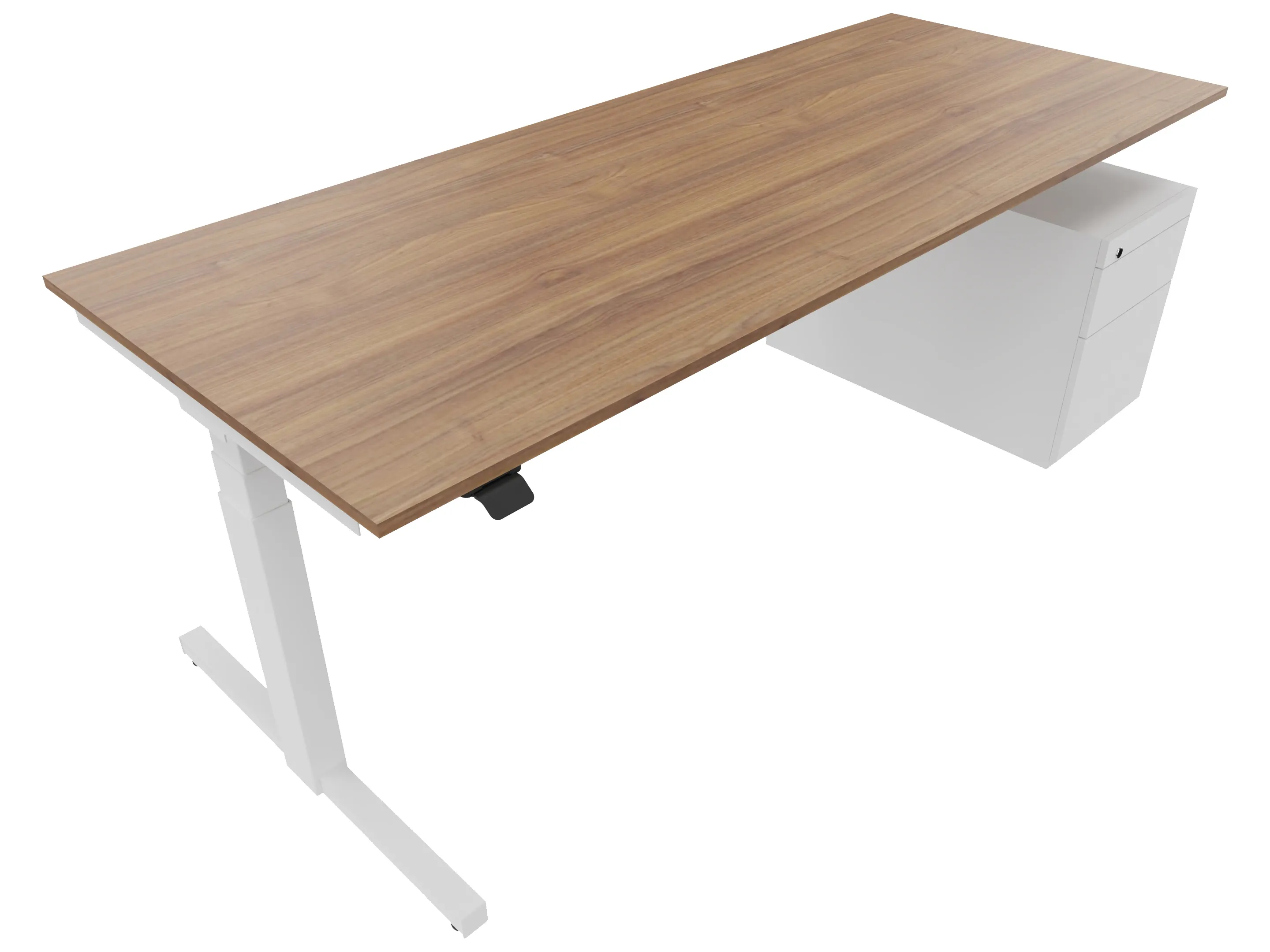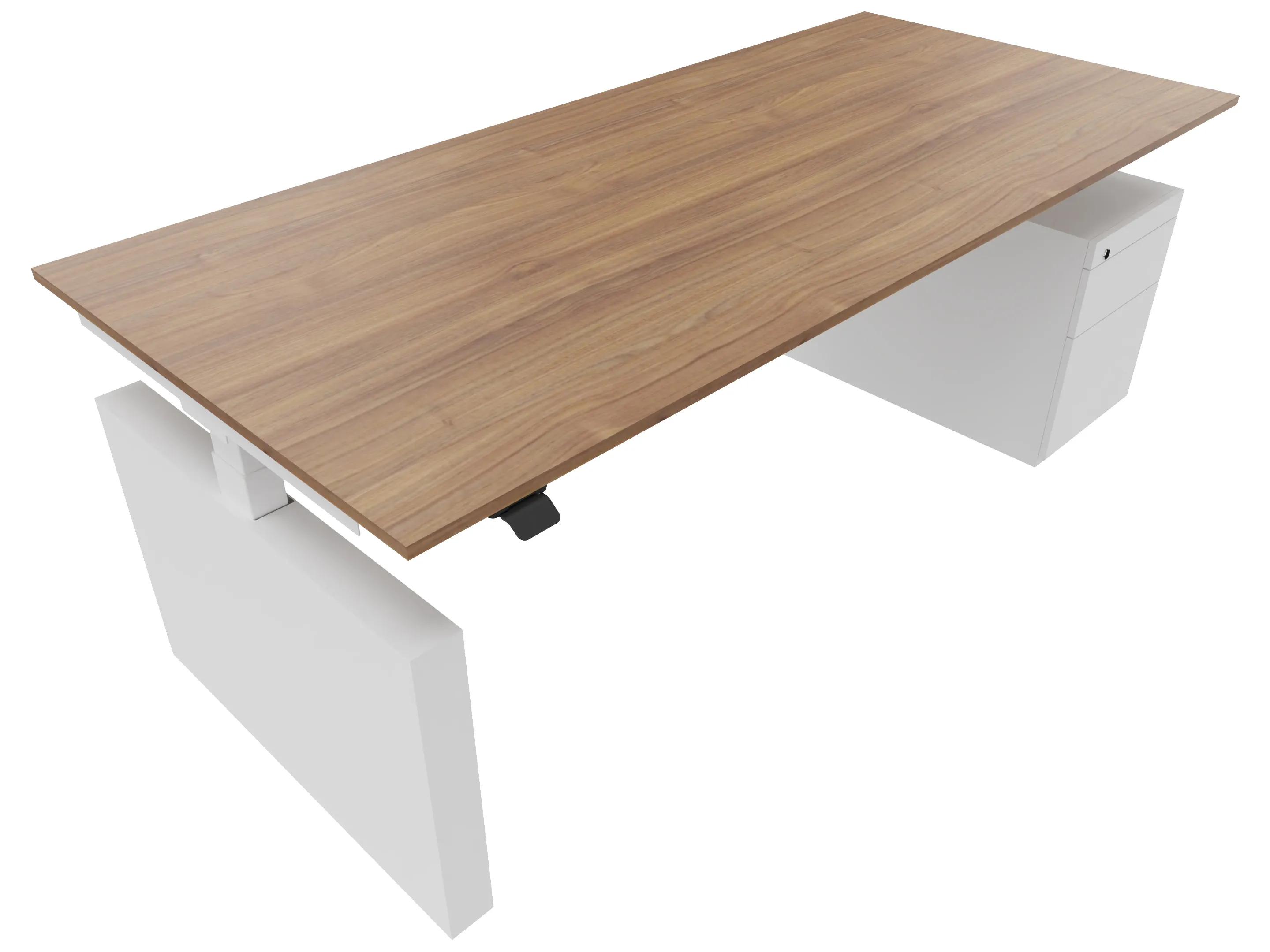 Zit-sta bureau, elektrisch verstelbaar tussen 640-1300mm, compleet met 1 werkblad van 1800 x 800mm, wangpoten en hoog-laag bediening (gemonteerd onder blad), ladenblok (links gemonteerd), met hangmappenlade.