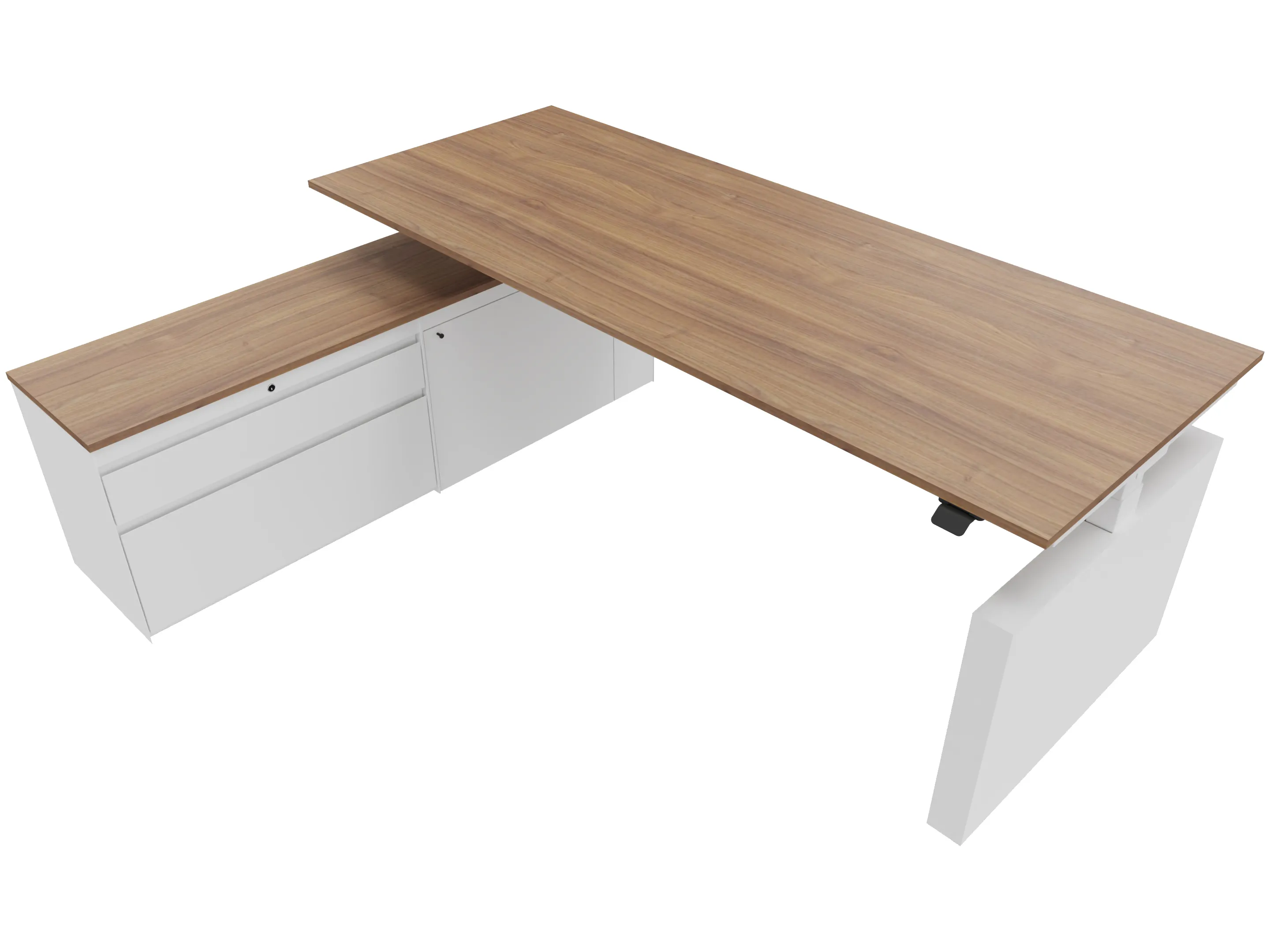 Zit-sta bureau, elektrisch verstelbaar tussen 640-1300mm, compleet met 1 werkblad van 1600 x 900mm, wangpoten en hoog-laag bediening (gemonteerd onder blad), kast (links gemonteerd), met 2 lades en één draaideur.