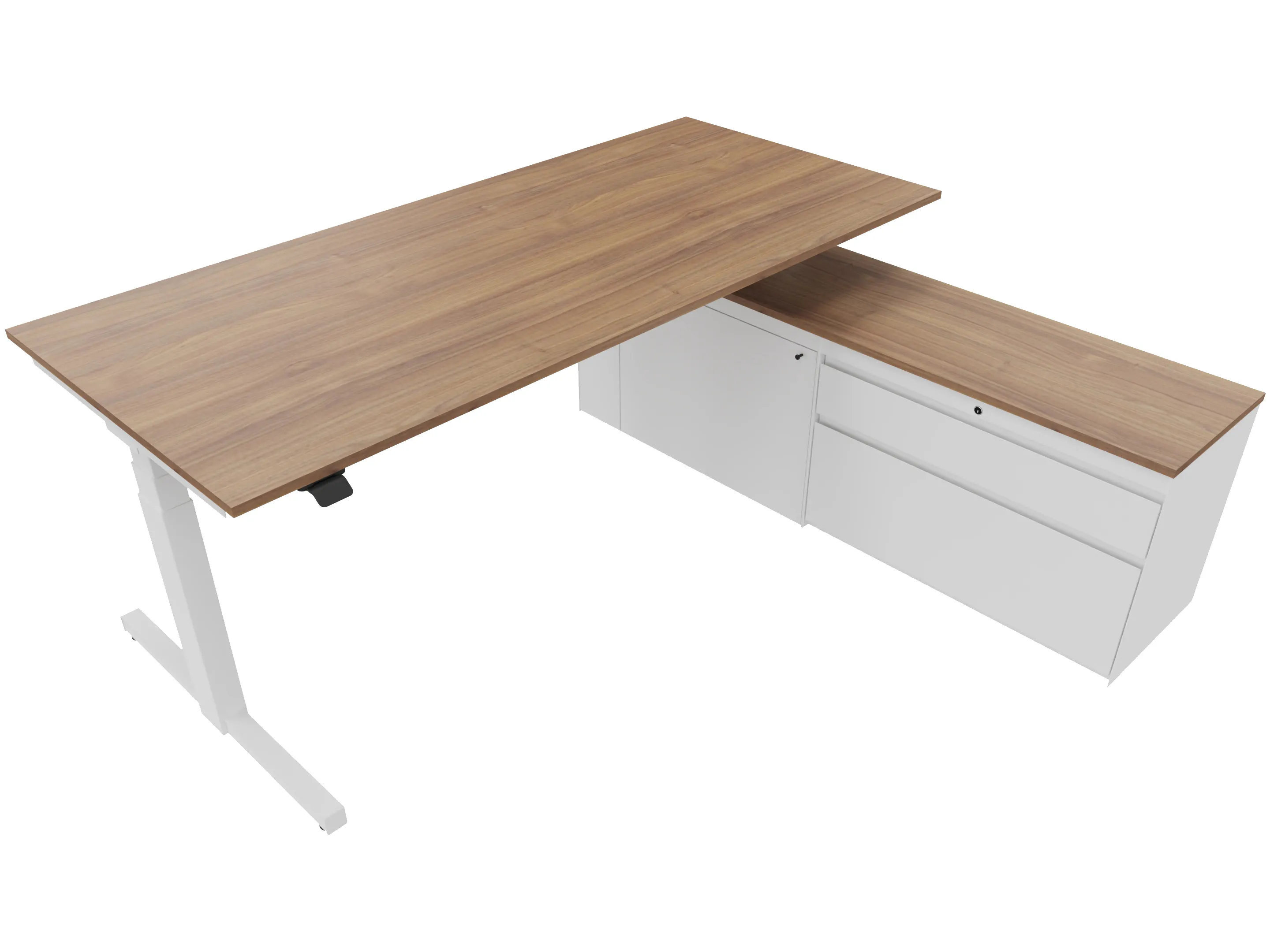 Zit-sta bureau, elektrisch verstelbaar tussen 640-1300mm, compleet met 1 werkblad van 2000 x 900mm, T-poten en hoog-laag bediening (gemonteerd onder blad), kast (links gemonteerd), met 2 lades en één draaideur.