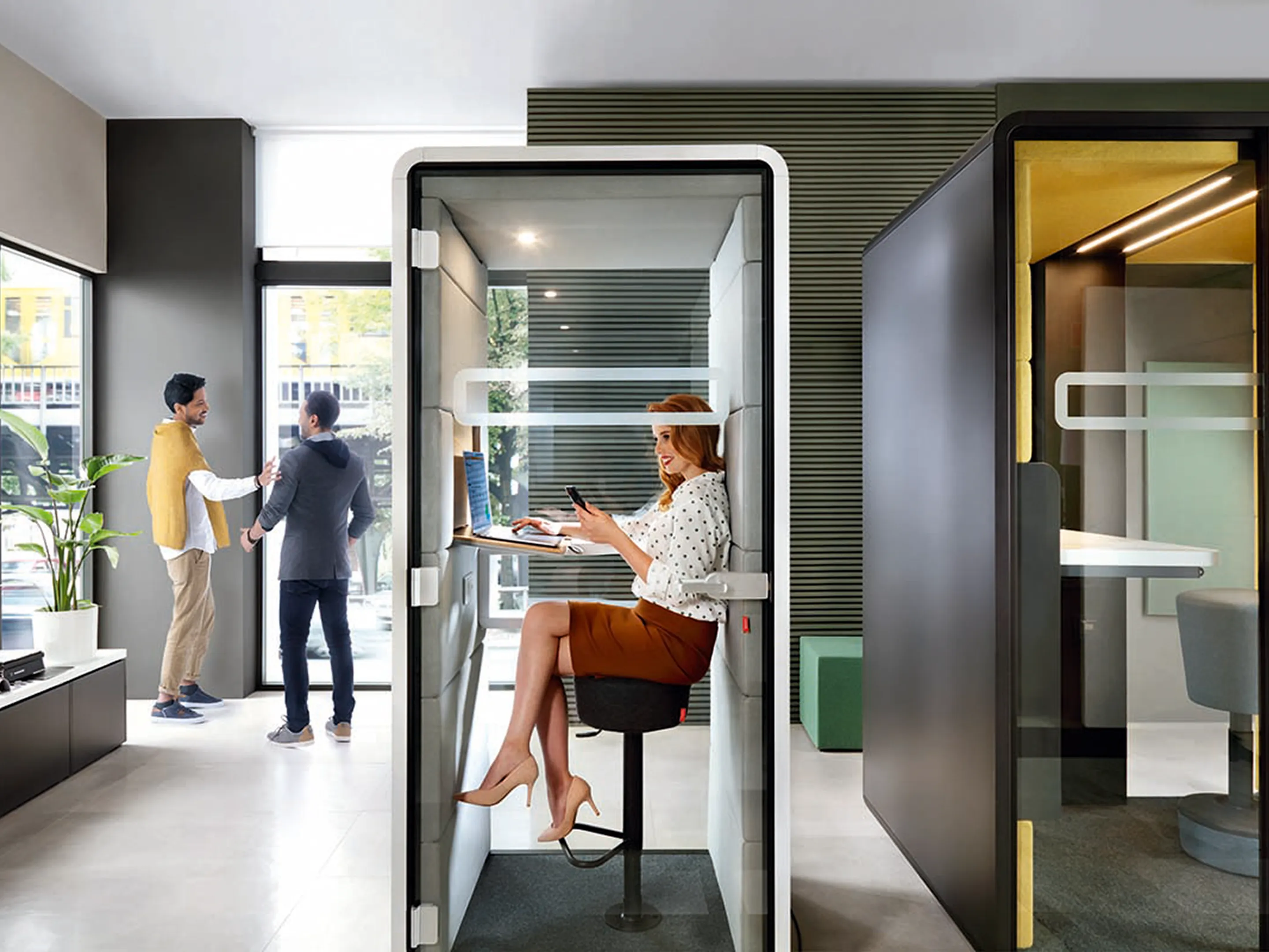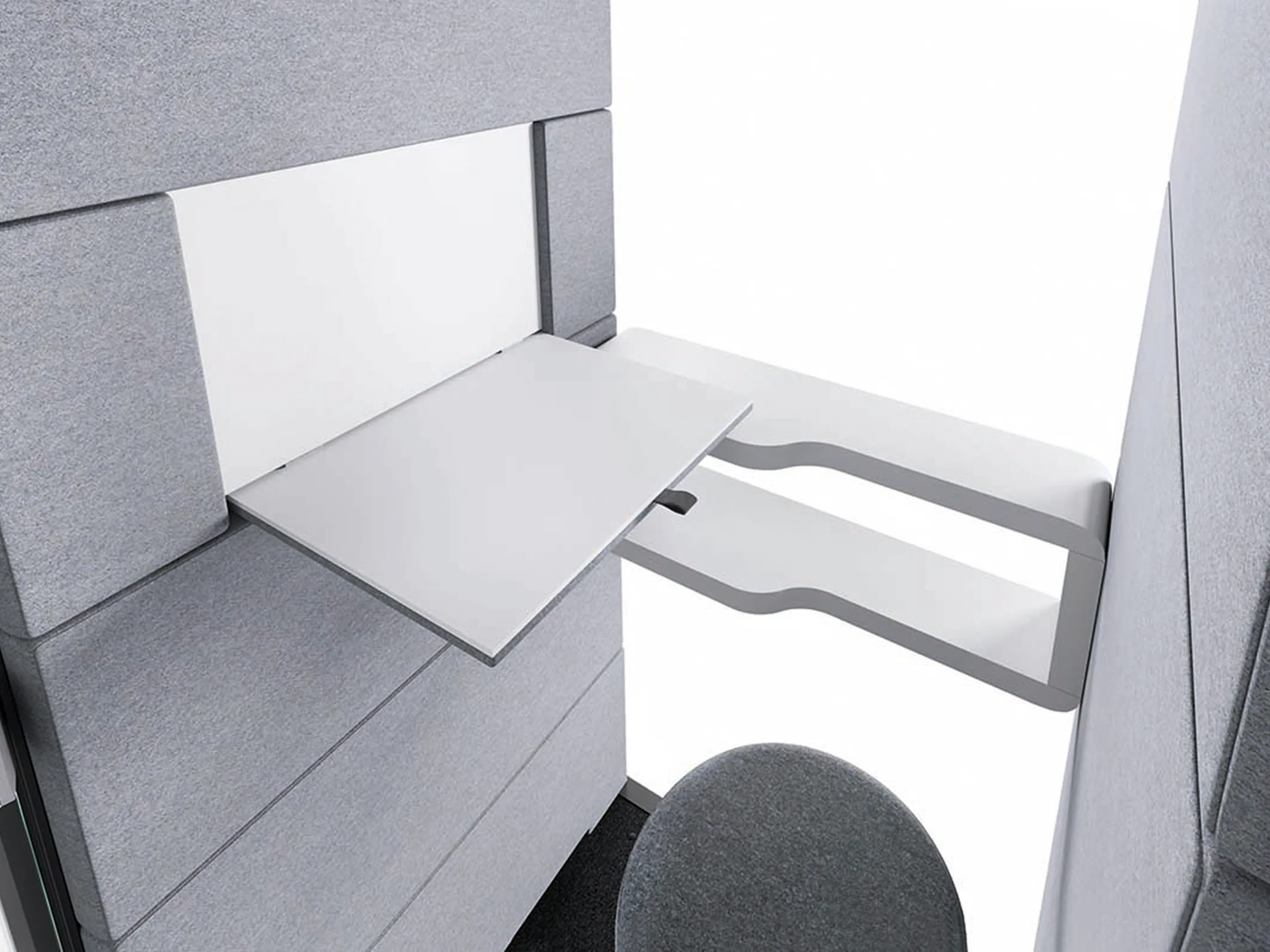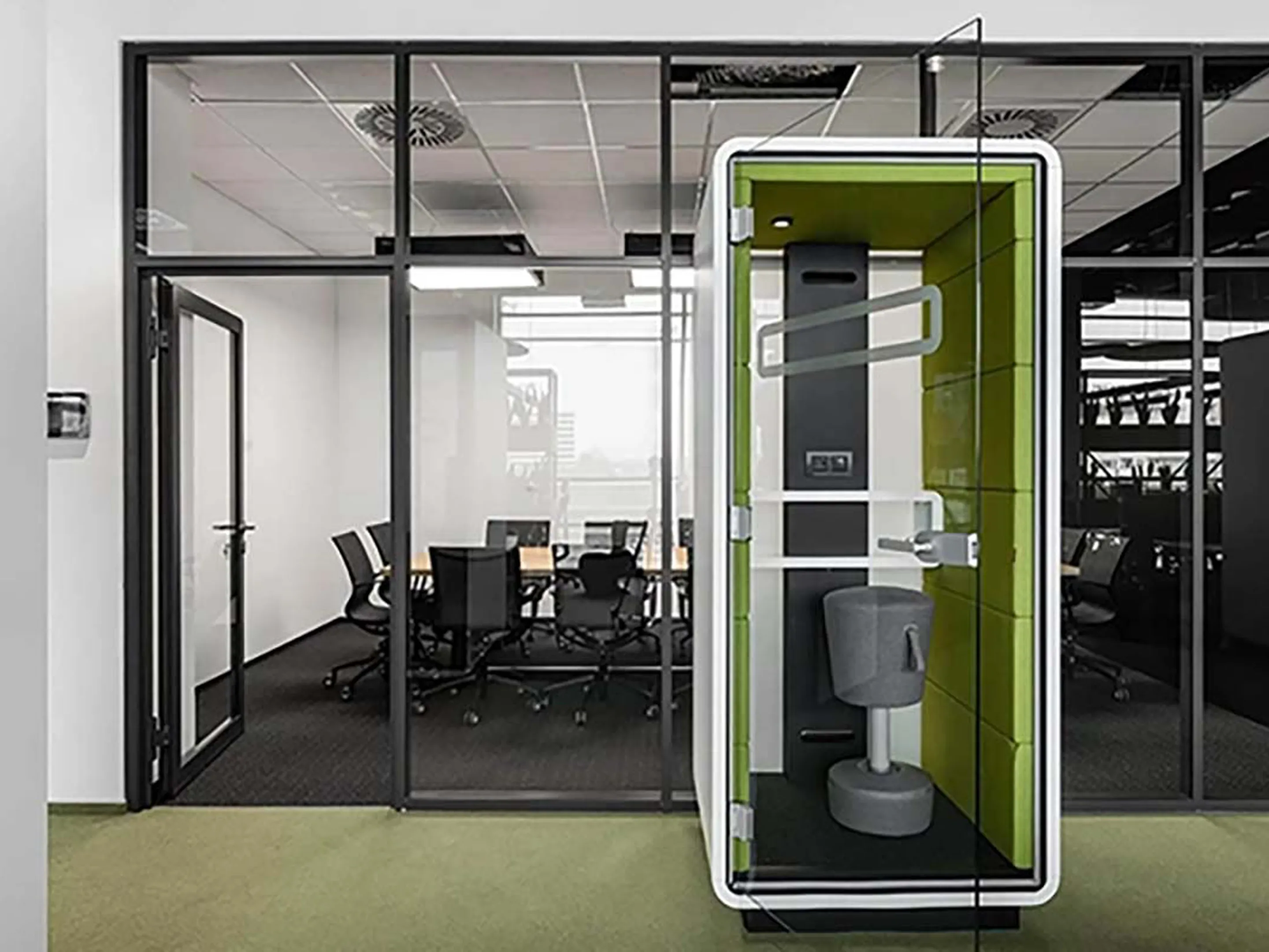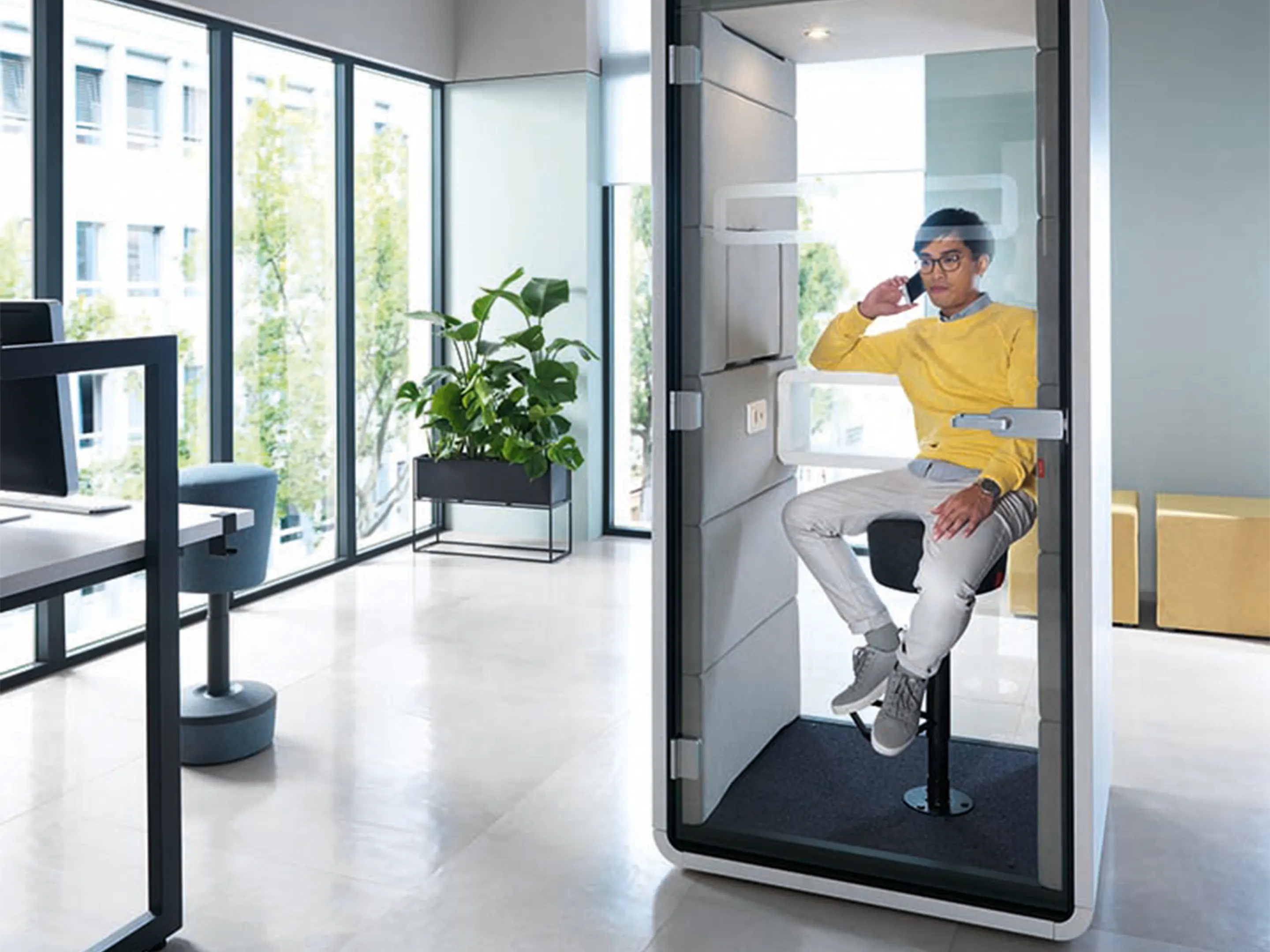 Akoestische belmodule: afmeting: 1000 x 900 x 2230mm (BxDxH). Automatische ventilatie en verlichting, airflow: 2 fans - 110m3/h / 80sec. Incl. tapijtvloer, ergonomisch tafelblad met bergruimte, uitvouwbaar tafelblad, stelvoetjes en ingebouwde wielen.