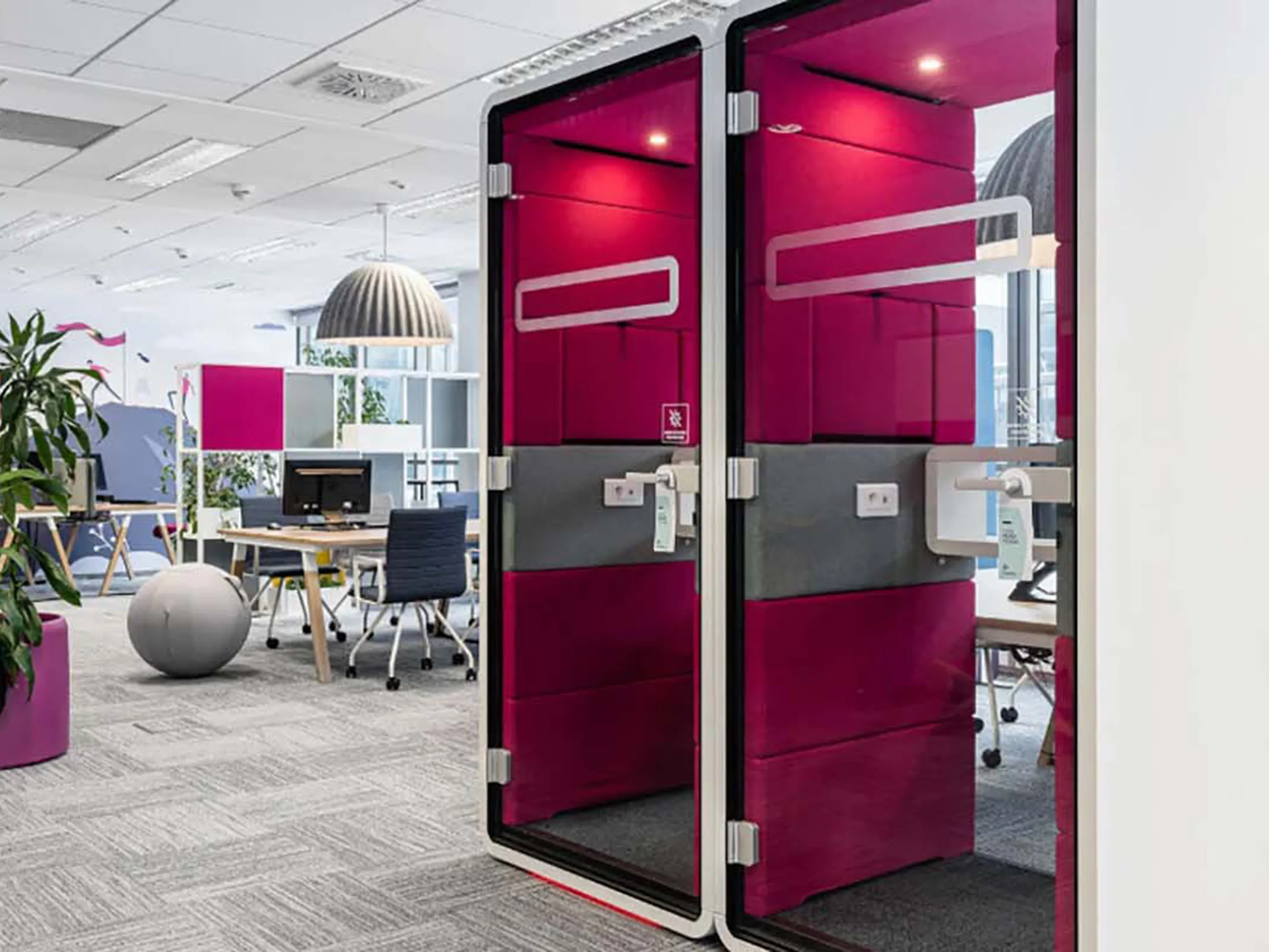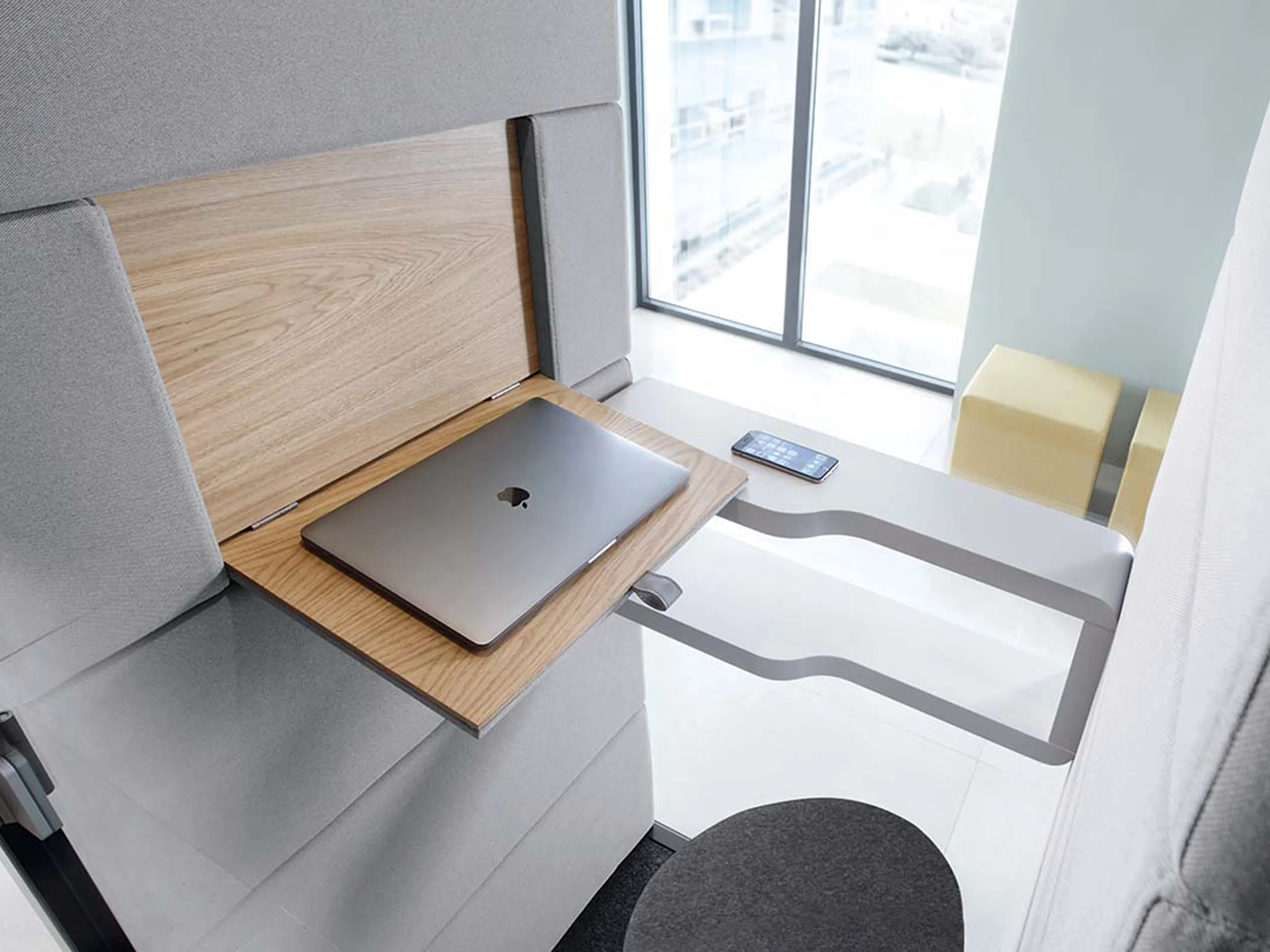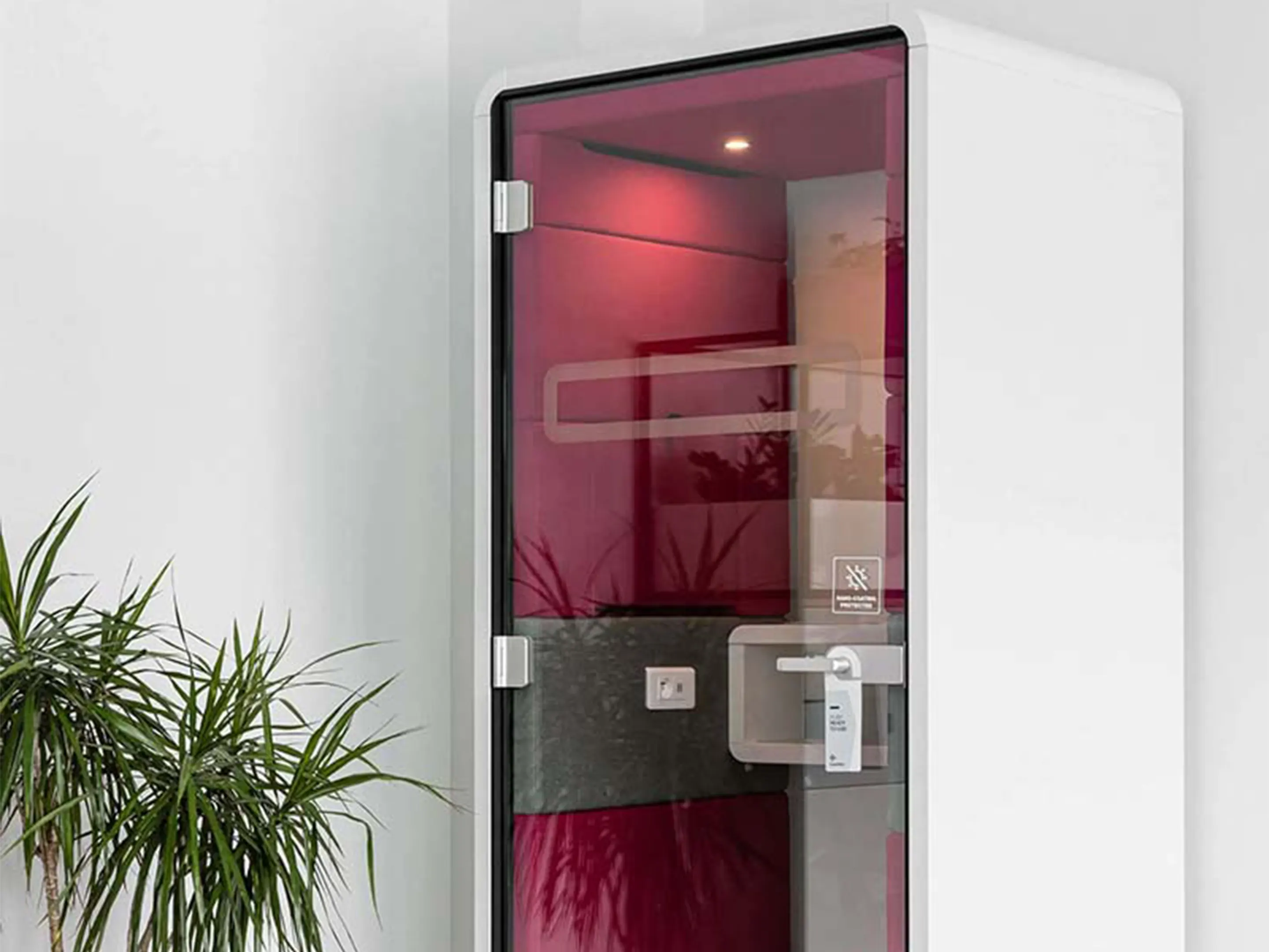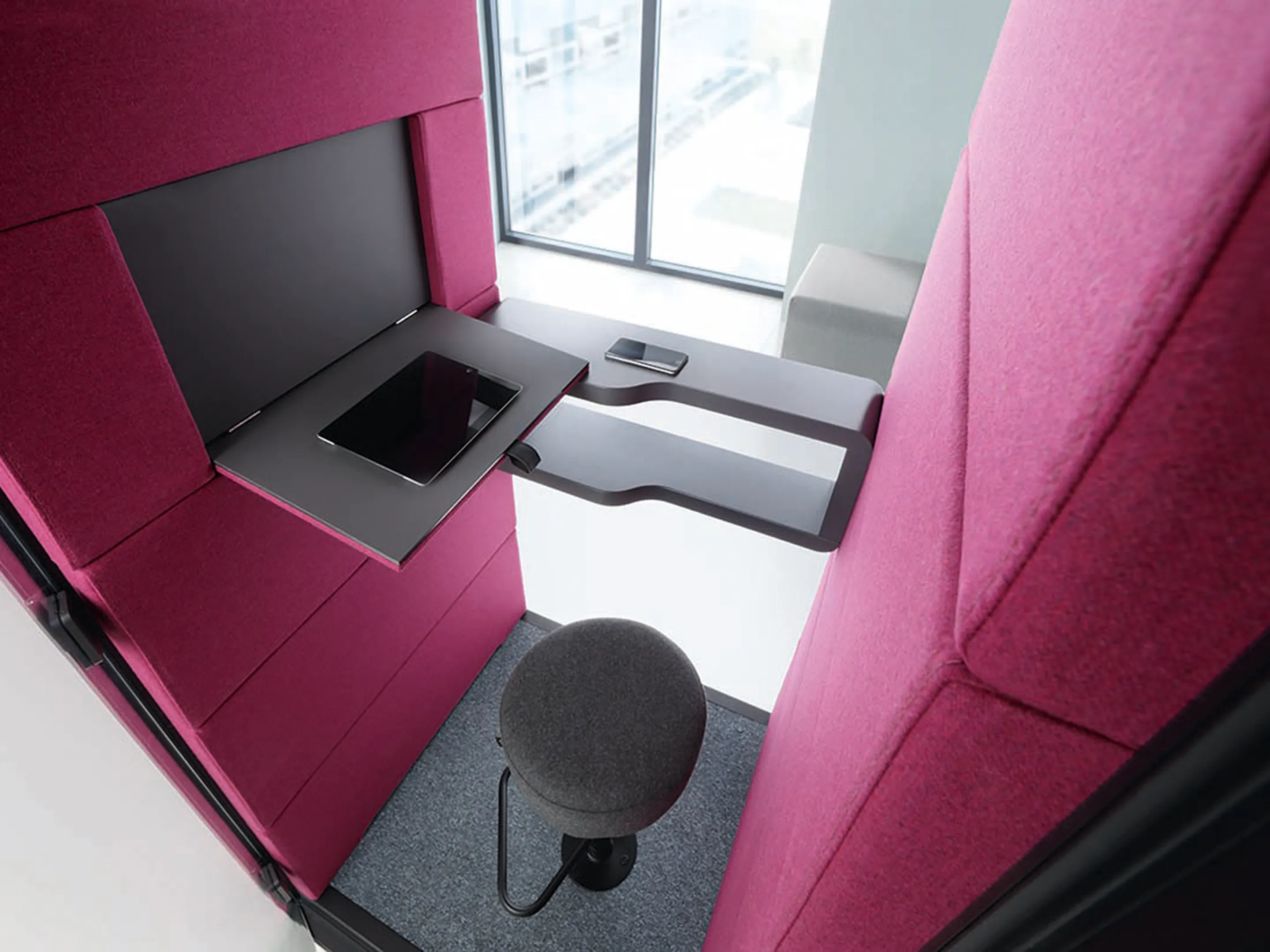 Akoestische belmodule: afmeting: 1000 x 900 x 2230mm (BxDxH). Automatische ventilatie en verlichting, airflow: 2 fans - 110m3/h / 80sec. Incl. tapijtvloer, ergonomisch tafelblad met bergruimte, uitvouwbaar tafelblad, stelvoetjes en ingebouwde wielen.