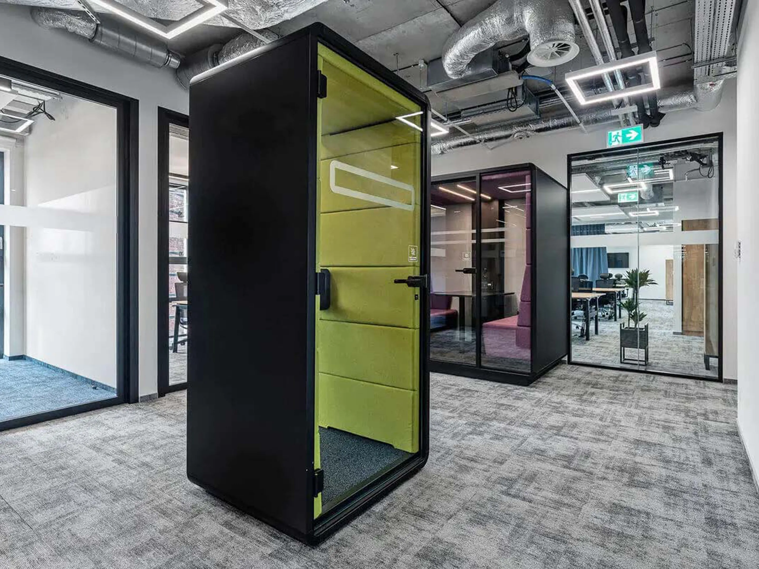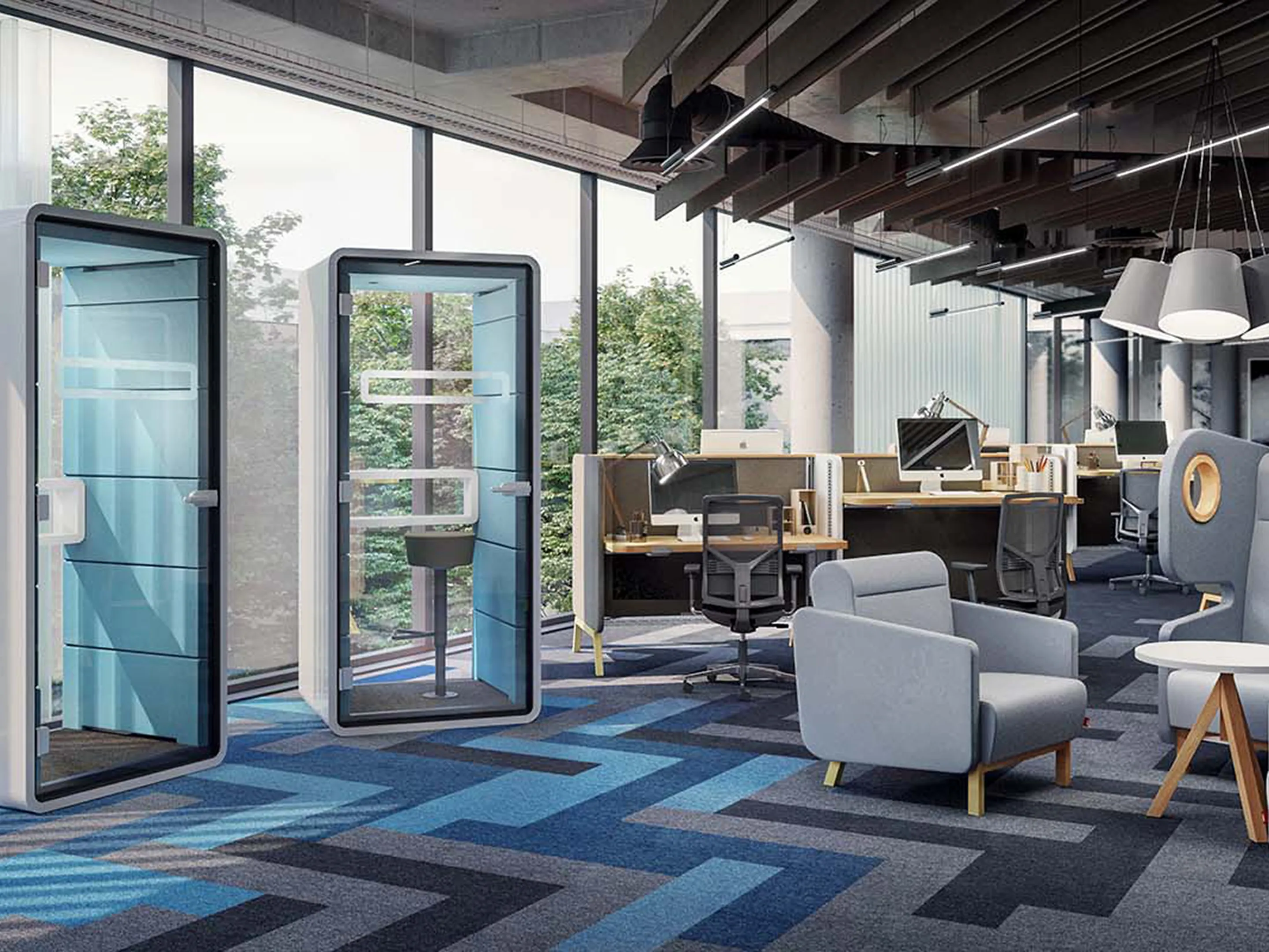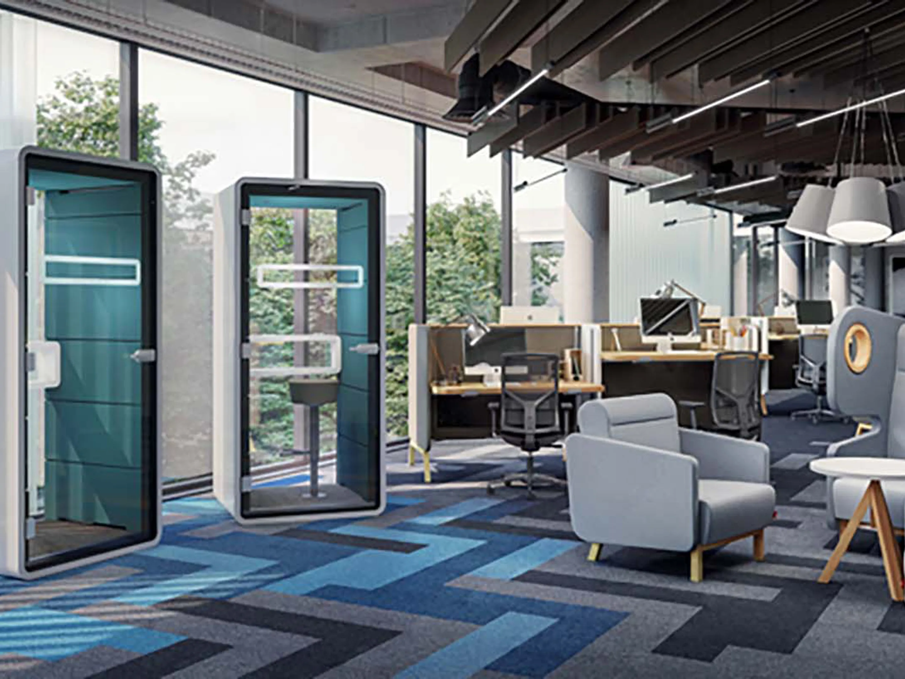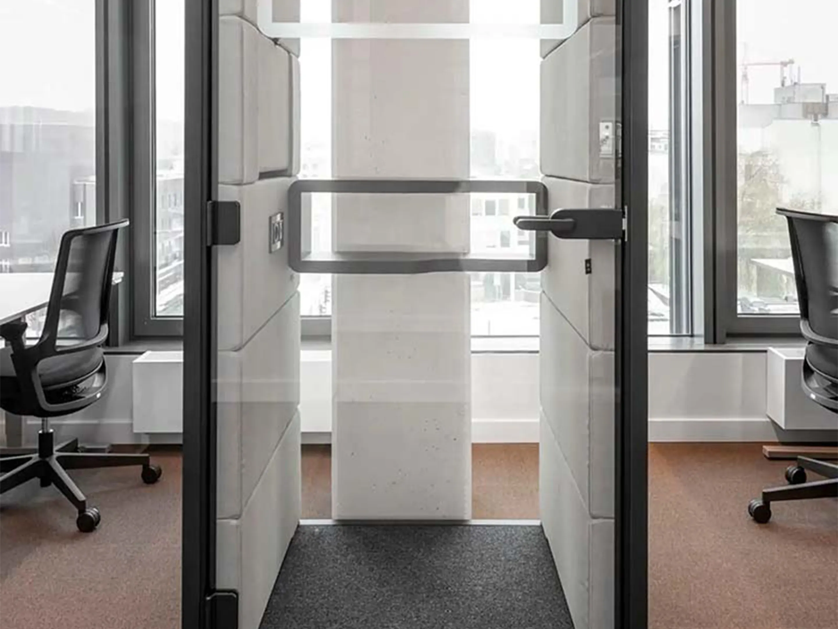Akoestische belmodule: afmeting: 1000 x 900 x 2230mm (BxDxH). Automatische ventilatie en verlichting, airflow: 2 fans - 110m3/h / 80sec. Incl. tapijtvloer, ergonomisch tafelblad met bergruimte, uitvouwbaar tafelblad, stelvoetjes en ingebouwde wielen.