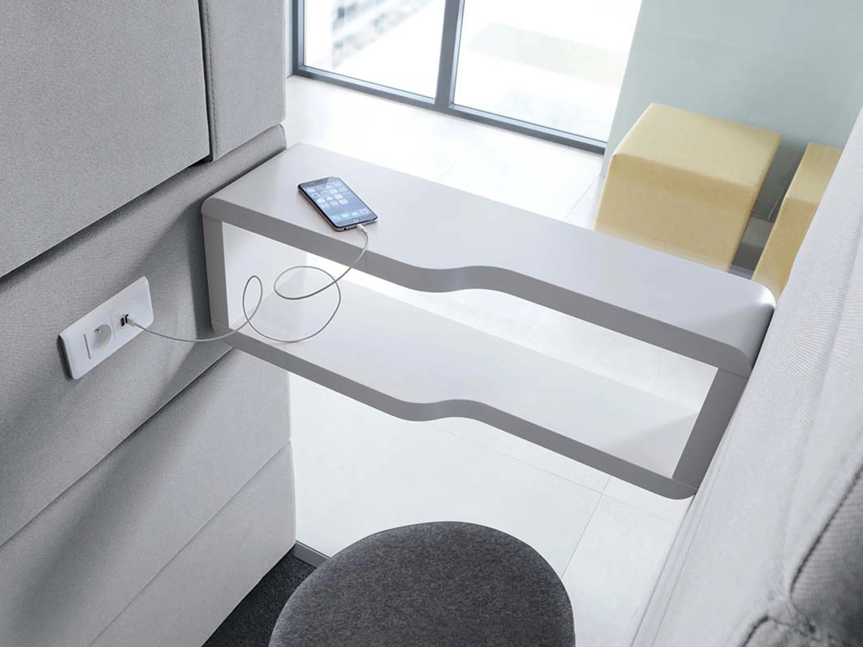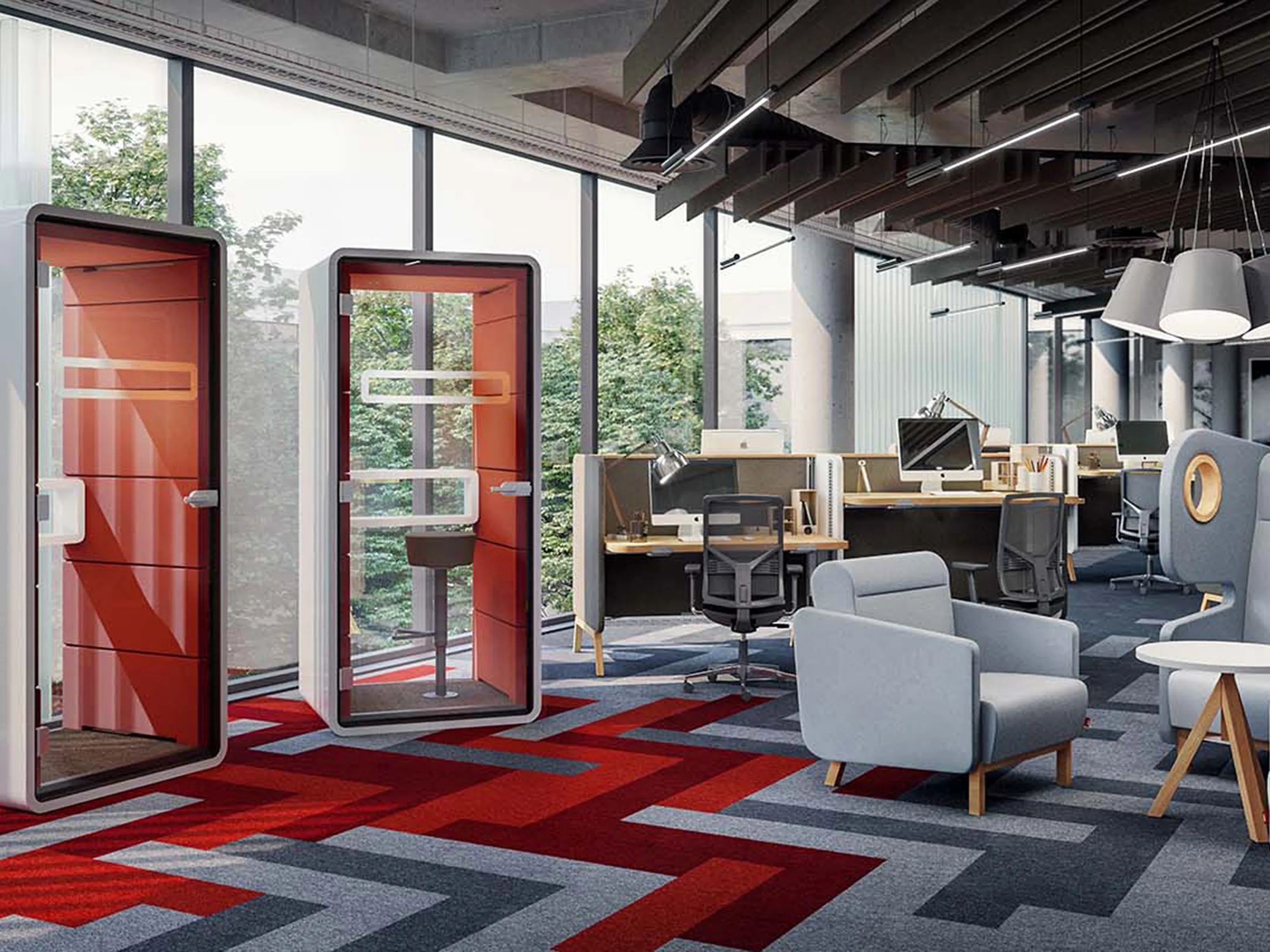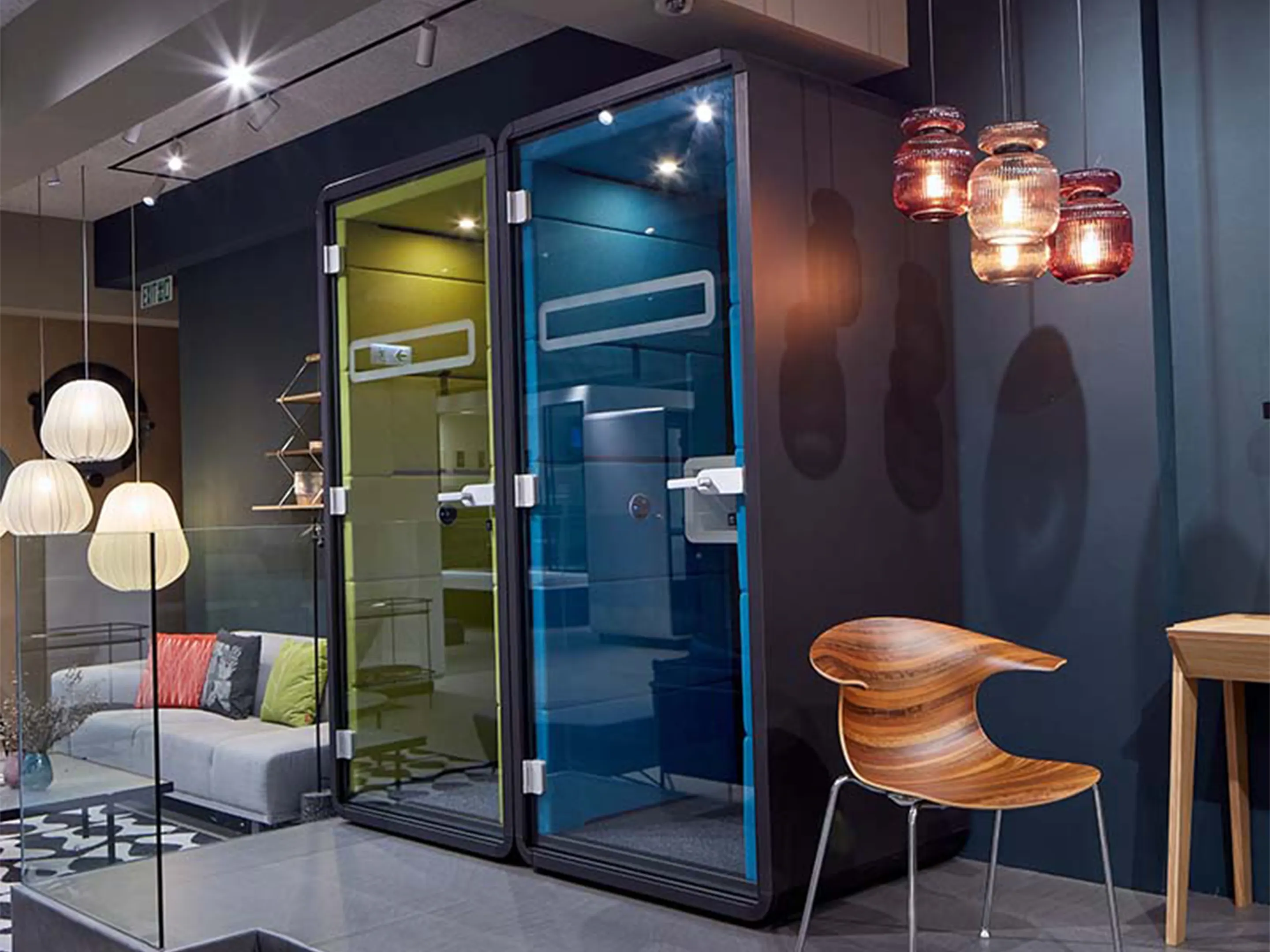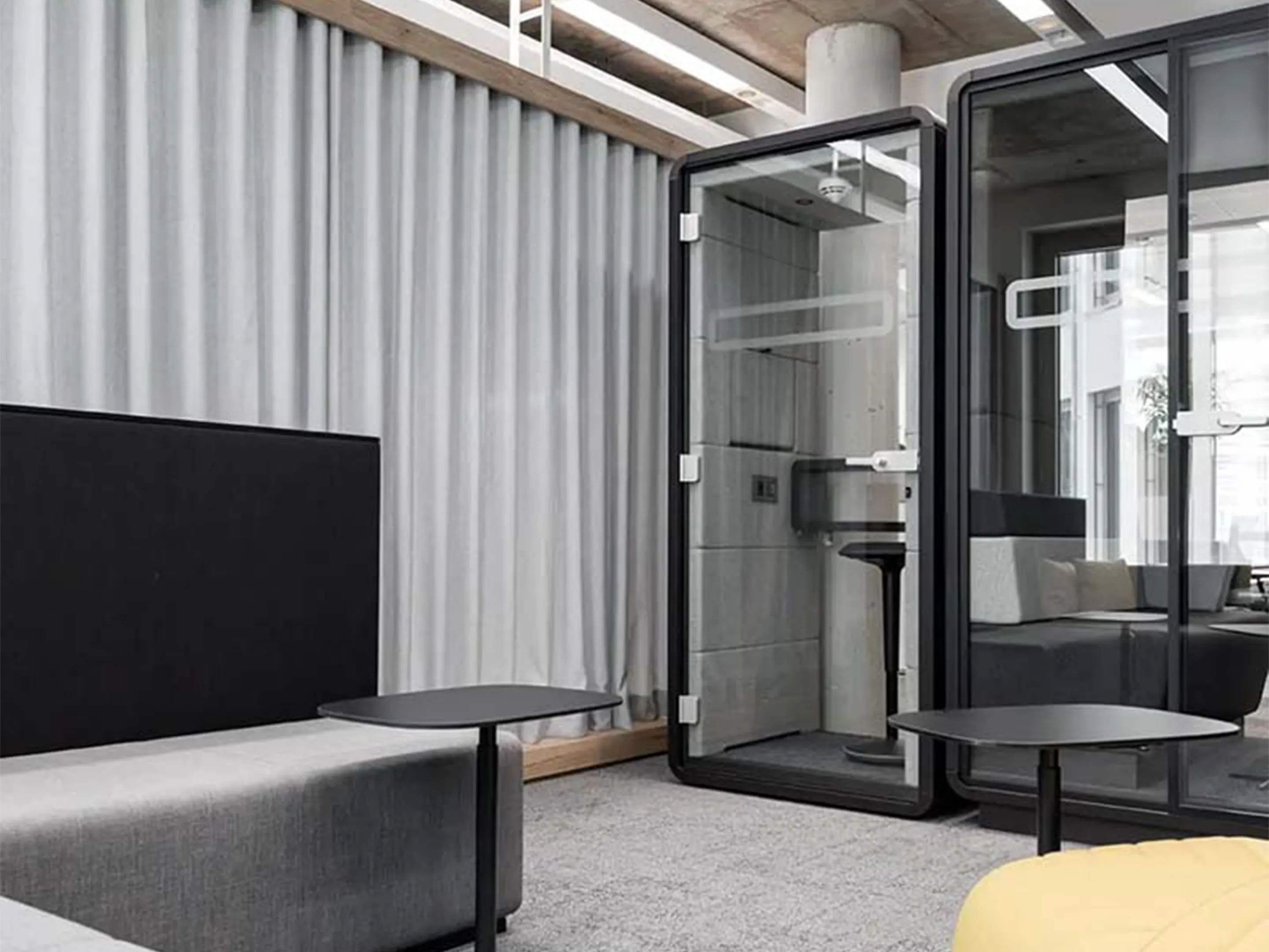Akoestische belmodule: afmeting: 1000 x 900 x 2230mm (BxDxH). Automatische ventilatie en verlichting, airflow: 2 fans - 110m3/h / 80sec. Incl. tapijtvloer, ergonomisch tafelblad met bergruimte, uitvouwbaar tafelblad, stelvoetjes en ingebouwde wielen.