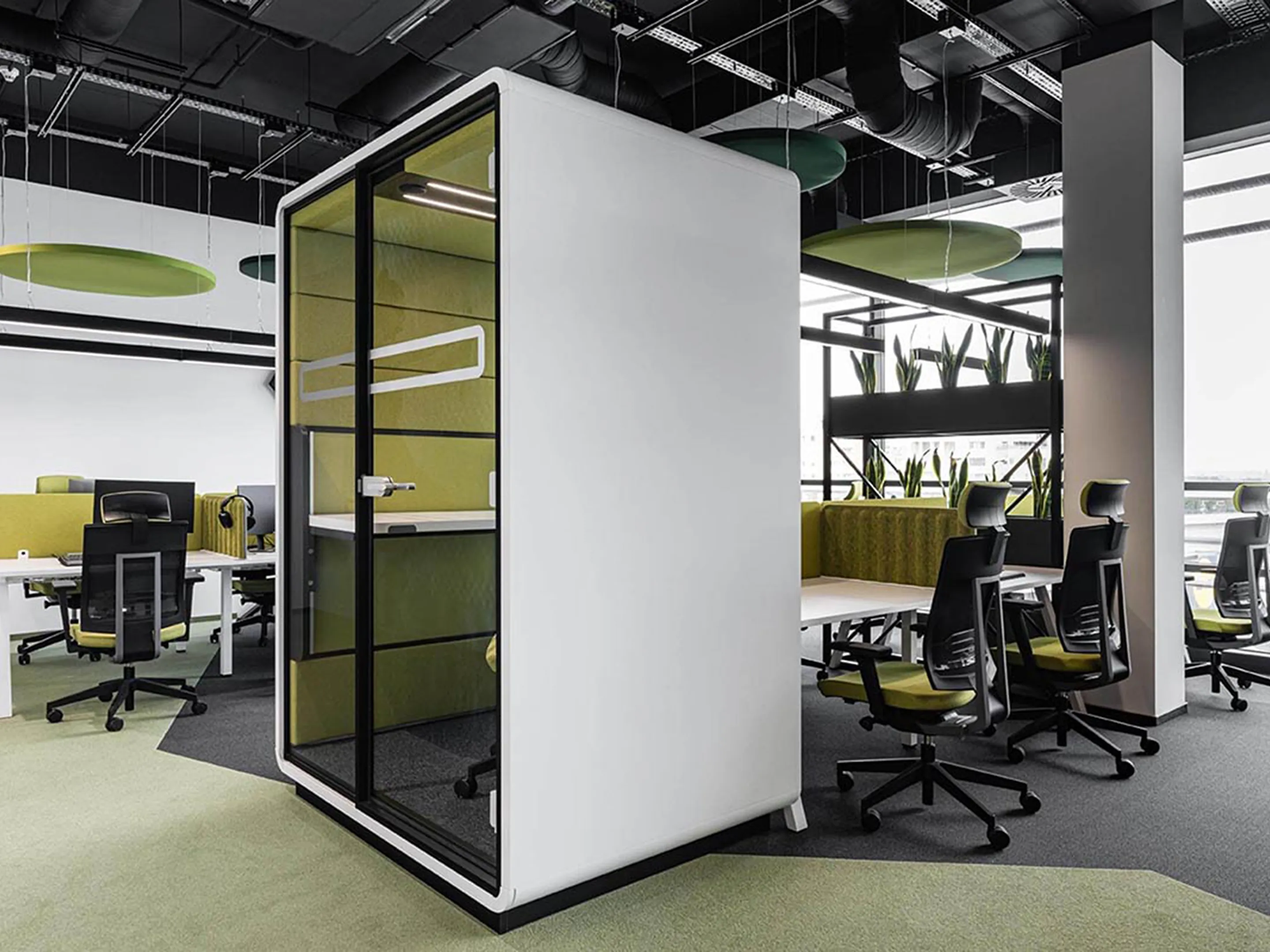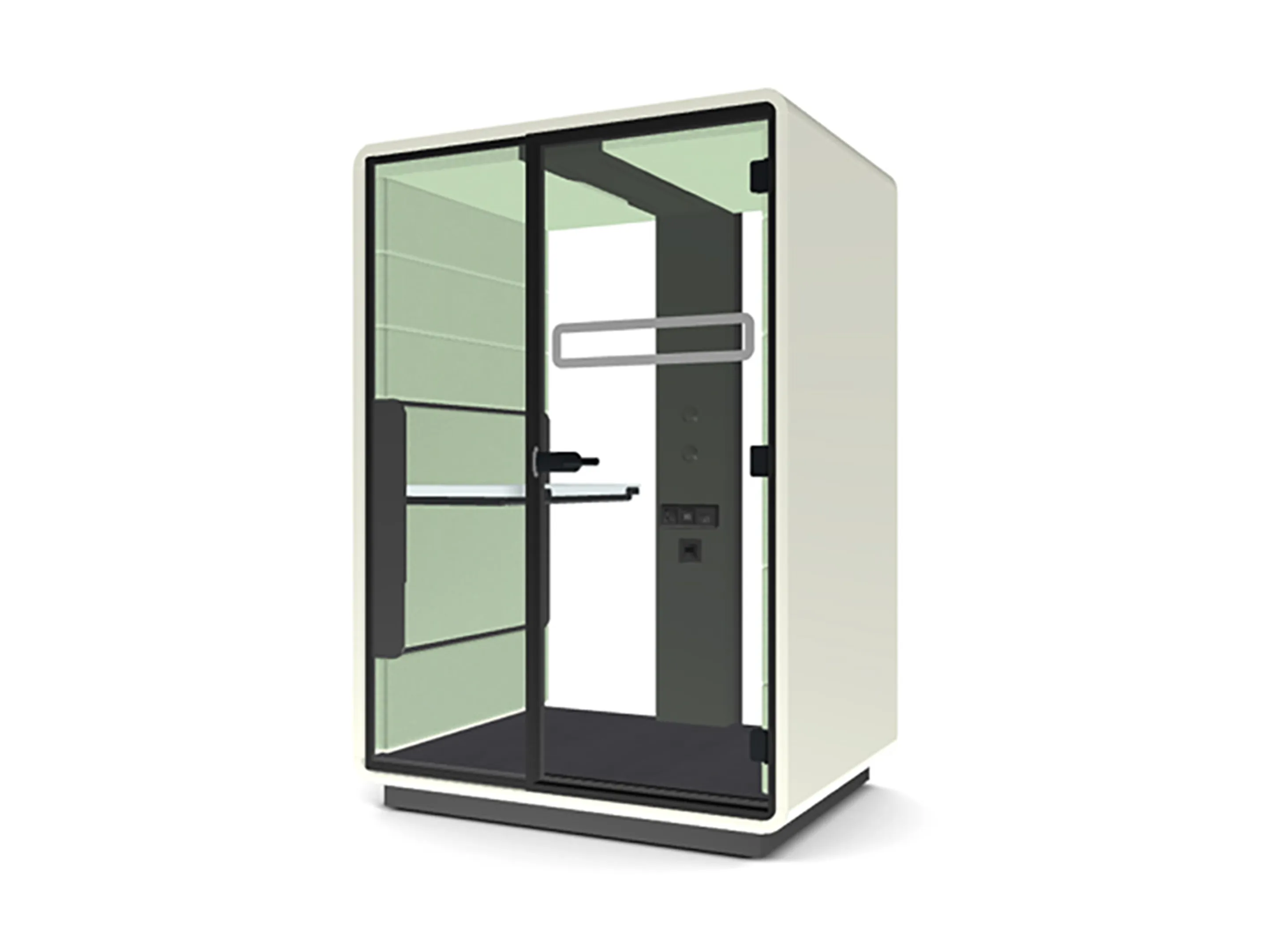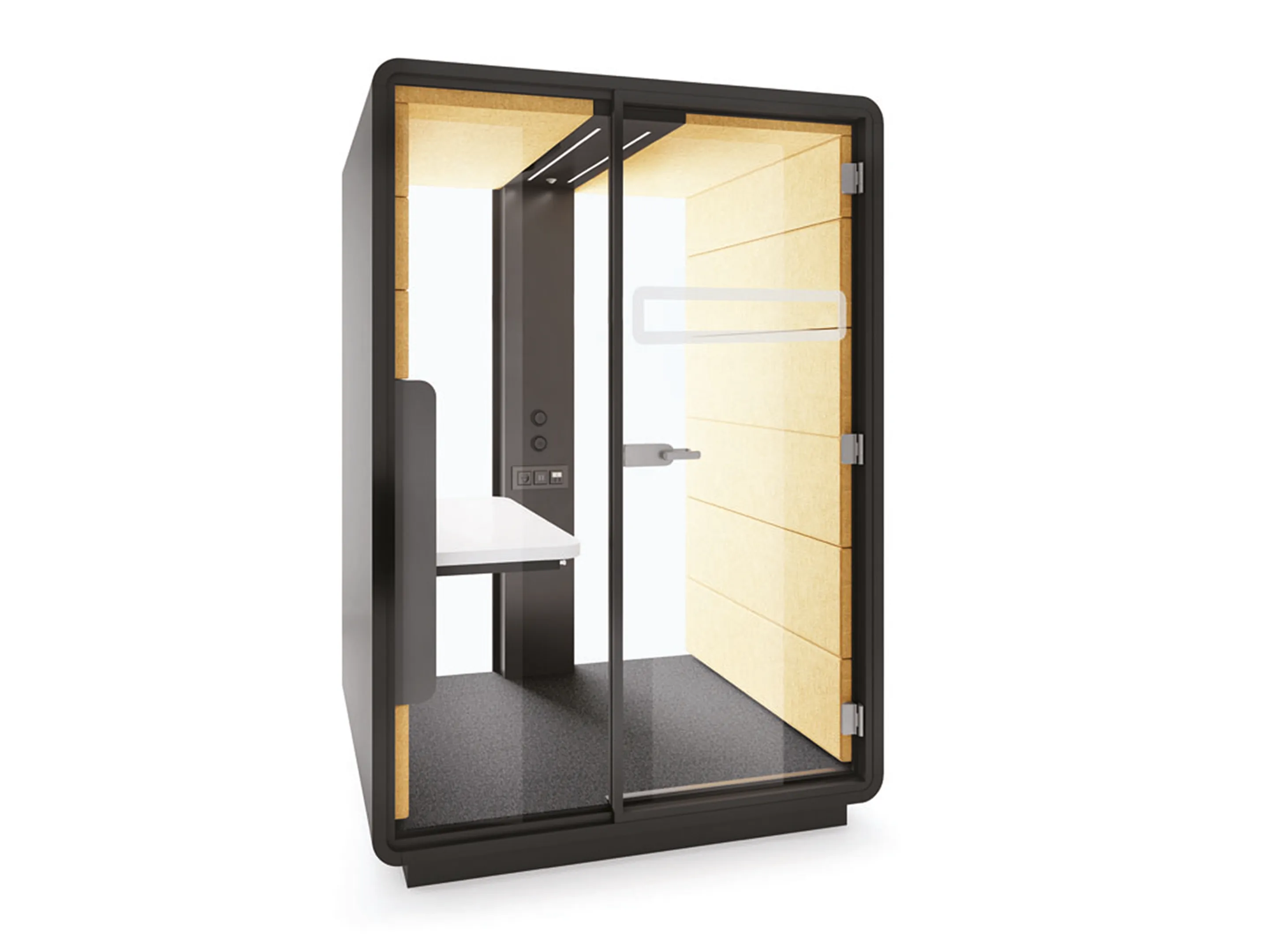 Akoestische werkmodule: afmeting: 1600 x 1200 x 2300mm (BxDxH). Automatische ventilatie, airflow: 3 fans - 47m3/h / 293sec. Incl. tapijtvloer, LED dimmerlamp, stopcontact, individuele licht- & ventilatieknoppen, hoogte instelbaar tafelblad, stelvoetjes.