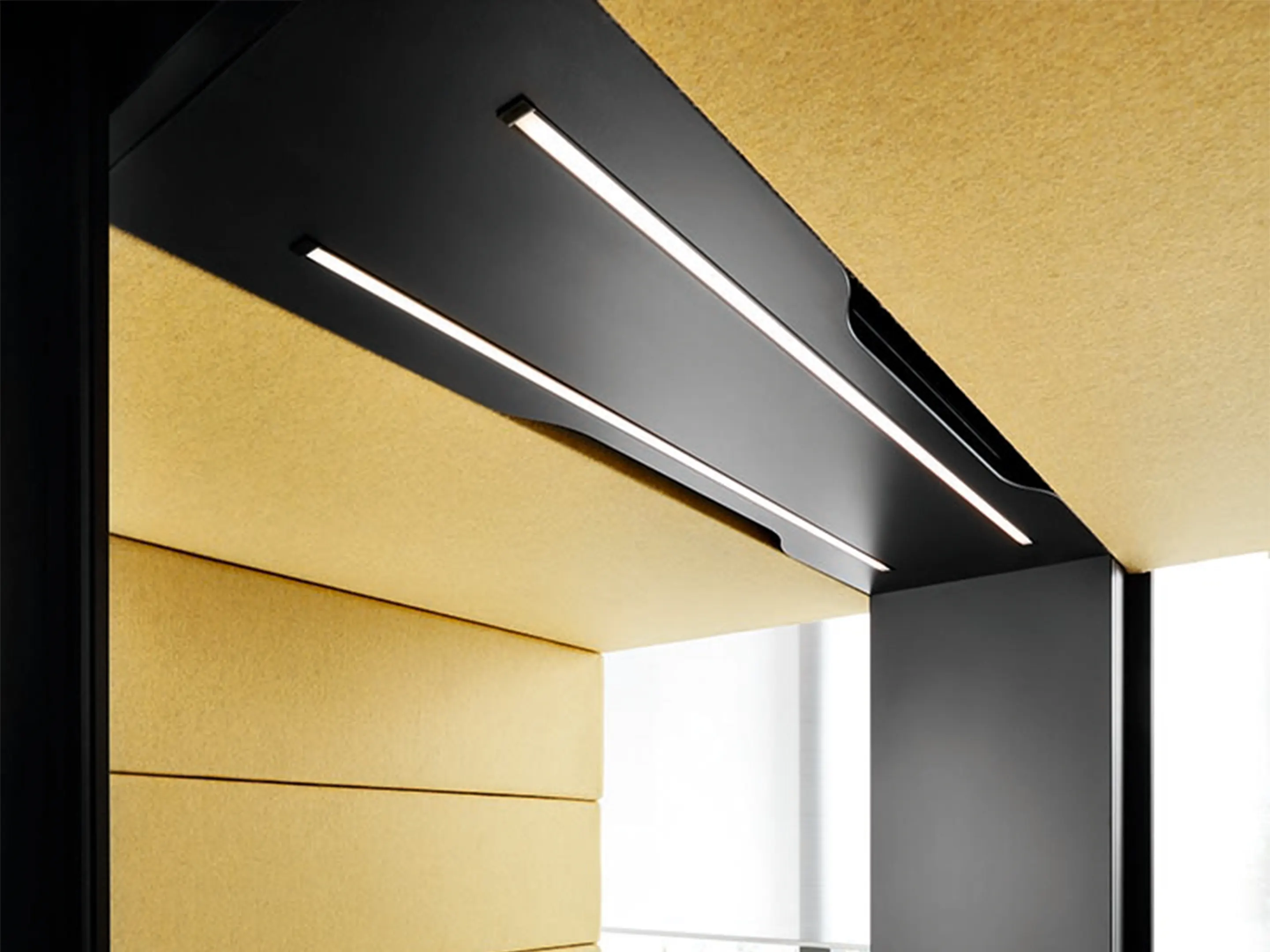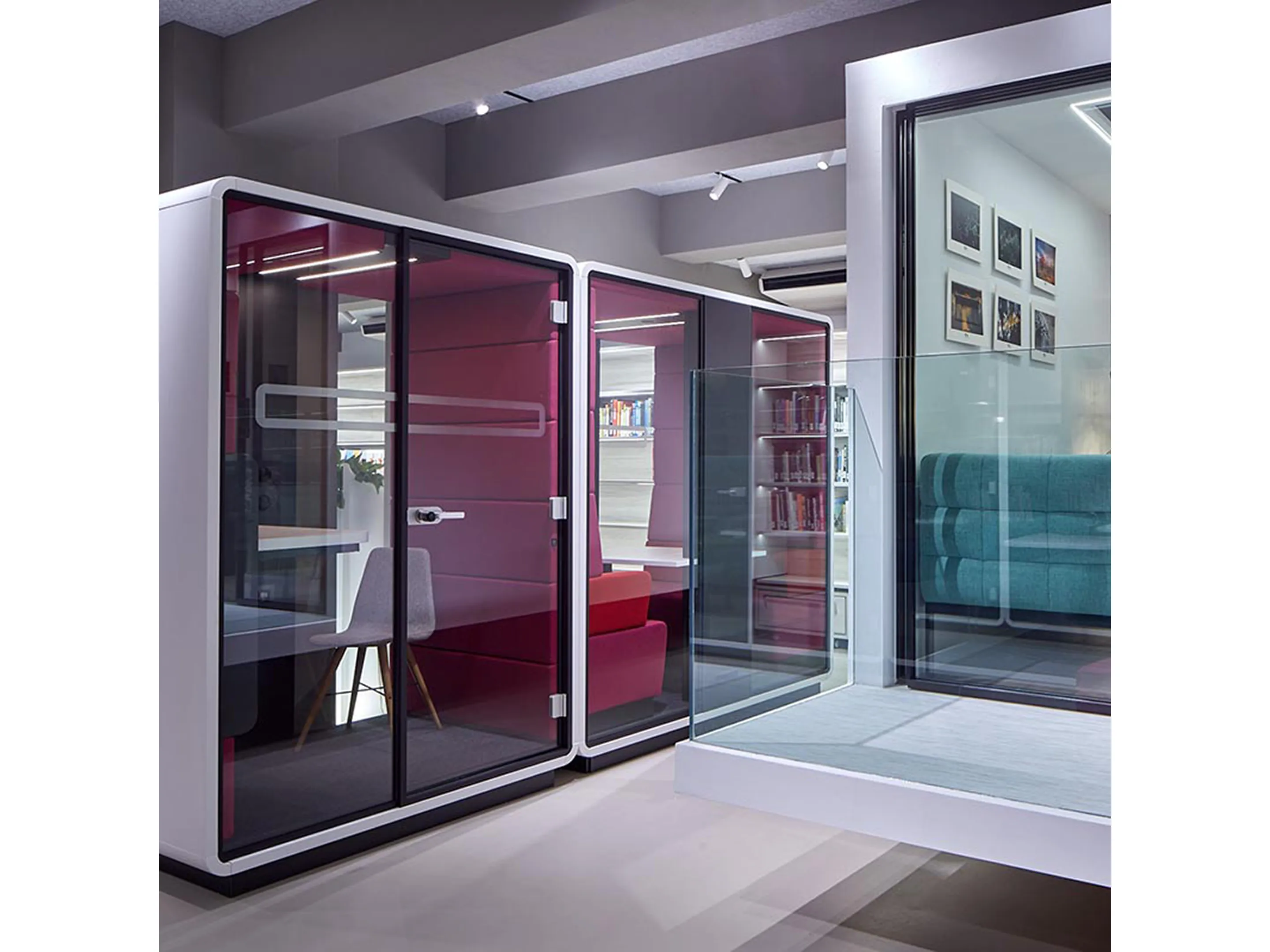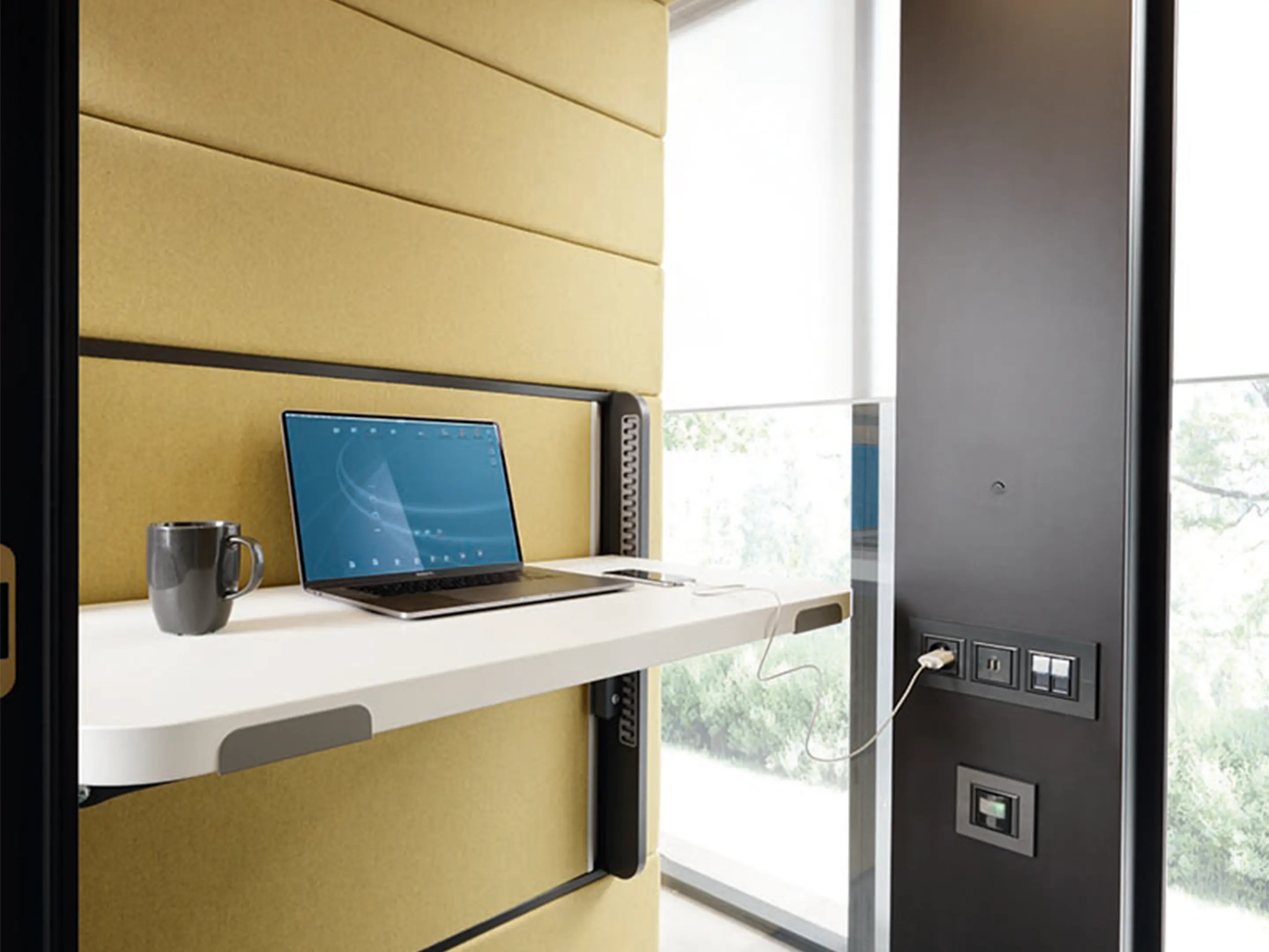 Akoestische werkmodule: afmeting: 1600 x 1200 x 2300mm (BxDxH). Automatische ventilatie, airflow: 3 fans - 47m3/h / 293sec. Incl. tapijtvloer, LED dimmerlamp, stopcontact, individuele licht- & ventilatieknoppen, hoogte instelbaar tafelblad, stelvoetjes.
