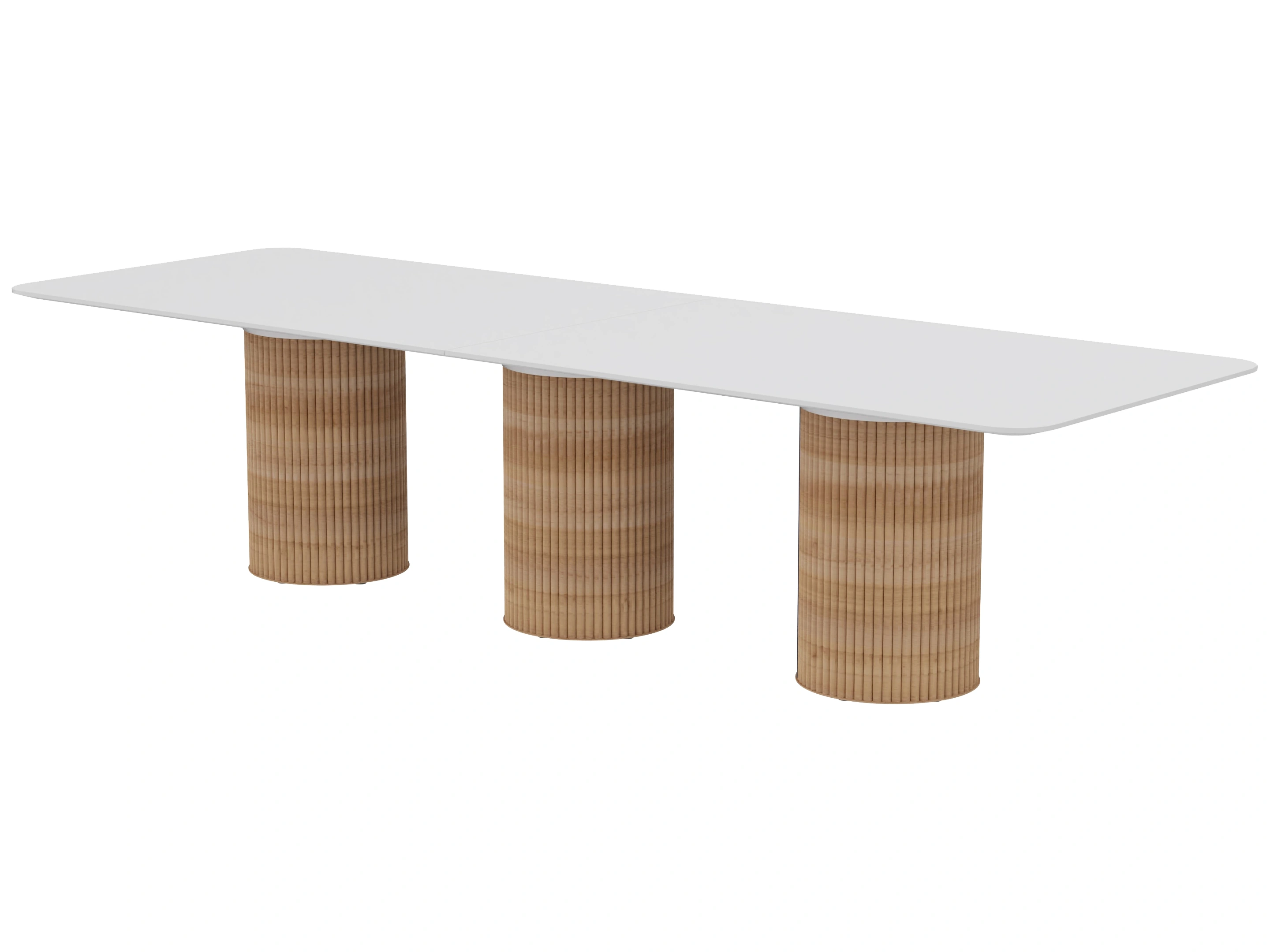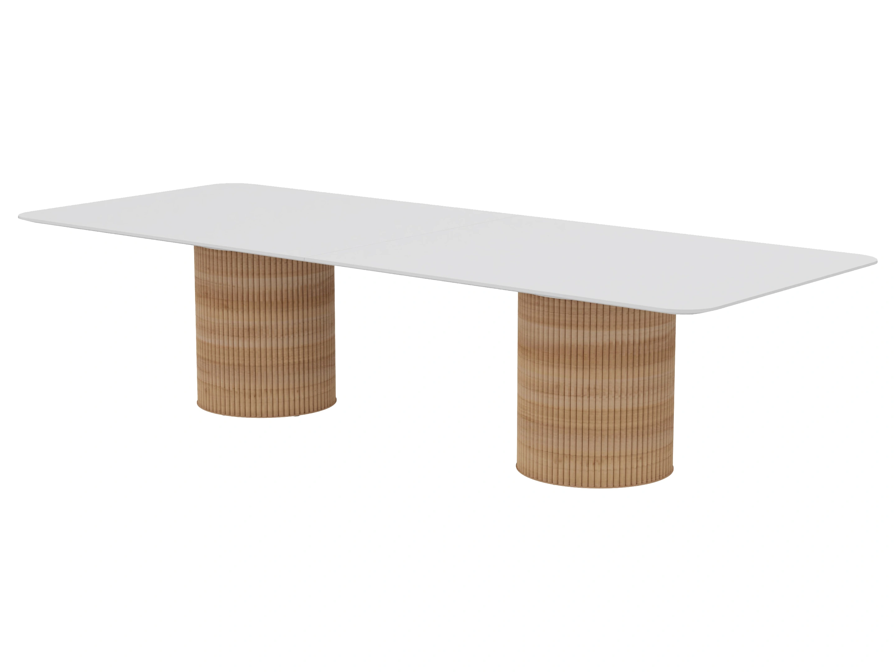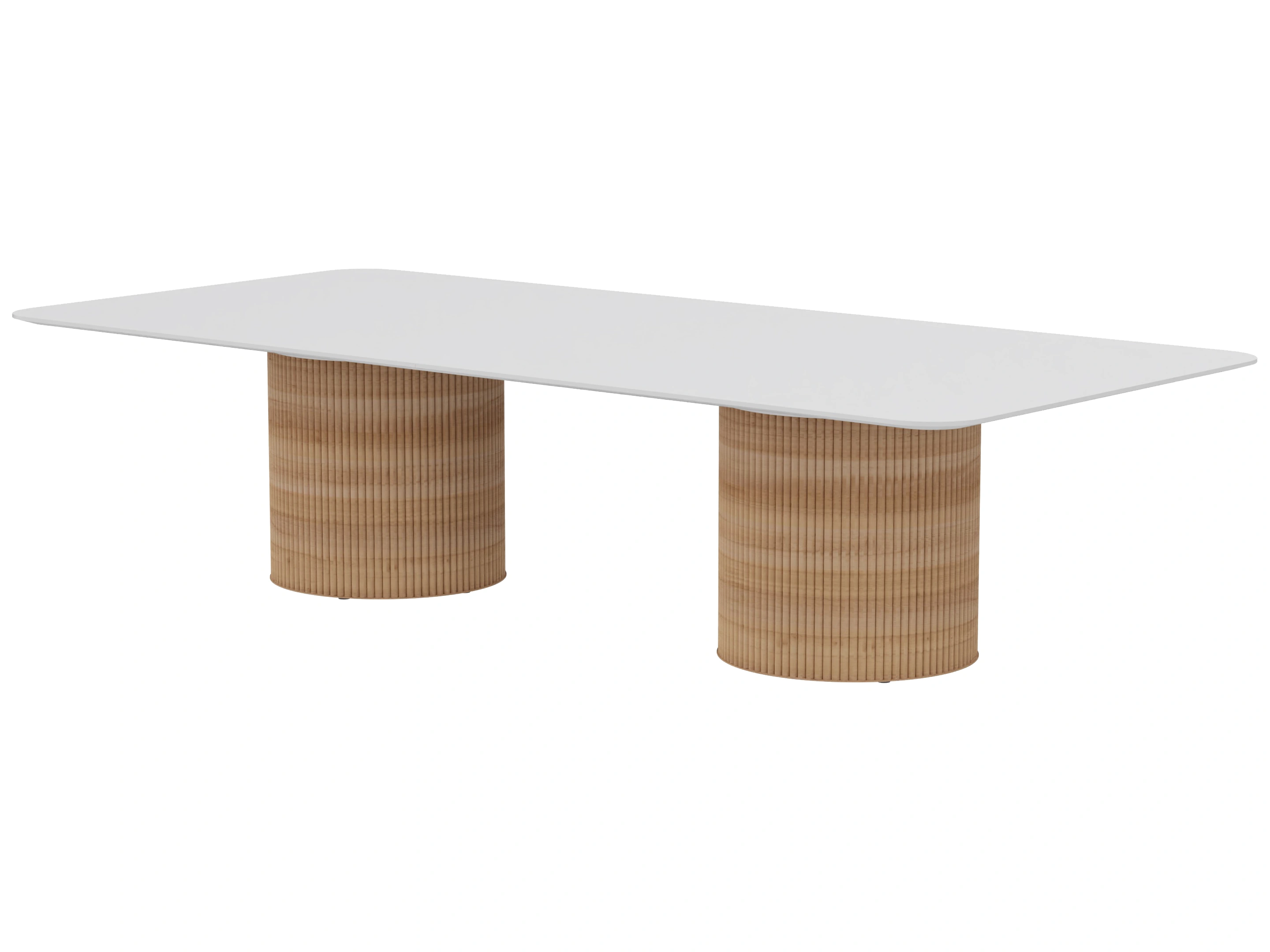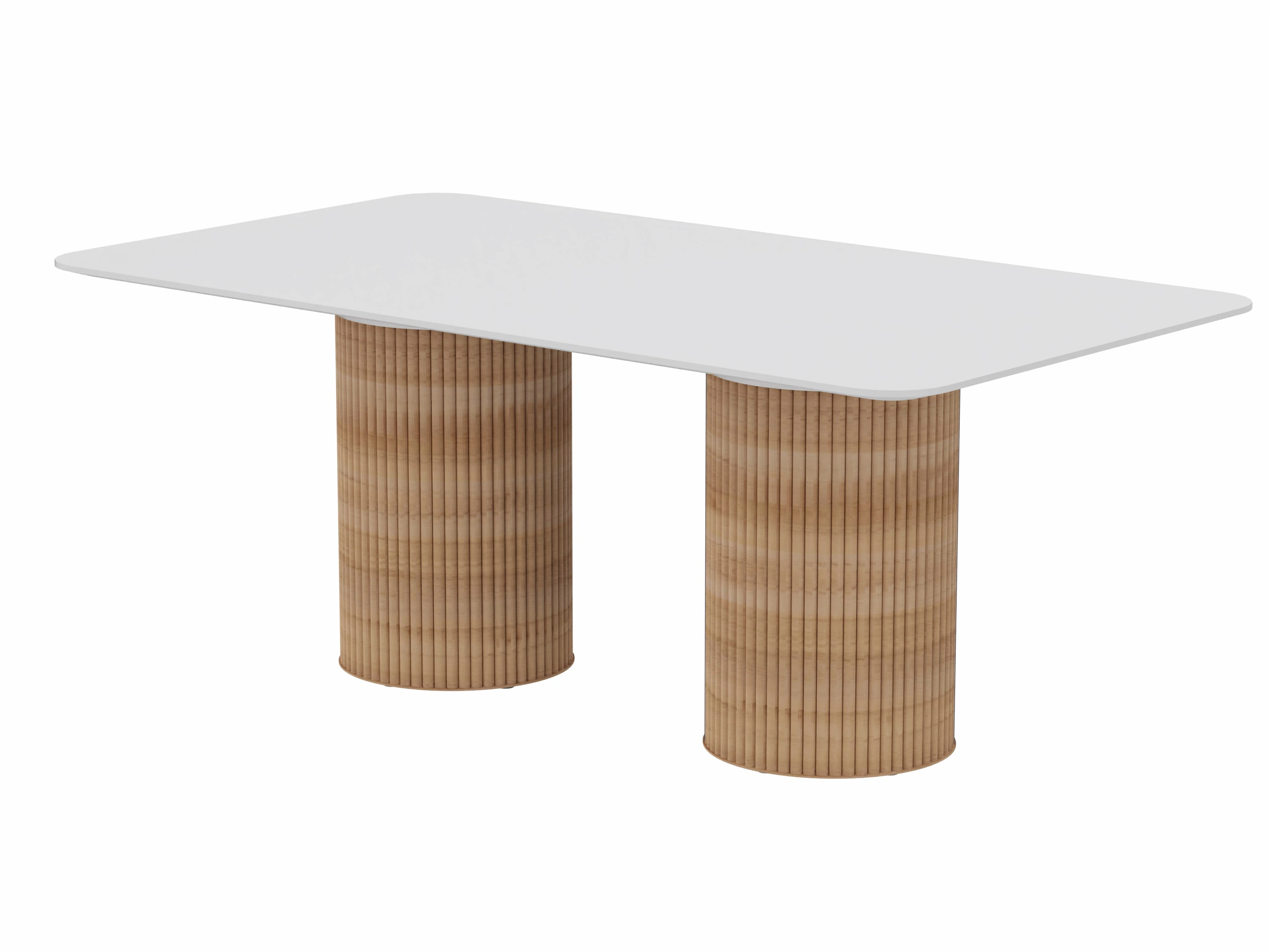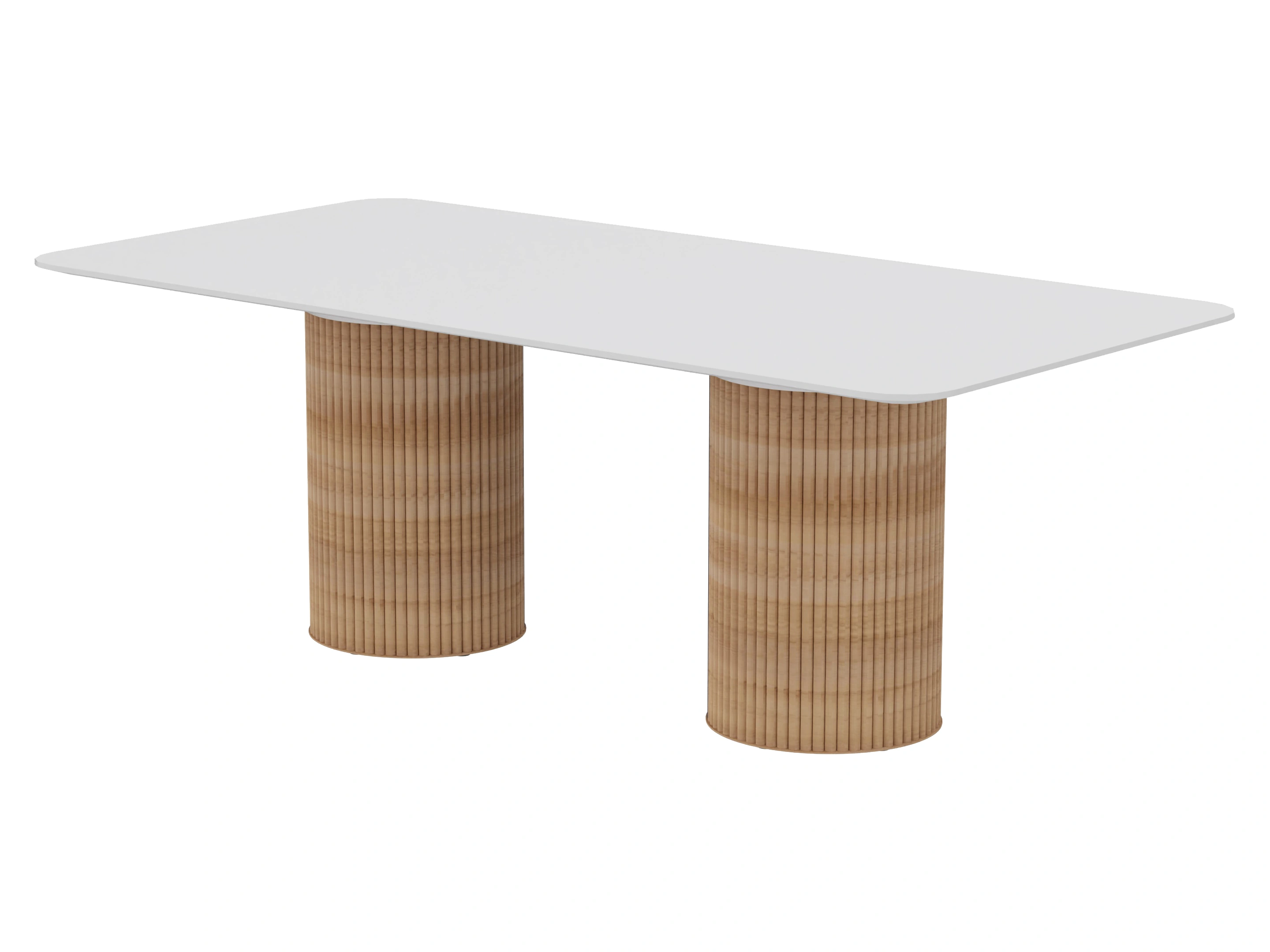 Tafel met een stalen frame, waarvan de kolomen bekleed zijn met massief hout. Ronde kolomvoeten hebben een diameter van 62cm.