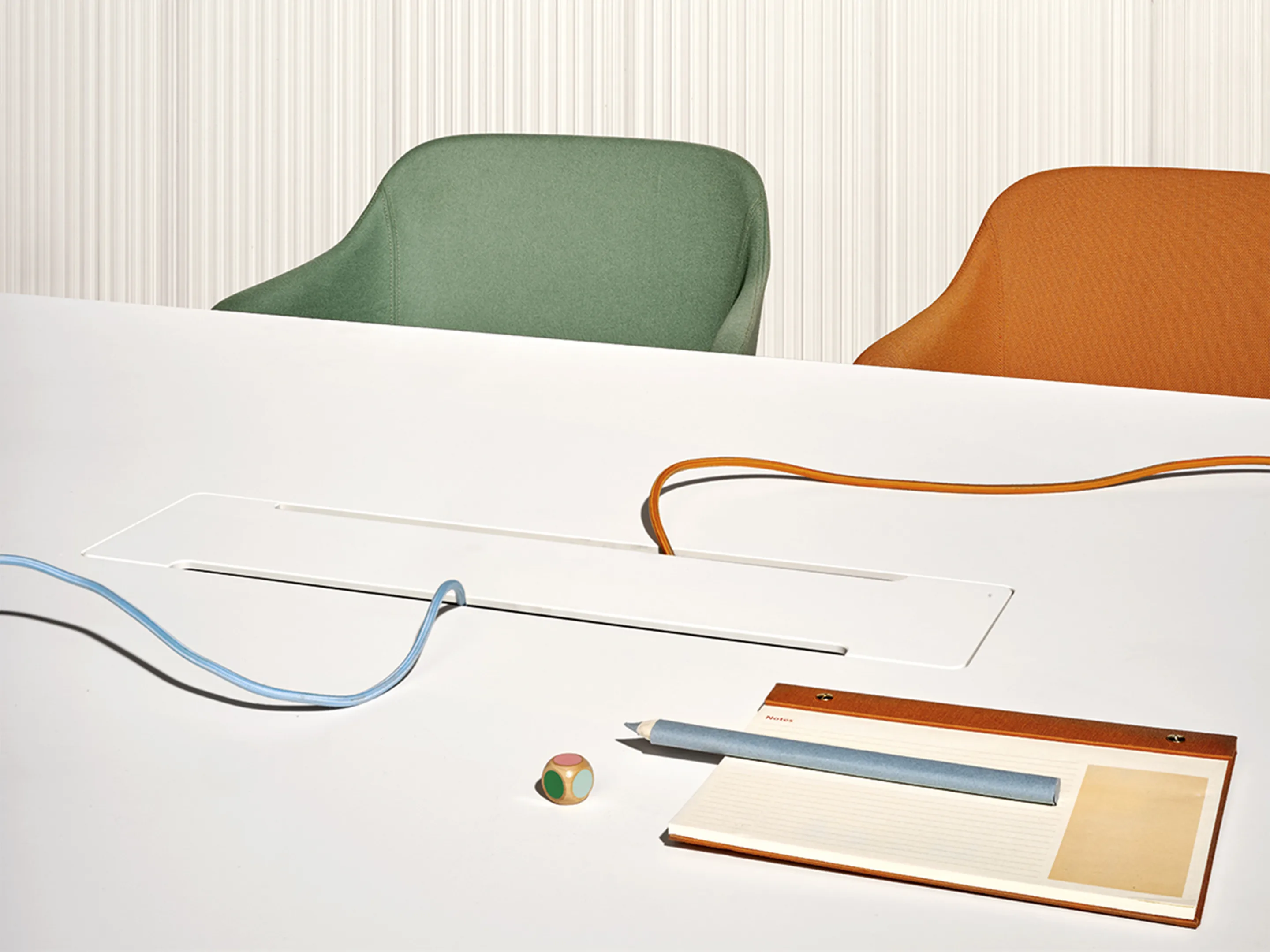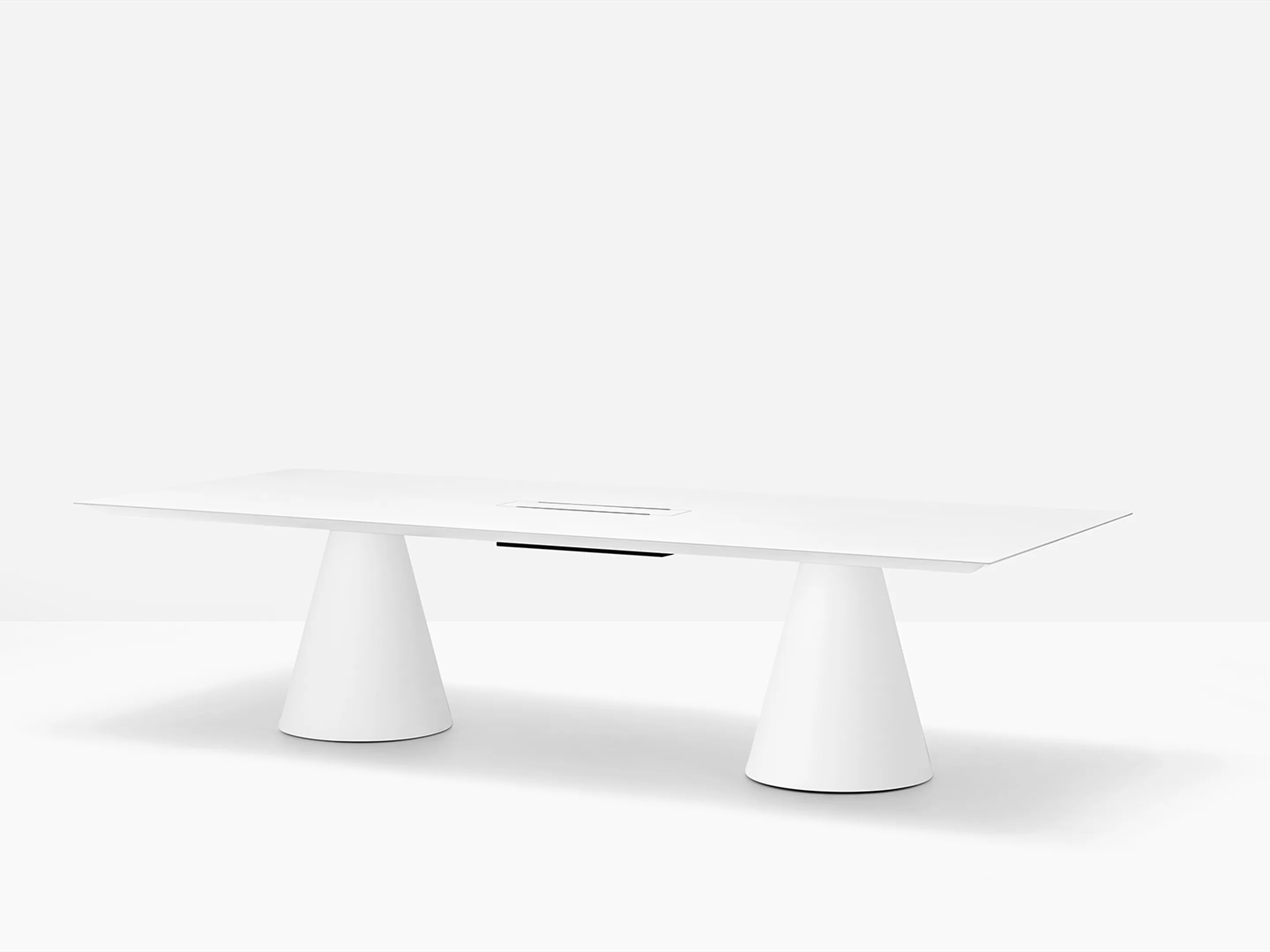 Vergadertafel met een hoogte van 740mm, voorzien van twee kolompoten, en onderframe met een verjongde afwerking. Bovenzijde is voorzien van eenafneembare kabelklep van 60mm breed (in decor van de tafel), onder de tafel is een kabelgoot voorzien.