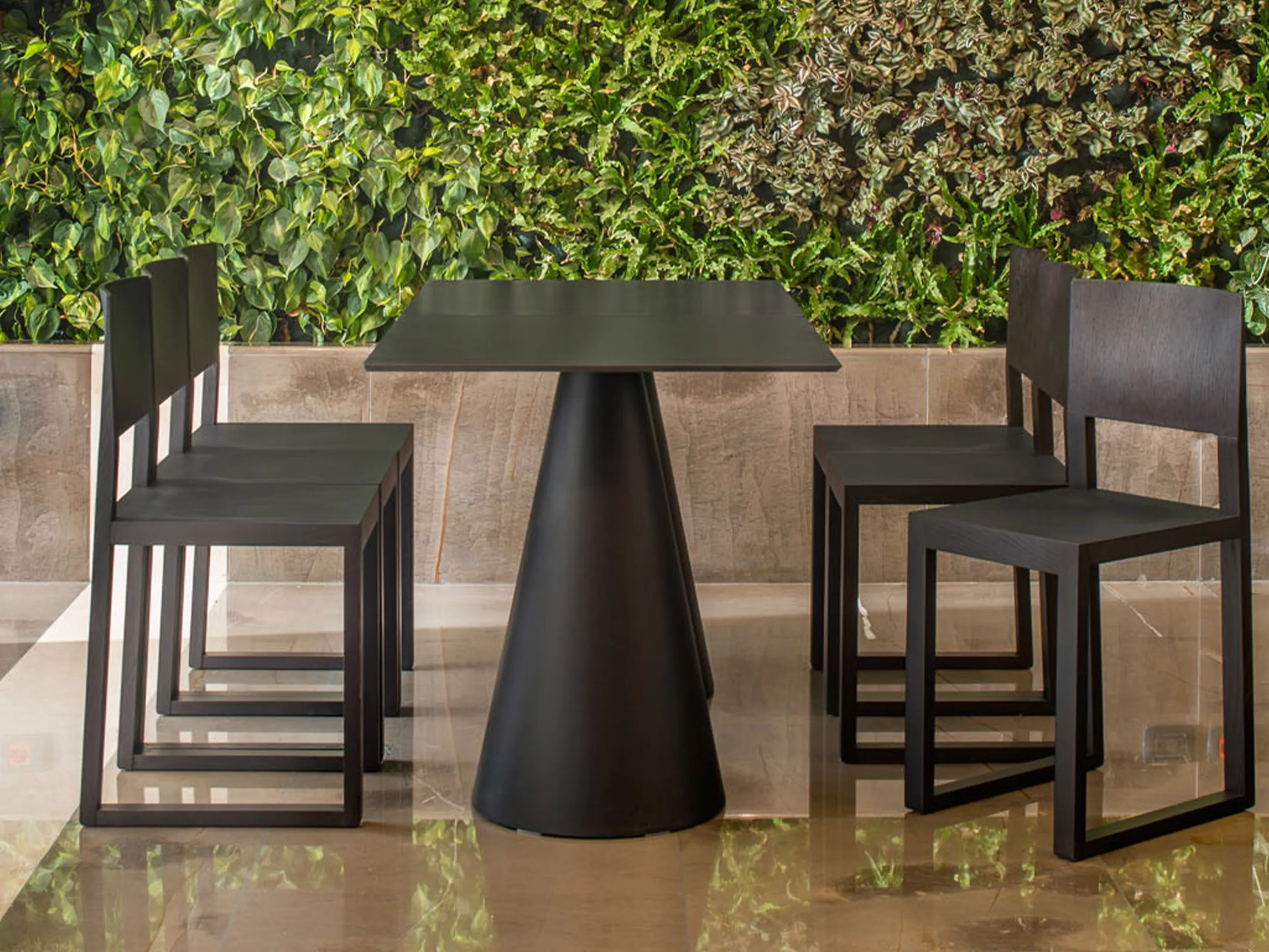 Vergadertafel met een hoogte van 720mm, voorzien van één kolompoot. Blad in composiet outdoor kwaliteit.
