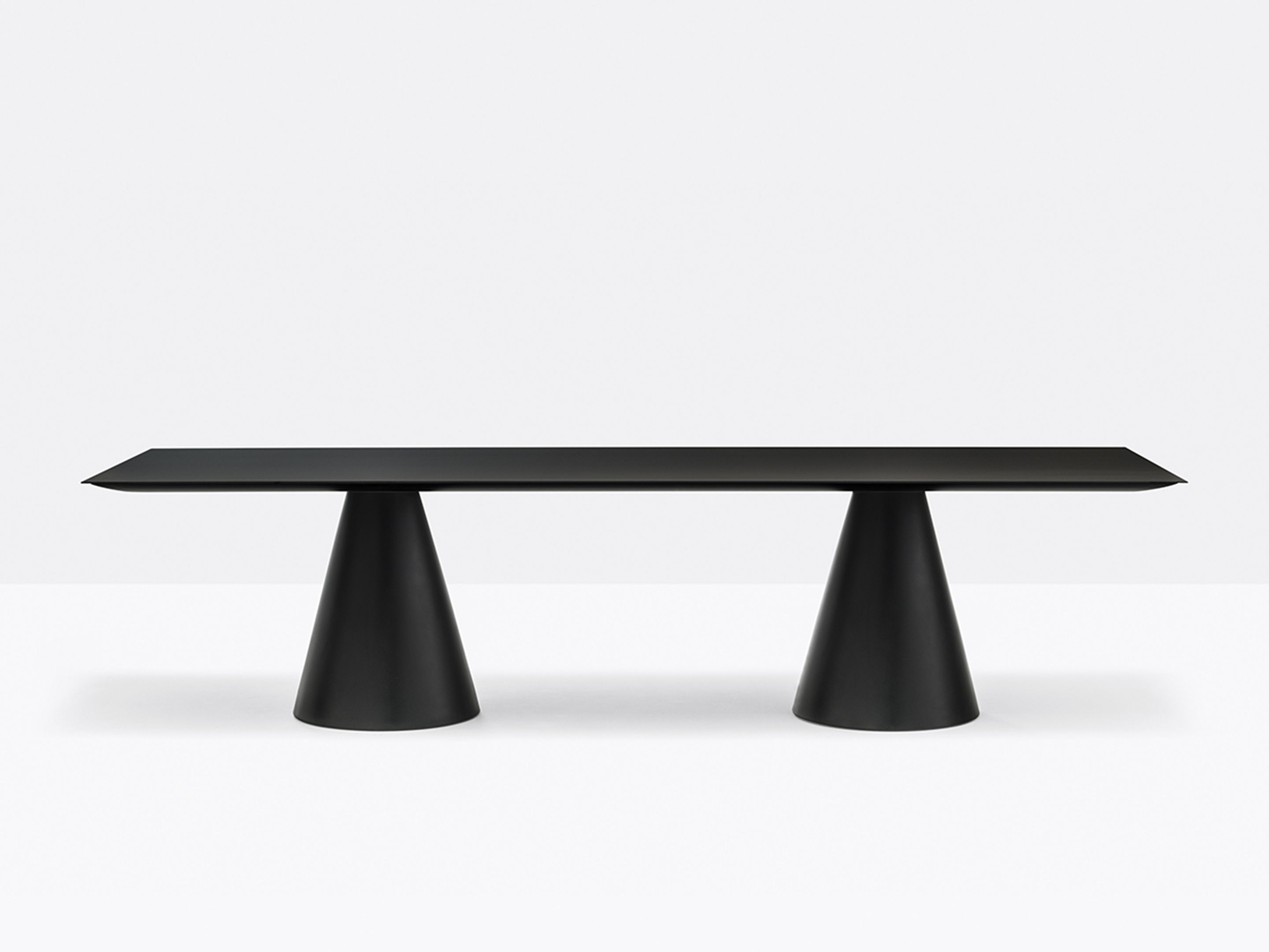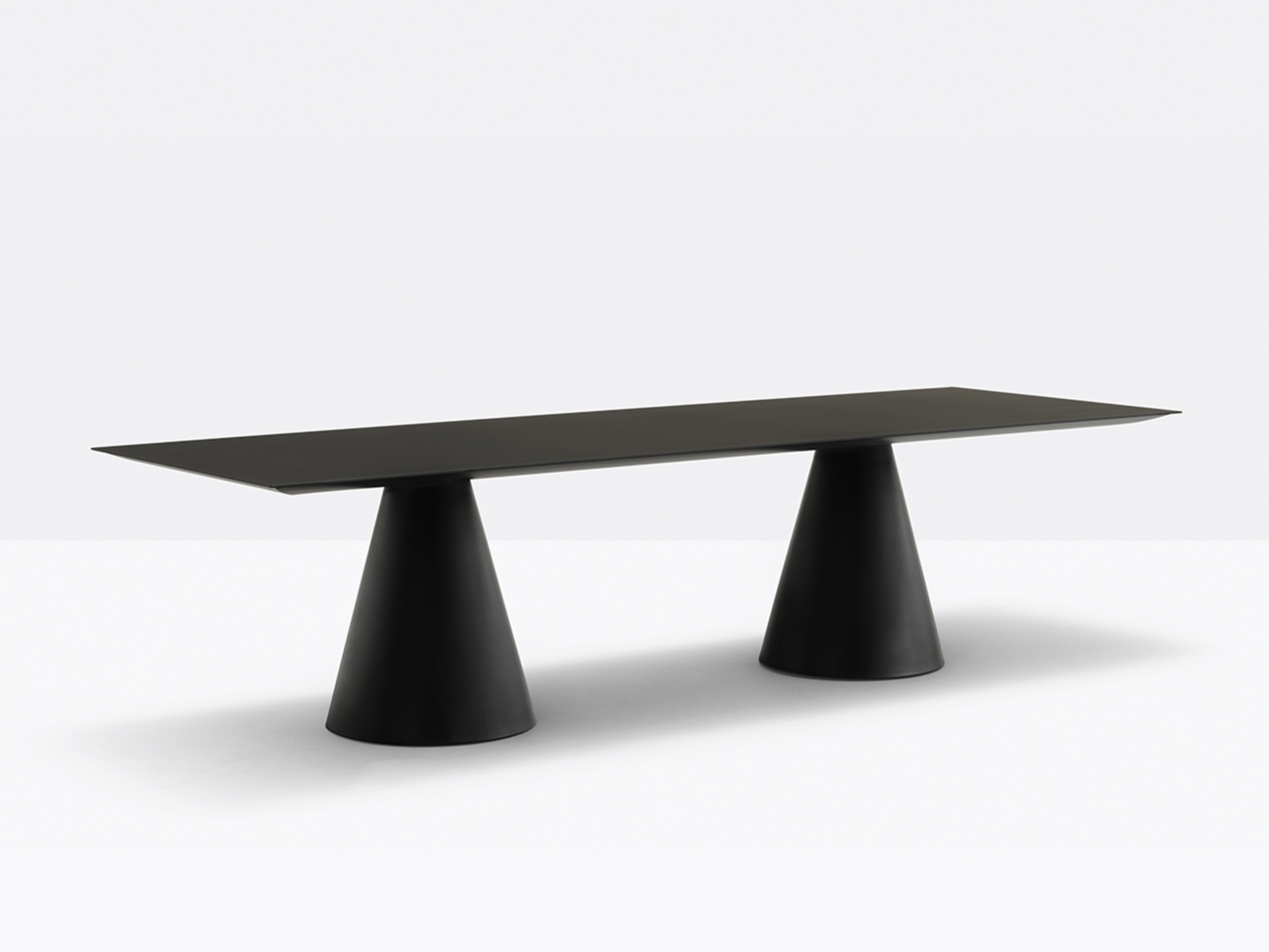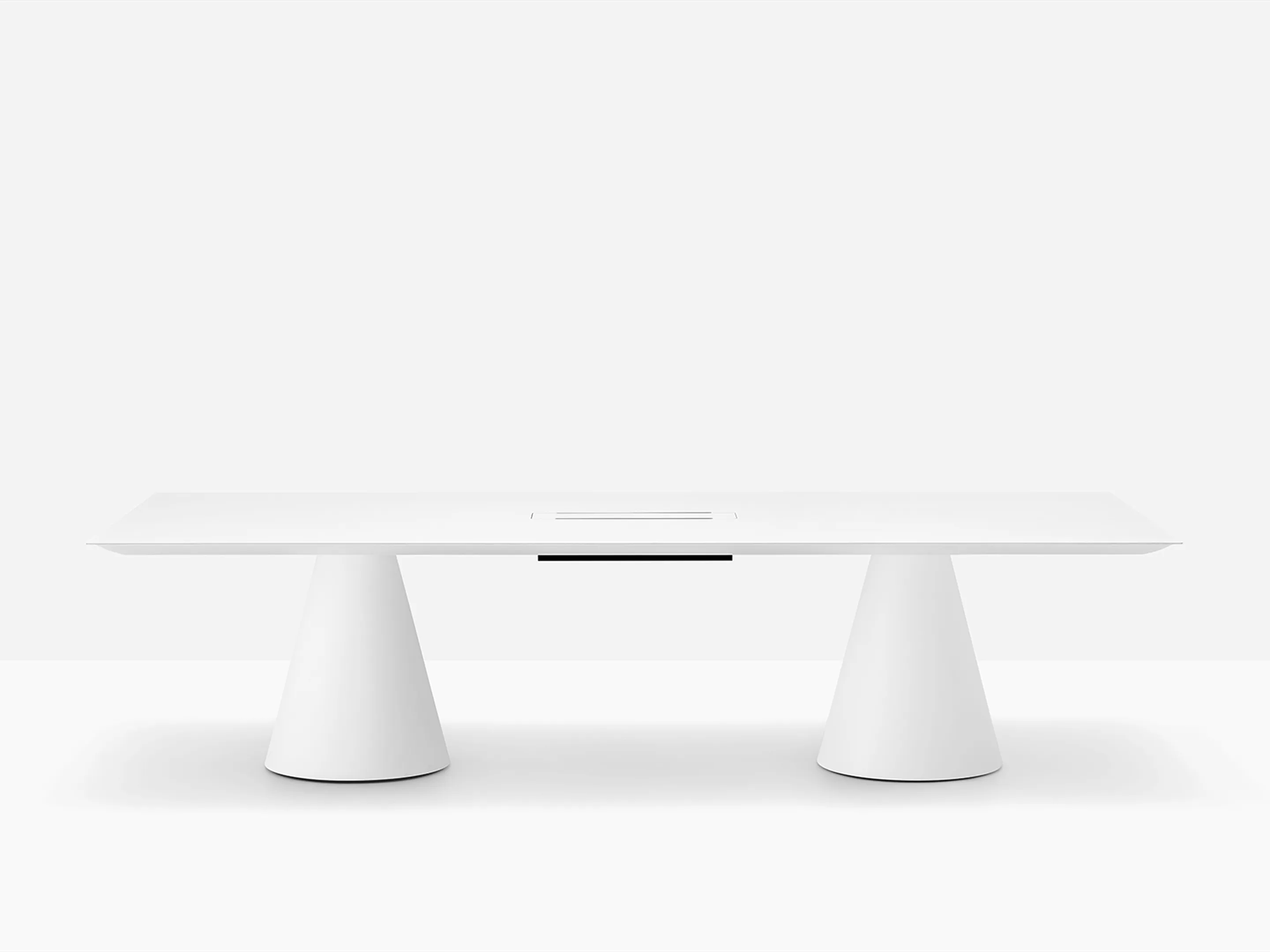 Vergadertafel met een hoogte van 740mm, voorzien van twee kolompoten, en onderframe met een verjongde afwerking.