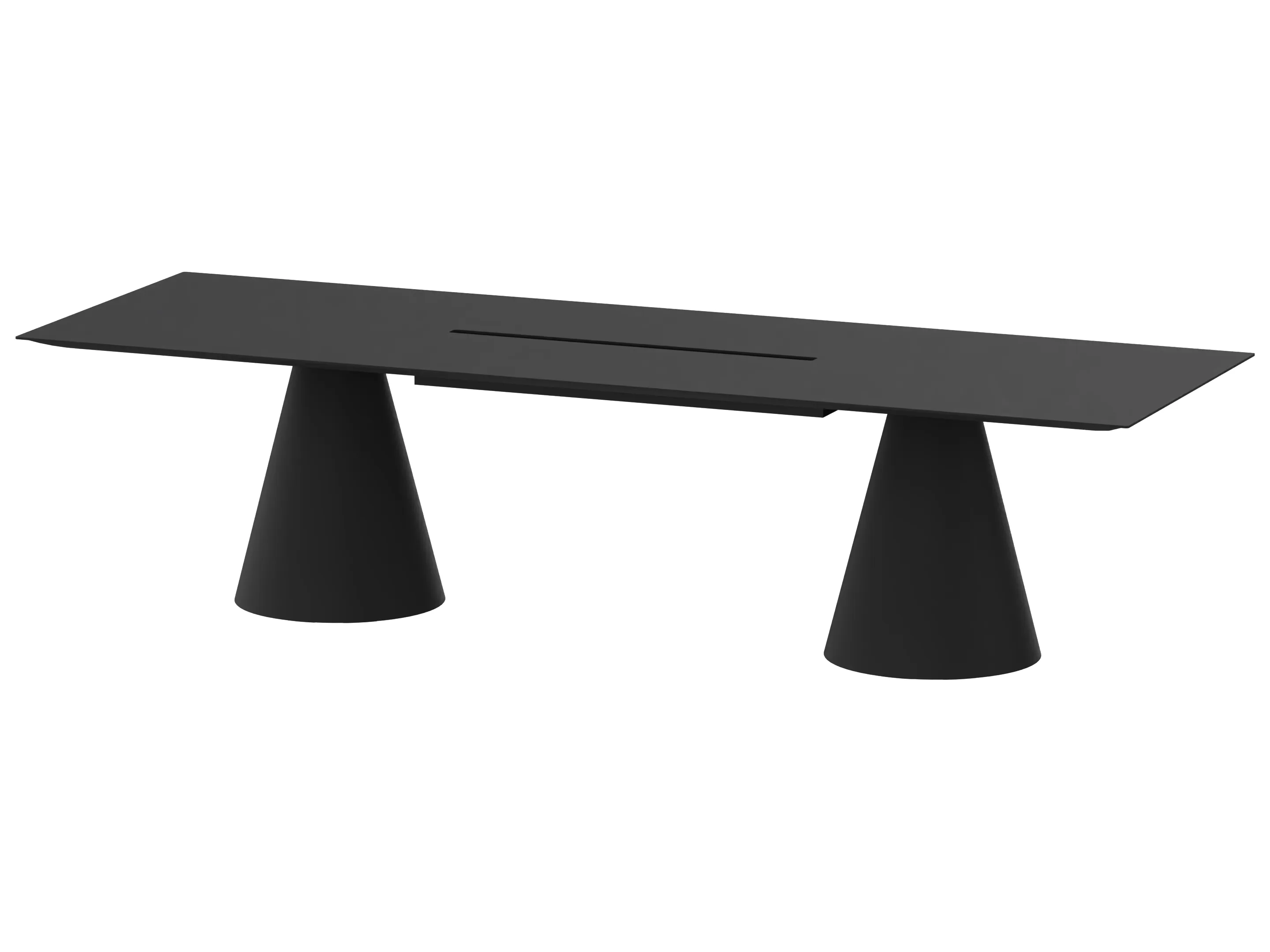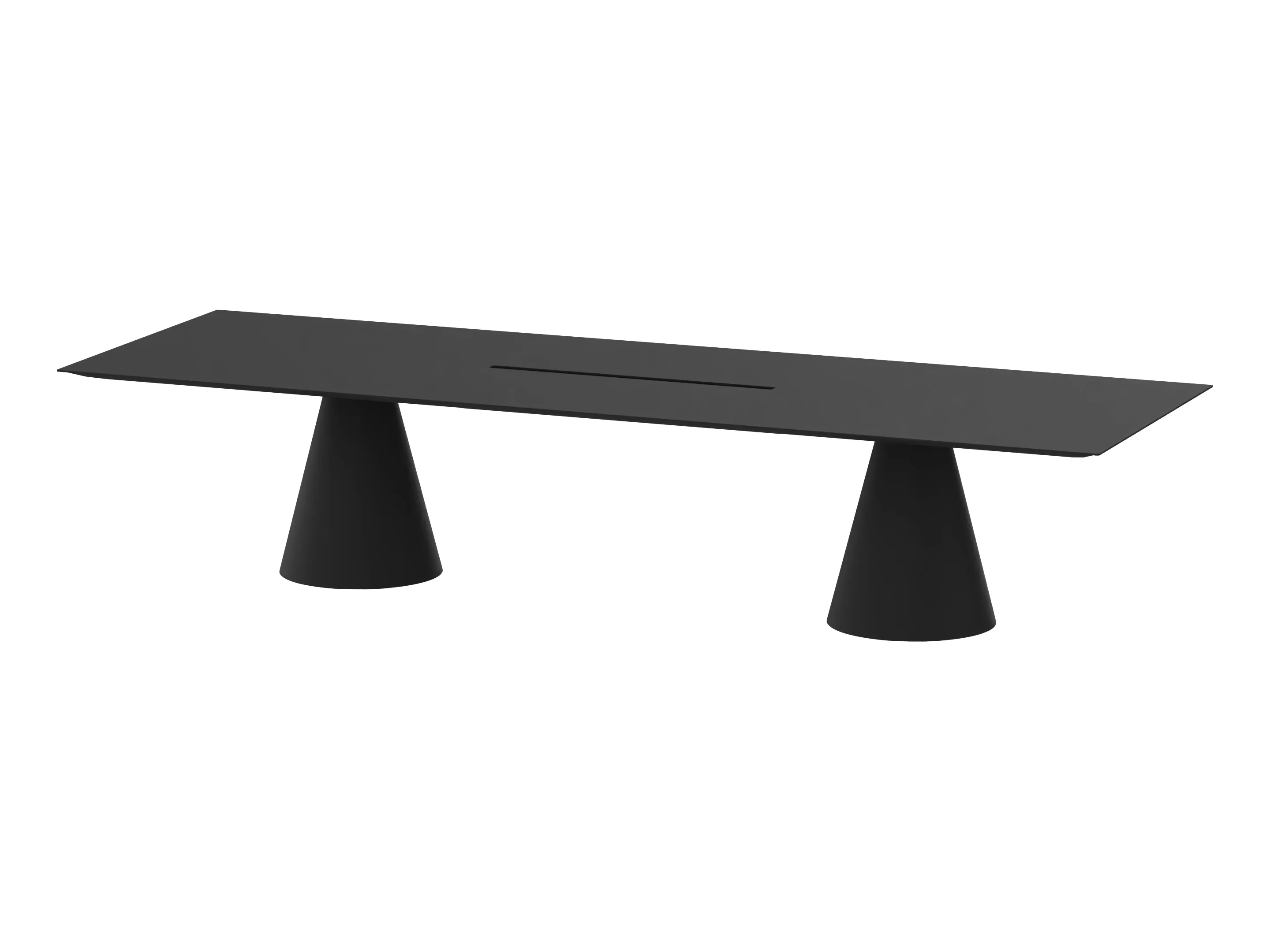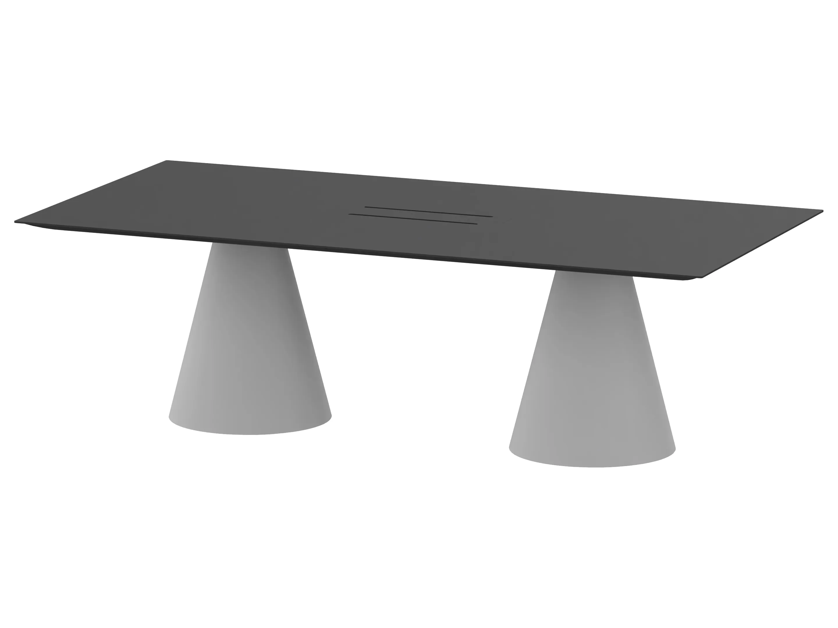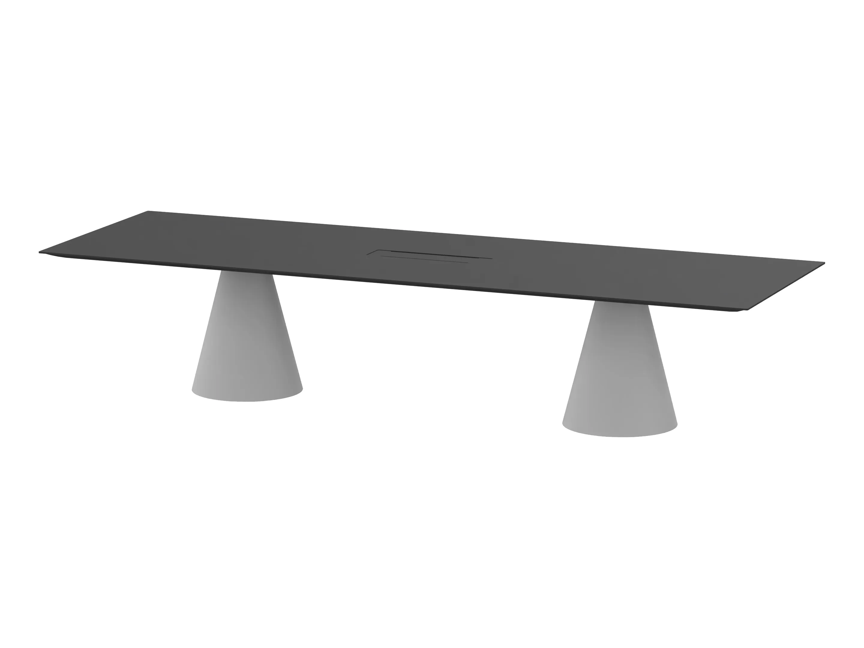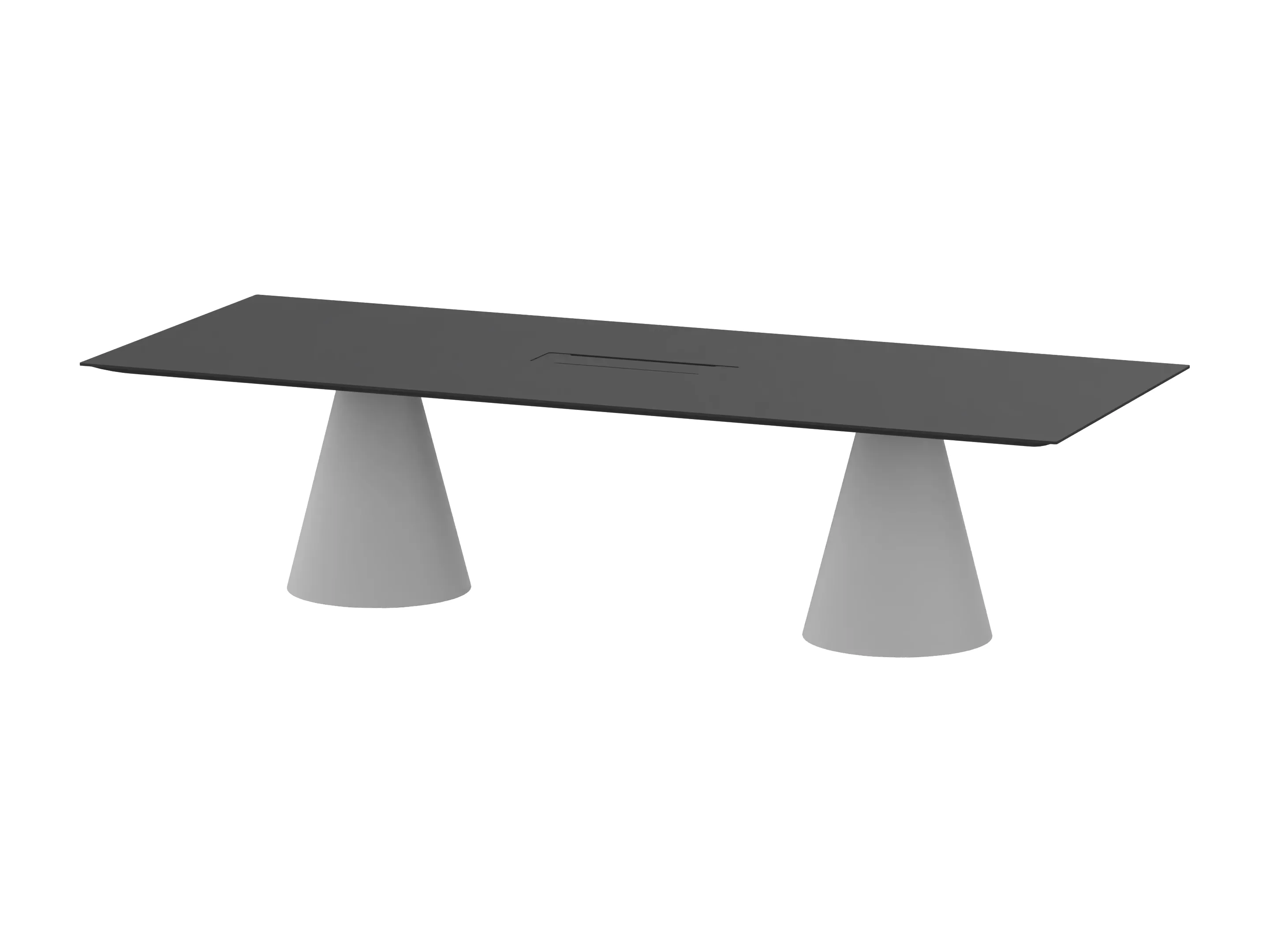 Vergadertafel met een hoogte van 740mm, voorzien van twee kolompoten, en onderframe met een verjongde afwerking. Bovenzijde is voorzien van een kabelgleuf van 42mm breed, onder de tafel is een kabelgoot voorzien.