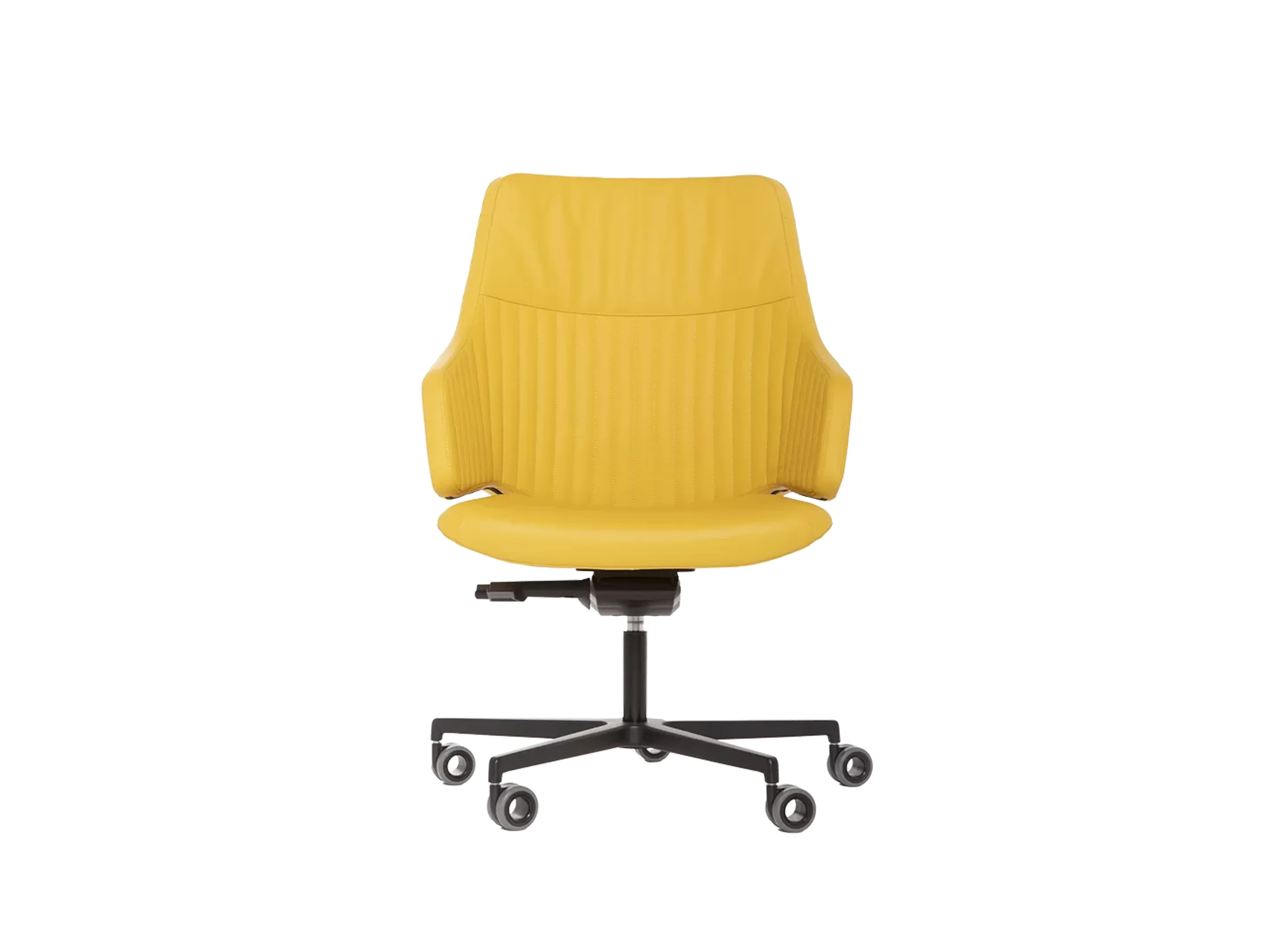 Directiestoel met een "standaard vlakke" bekleding, een hoge rug en een synchroonmechaniek met: zichthoogte verstelling, automatische gewichtsinstelling, blokkeerknop, zitdiepte verstelling, 5-teens kruis met 65mm wielen (standaard zwart)
